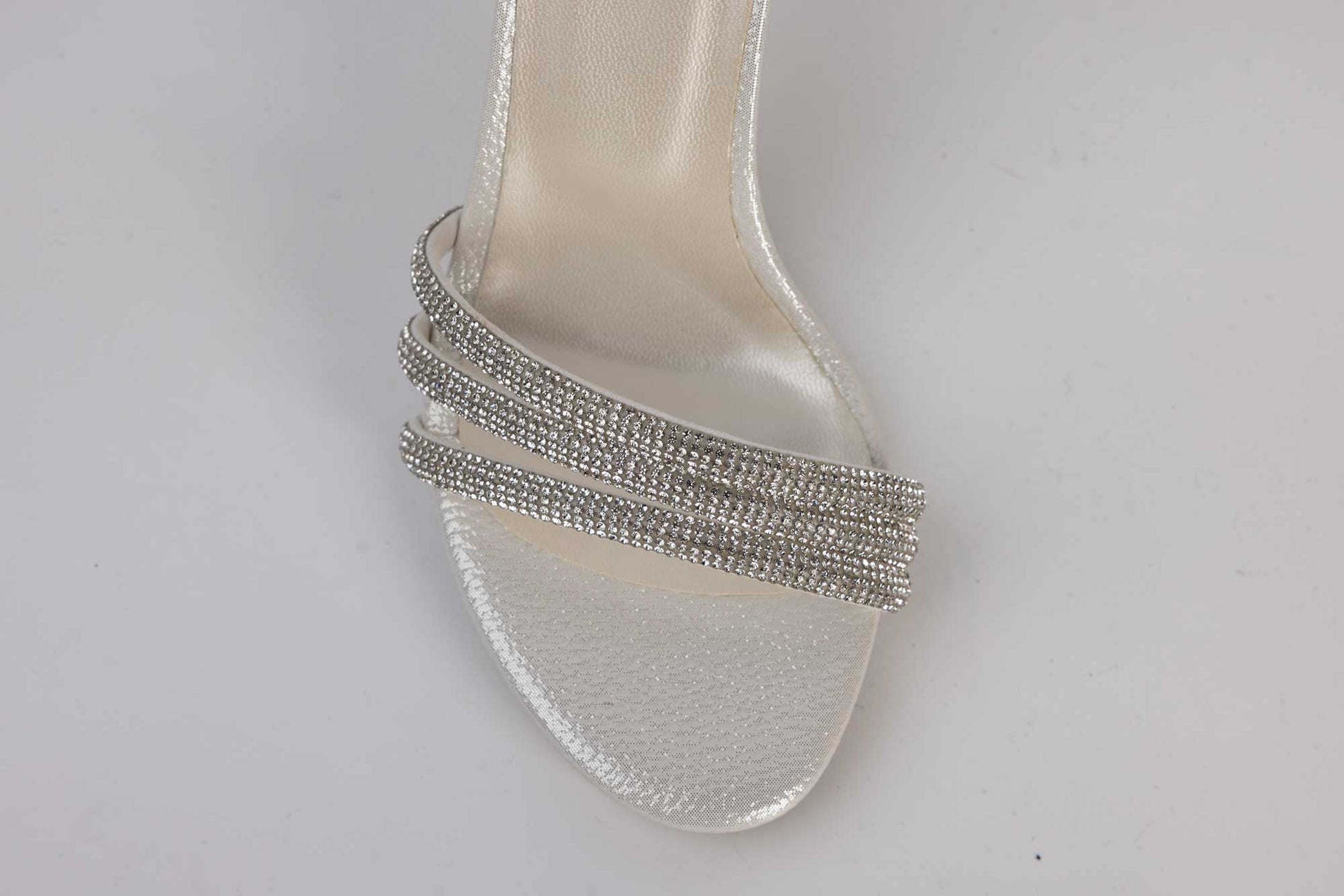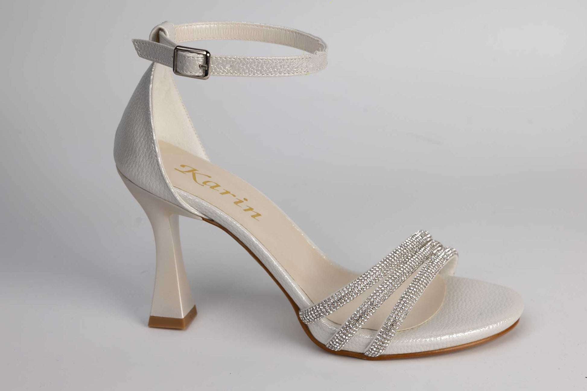 Sandale KARIN de dama din piele ecologica de calitate avand un toc evazat de 9 cm inaltime. Greutatea unui singur picior este 218 grame. Prinderea se face cu o bareta deasupra gleznei pentru o fixare mai buna a piciorului. Partea din fata este alcatuita din 3 barete cu cristale care face aceasta sandala sa fie una foarte eleganta si comoda.