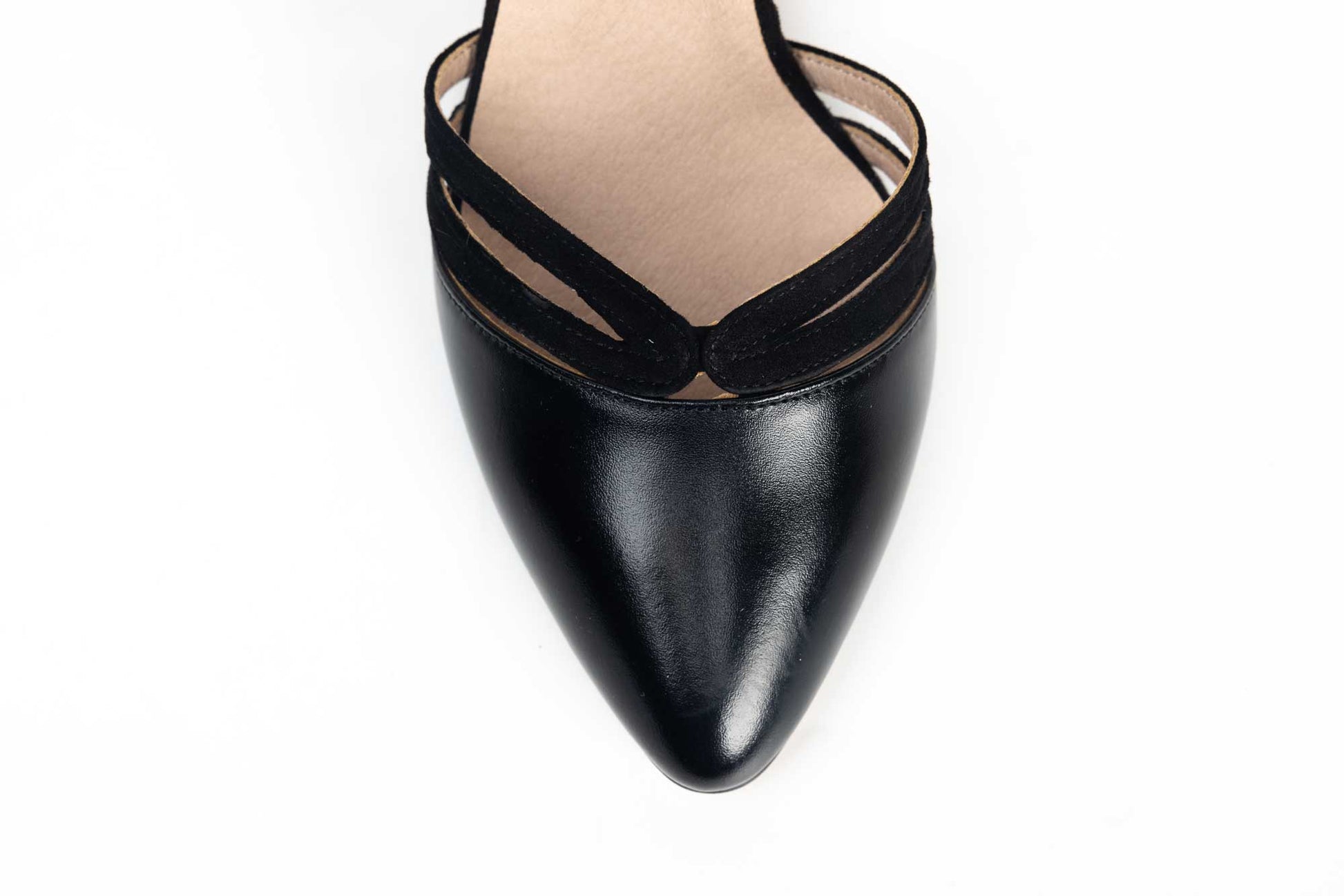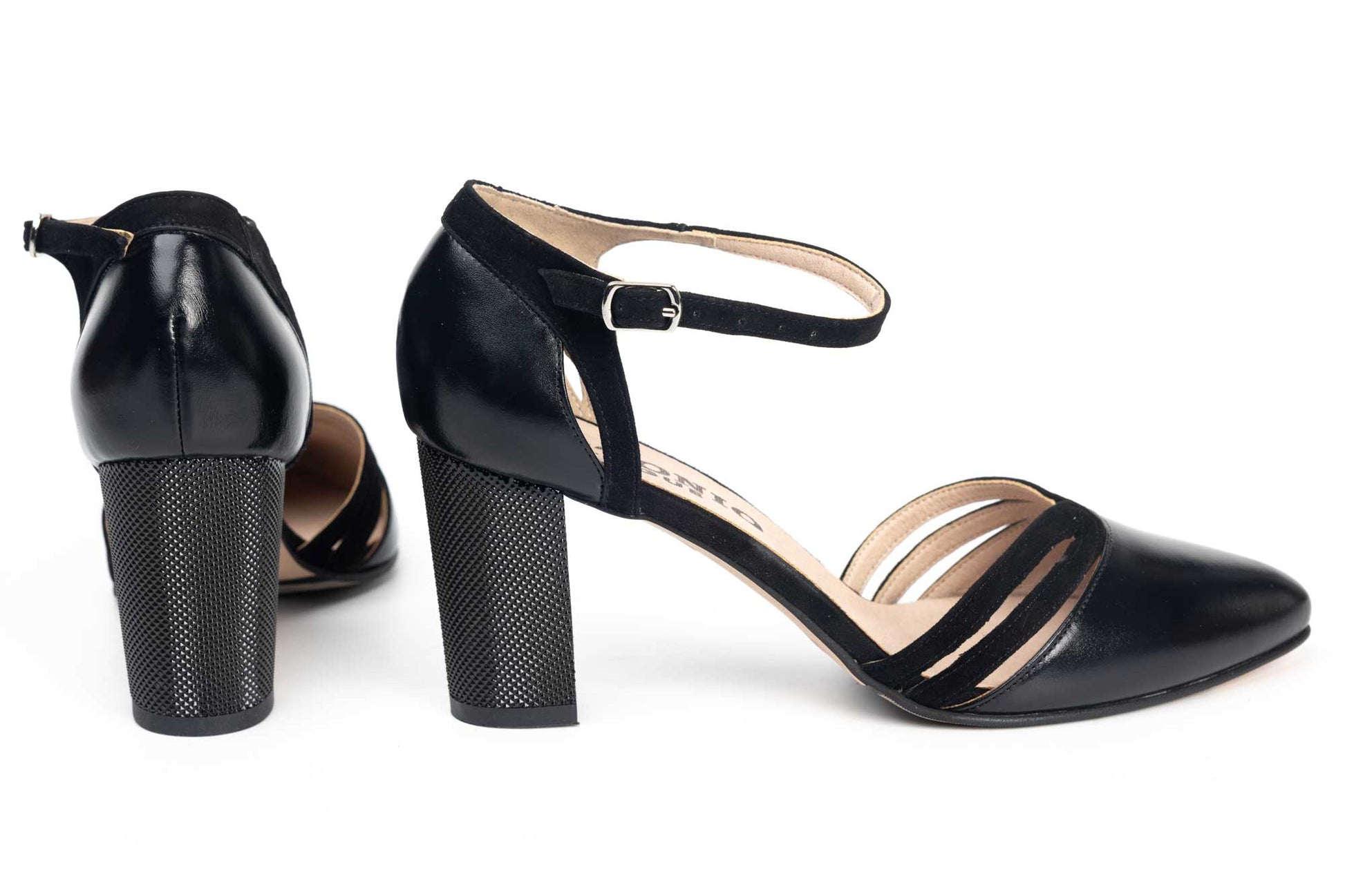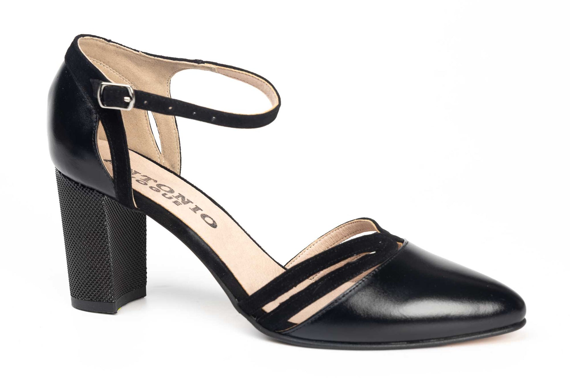 Pantofi ANTONIO de dama decupati din piele naturala cu prindere deasupra gleznei cu o bareta din piele avand tocul patrat de 7 cm. Greutatea unui singur picior este de 240 grame. Recomandat pentru doamne cu picior mai lat sau cu mont.