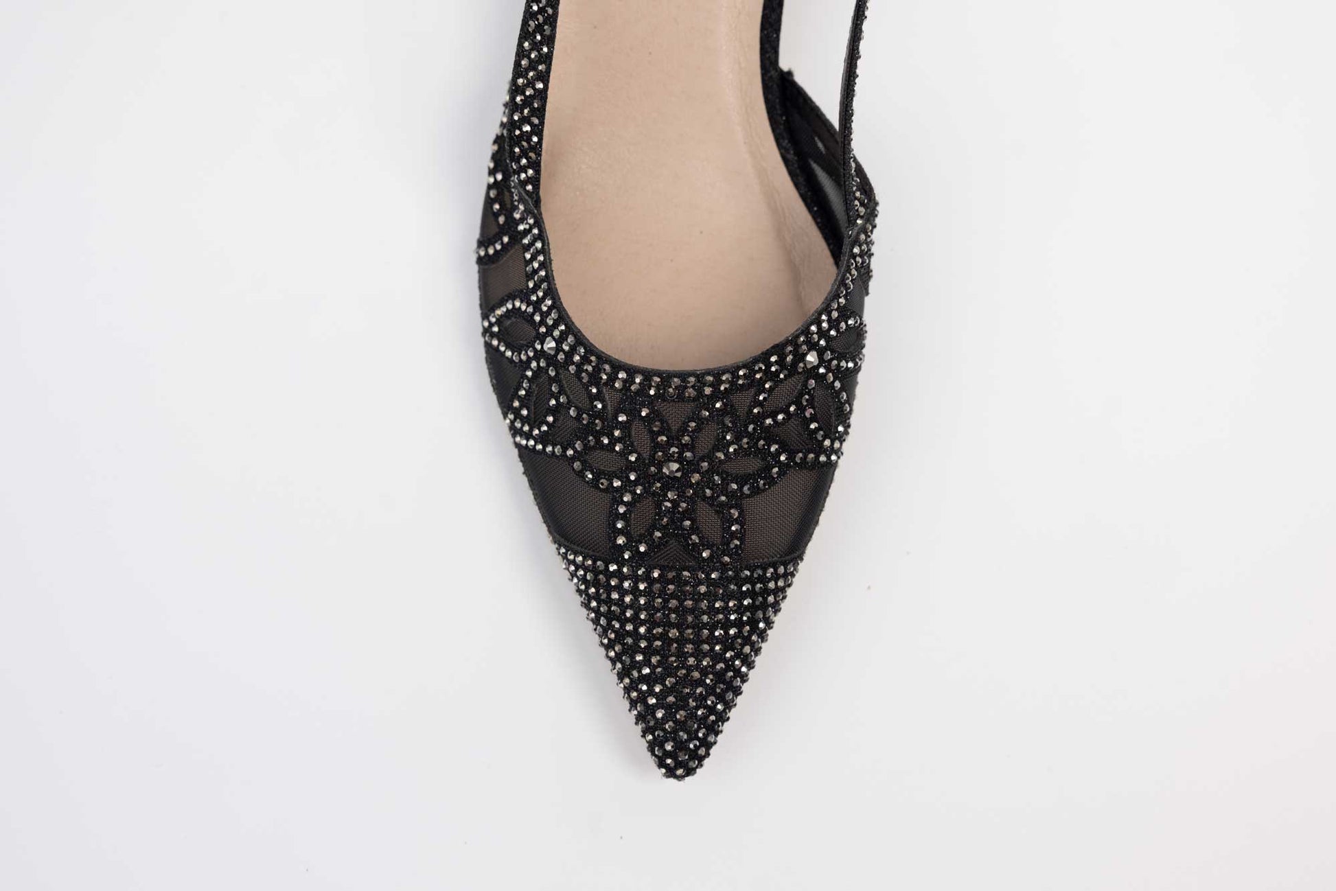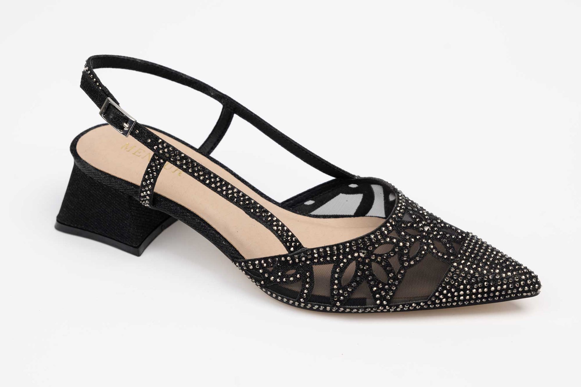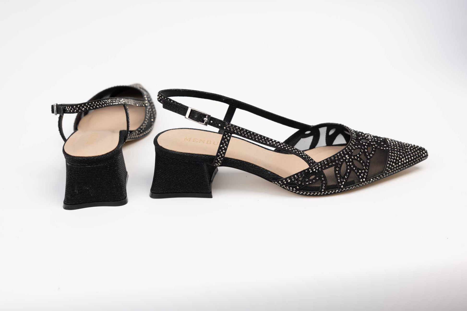 Pantofi MENBUR de dama din material sintetic cu decupaj lateral si in spate iar tocul este gros de 4 cm inaltime cu varful ascutit. Greutatea unui singur picior este de 245 grame. Pe varful pantofului sunt aplicate cristale negre care dau farmec acestui pantof comod si elegant.
