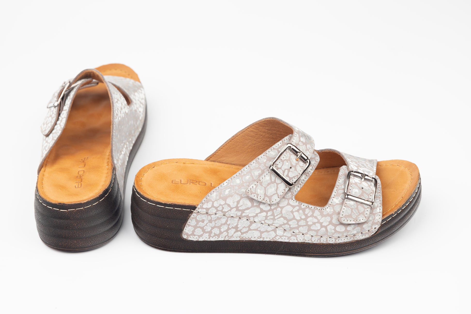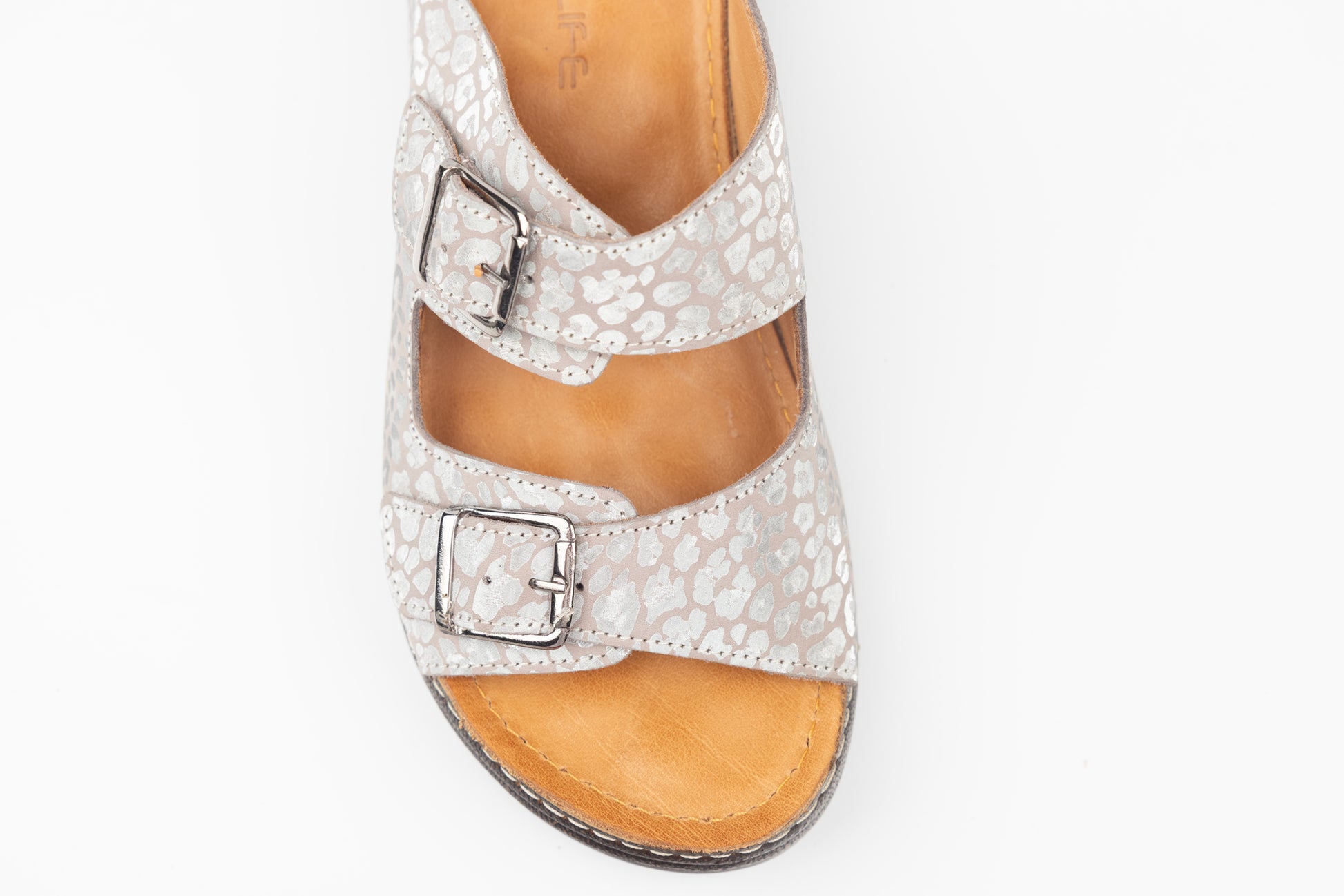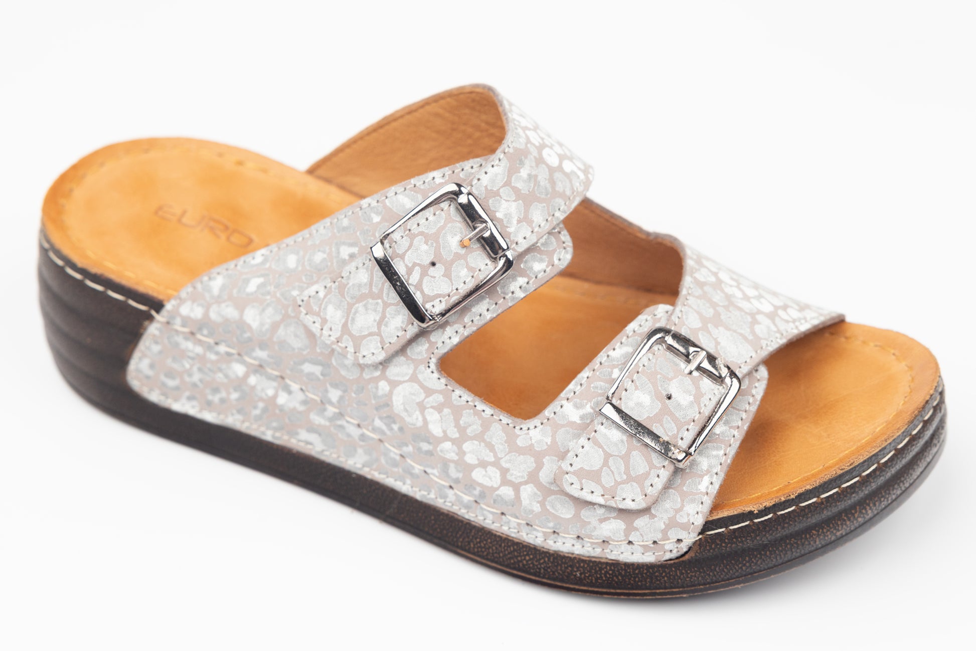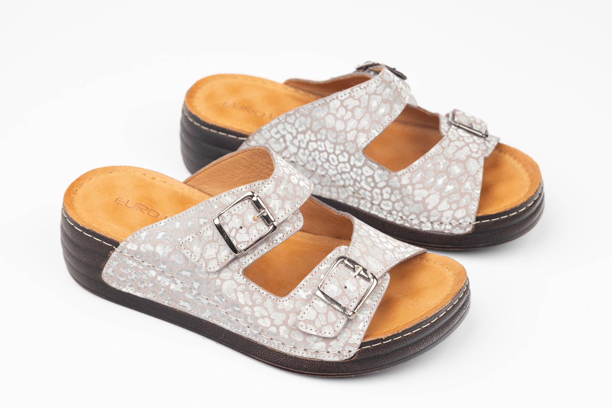 Șlapi dama LSD din piele naturala cu talpa groasa ortopedica captusite la interior cu piele naturala. Inclinatia lina a piciorului in aceste sandale face mult mai comoda purtarea lor un timp indelungat fiind recomandate chiar si pentru picioare cu mont pentru ca le acopera in intregime. Greutatea unui singur picior este de 150 grame. Mărimi de la 36 pana la 42.