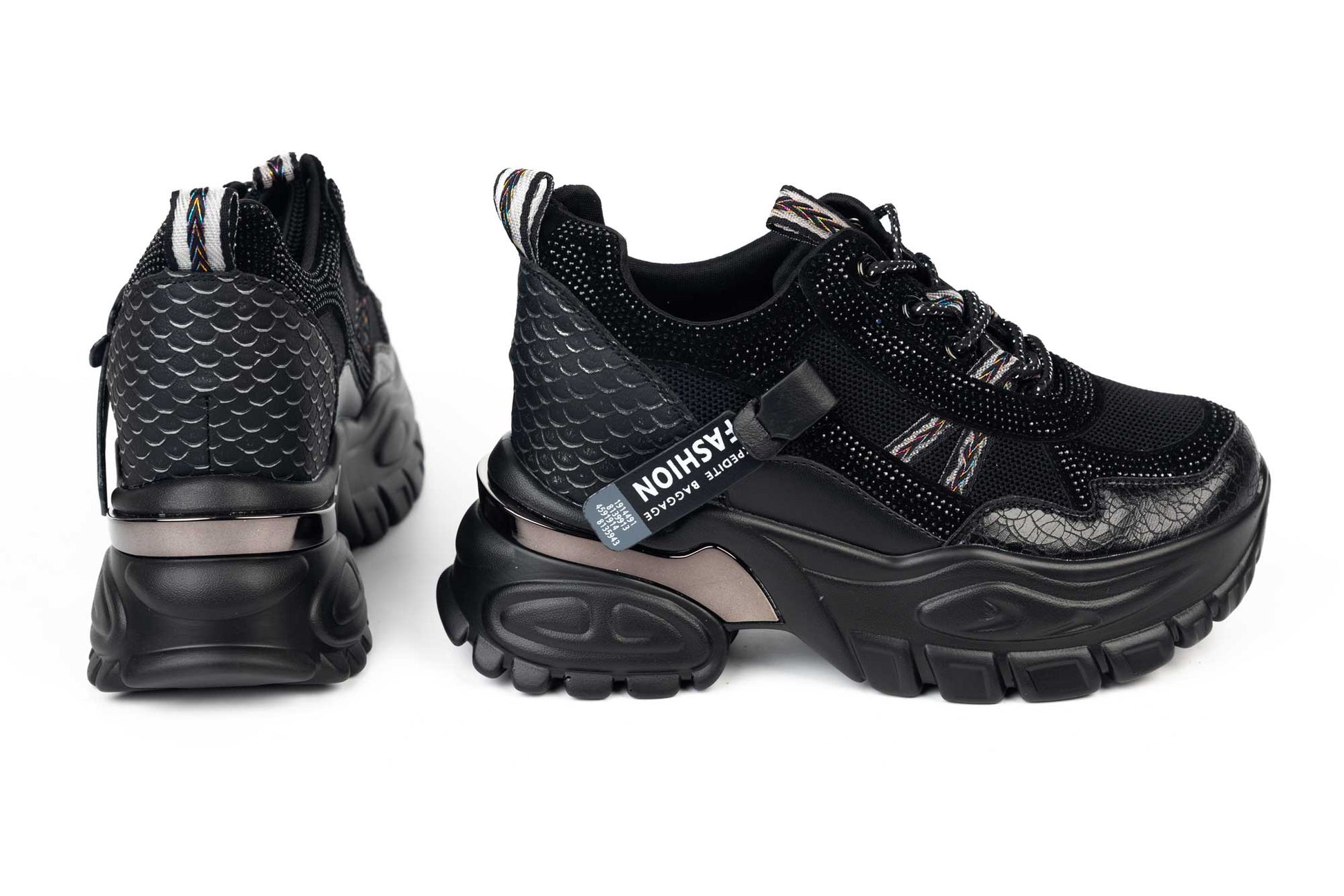 Adidasi dama Mei din piele ecologică cu talpa groasa de 5 cm înălțime care se leagă cu siret elastic având vârful rotunjit. Greutatea unui singur picior este de 290 grame.