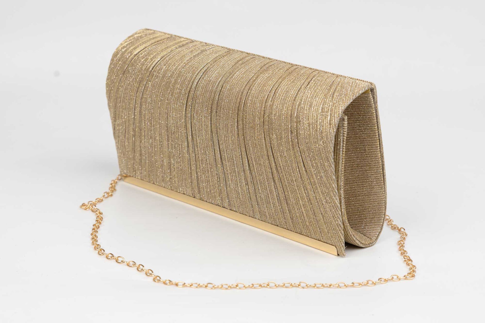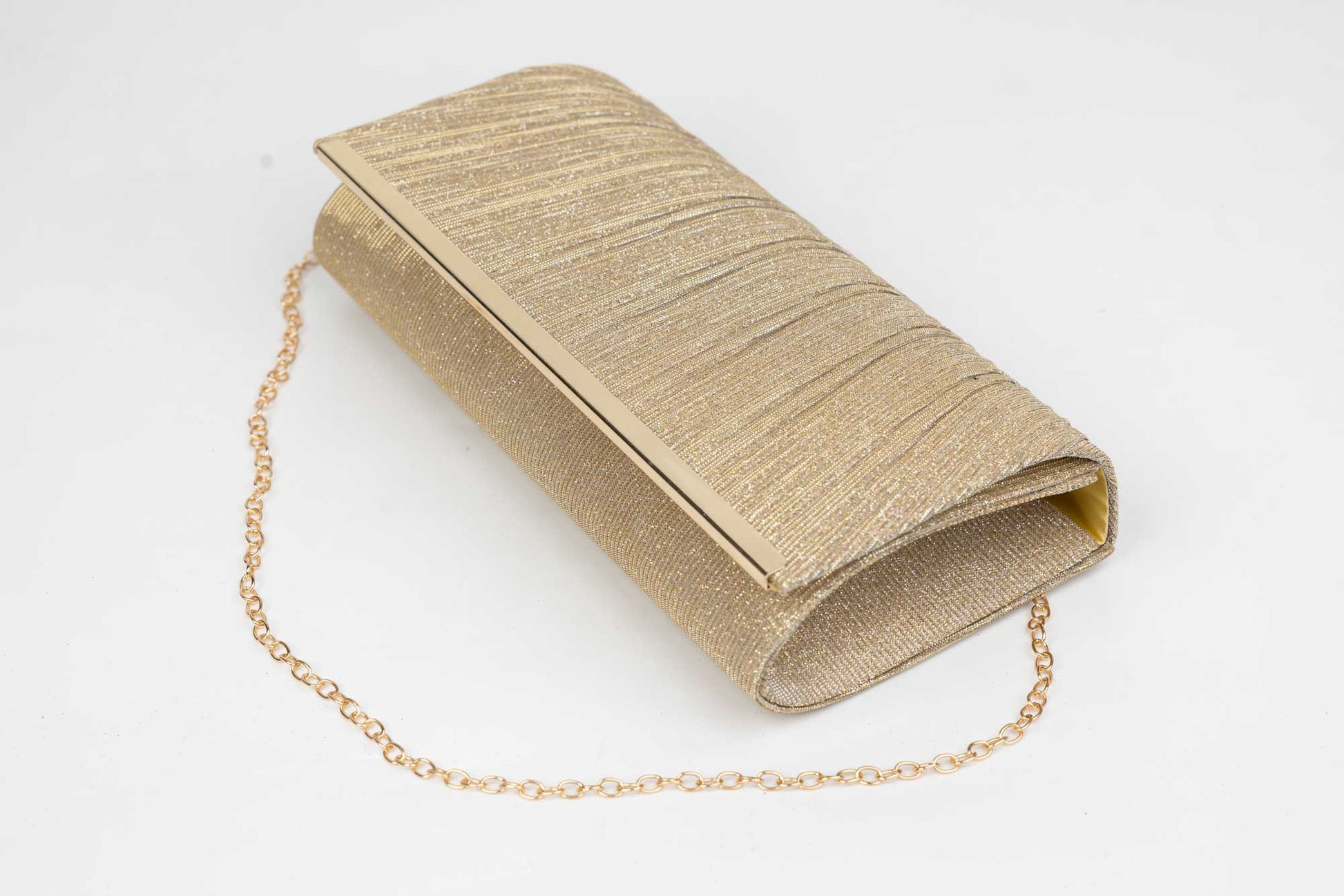 Un plic de dama de marime 26-13 cm din material auriu avand in dotare o curelusa lant metalica detasabila. Interiorul este unicameral (1 compartiment) si este potrivit si incapator pentru un telefon sau cosmetice. Inchiderea se face cu o clapeta metalica cu magnet in partea laterala a plicului.