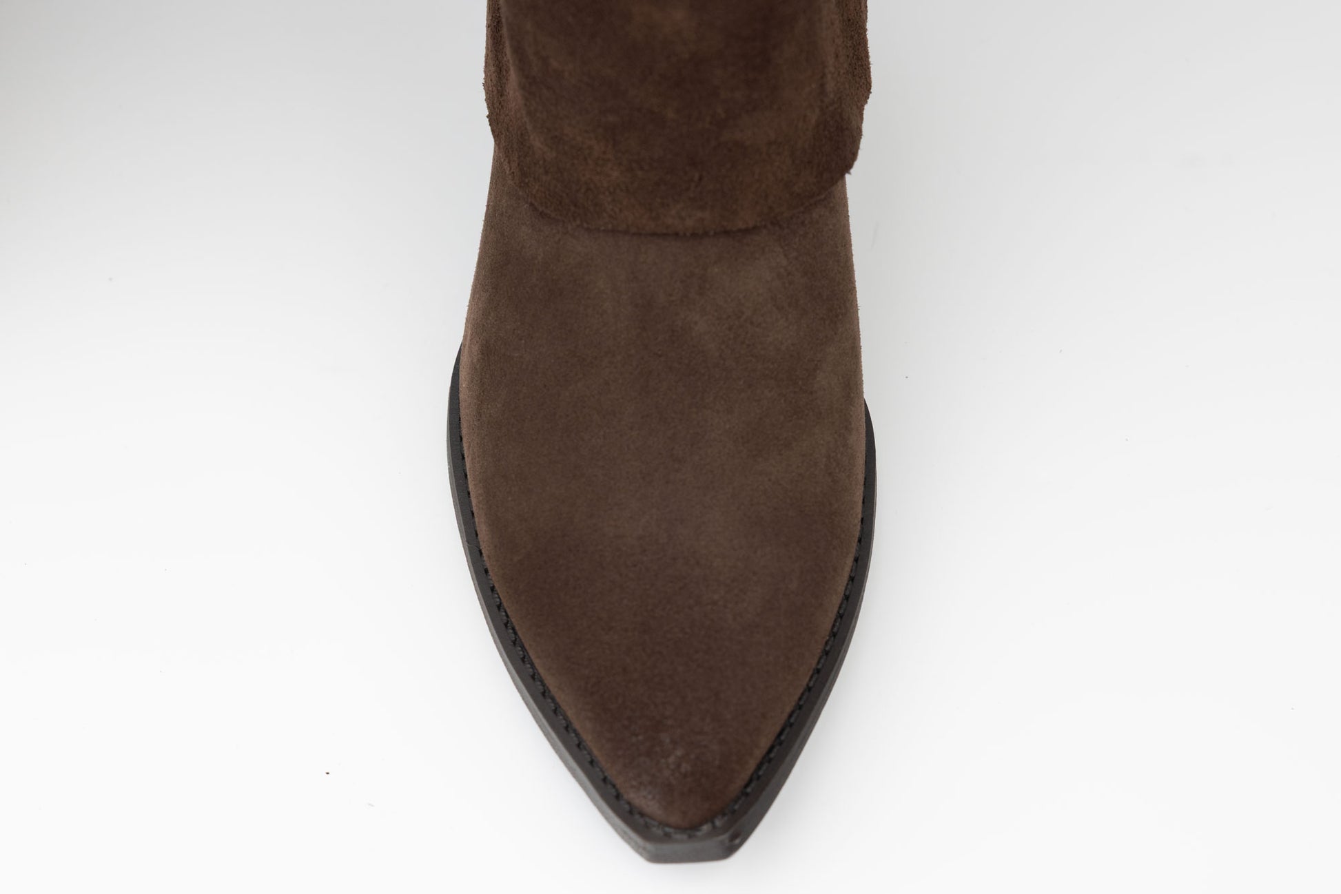 Cizme ANNA VIOTI de dama din piele intoarsa naturala cu toc pătrat de ciocata înalt de 5,5 cm si varf ascutit gen ciocata imblanita interior, fără fermoar lateral gen tubulară.