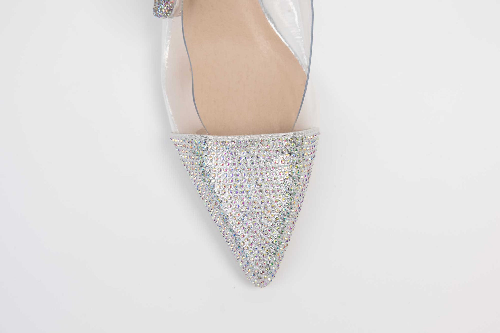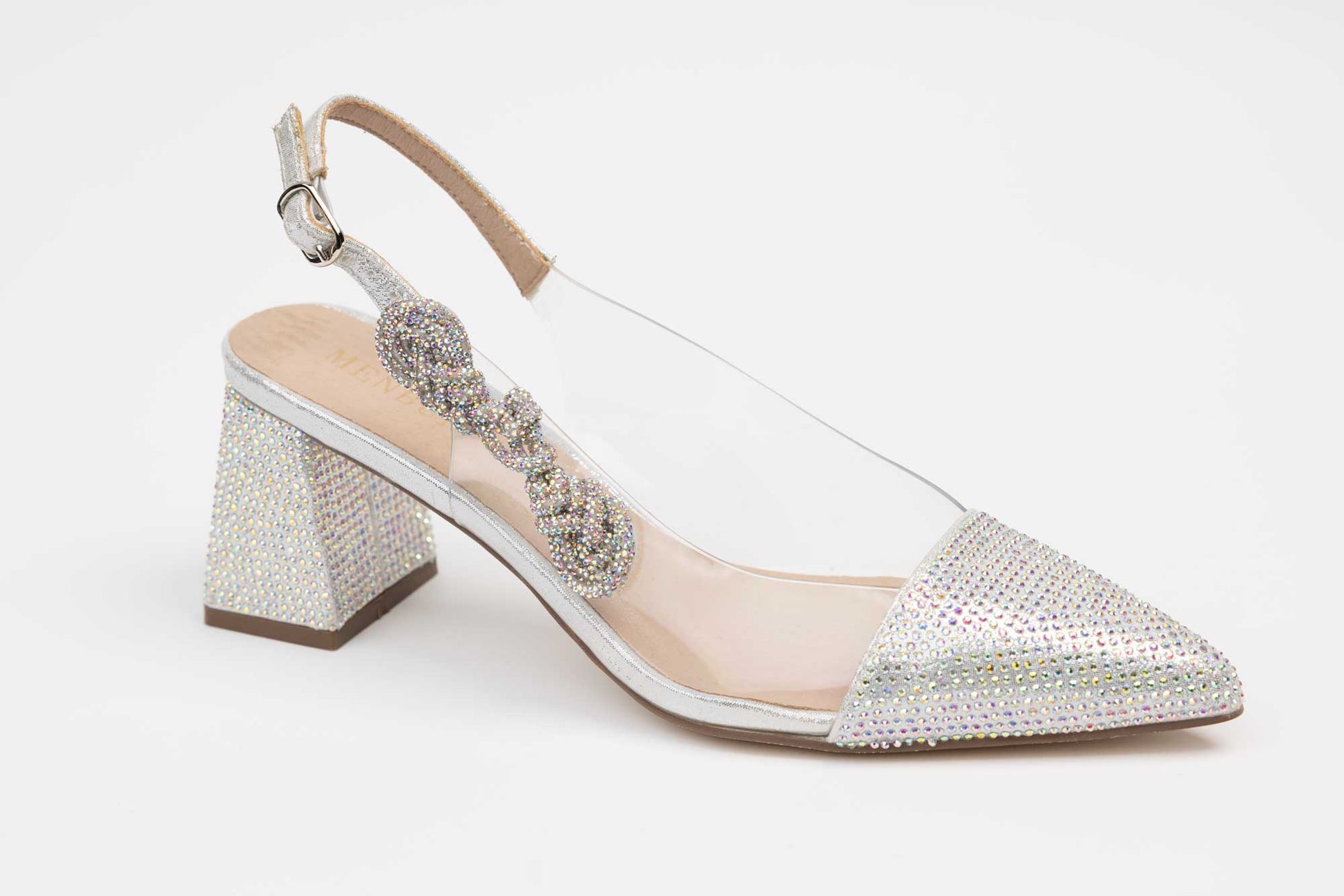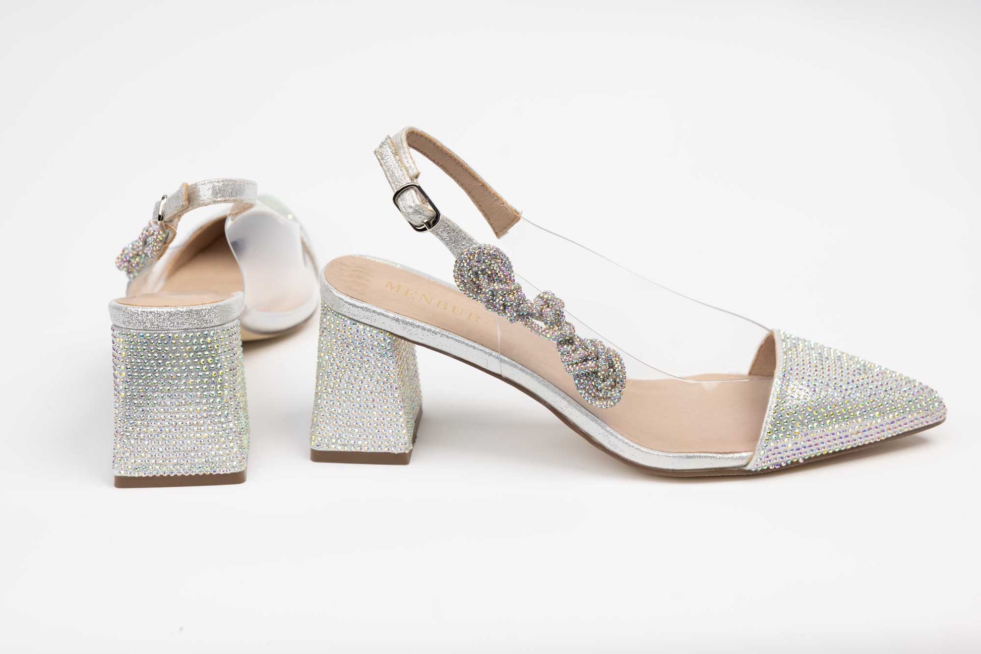 Pantofi MENBUR de dama din material sintetic cu decupaj lateral si in spate iar tocul este gros de 6 cm inaltime cu varful ascutit. Greutatea unui singur picior este de 245 grame. Pe varful pantofului sunt aplicate cristale negre care dau farmec acestui pantof comod si elegant.