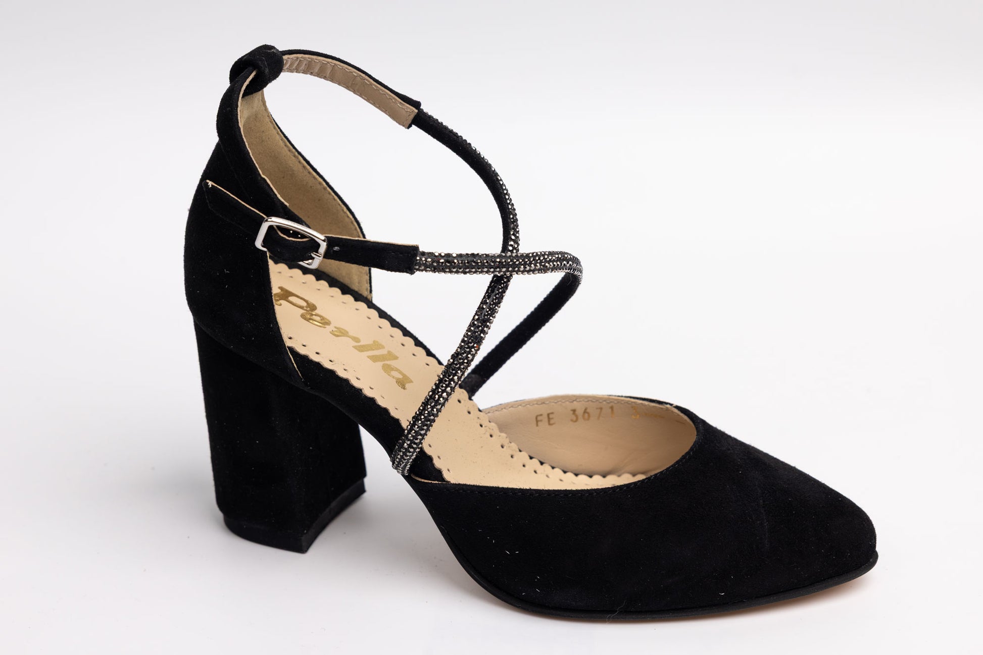 Pantofi damă PERLA piele naturală întoarsă cu toc patrat înalt de 5 cm pe calapod normal .Baretutele sunt decorate cu cristale care ofera un design aparte. Acest pantof din piele are interiorul căptușit cu piele naturală oferind maxim de confort piciorului.