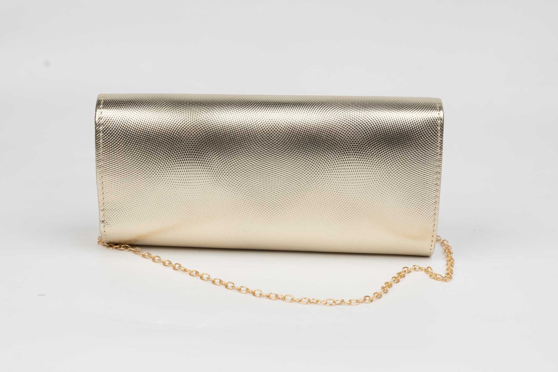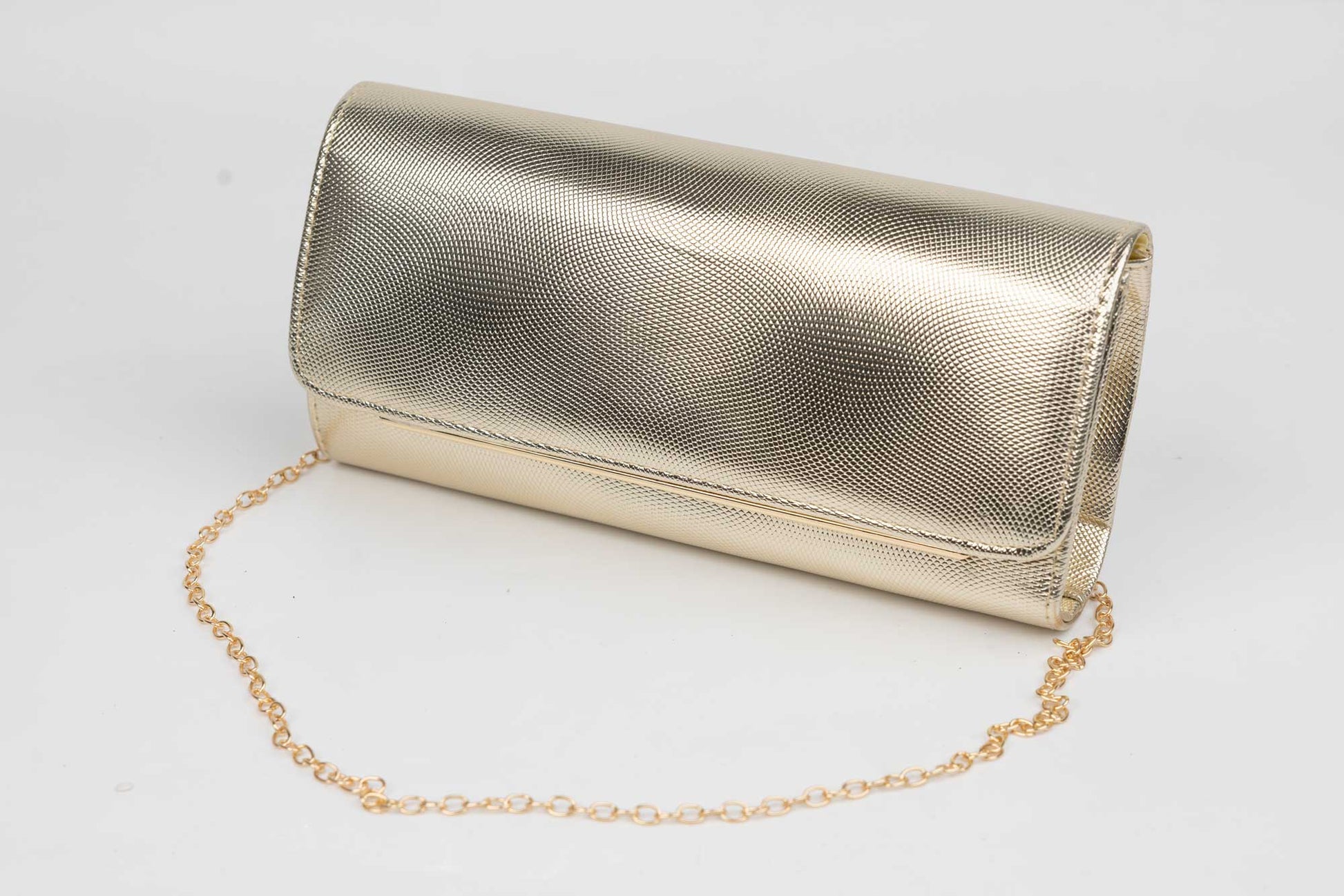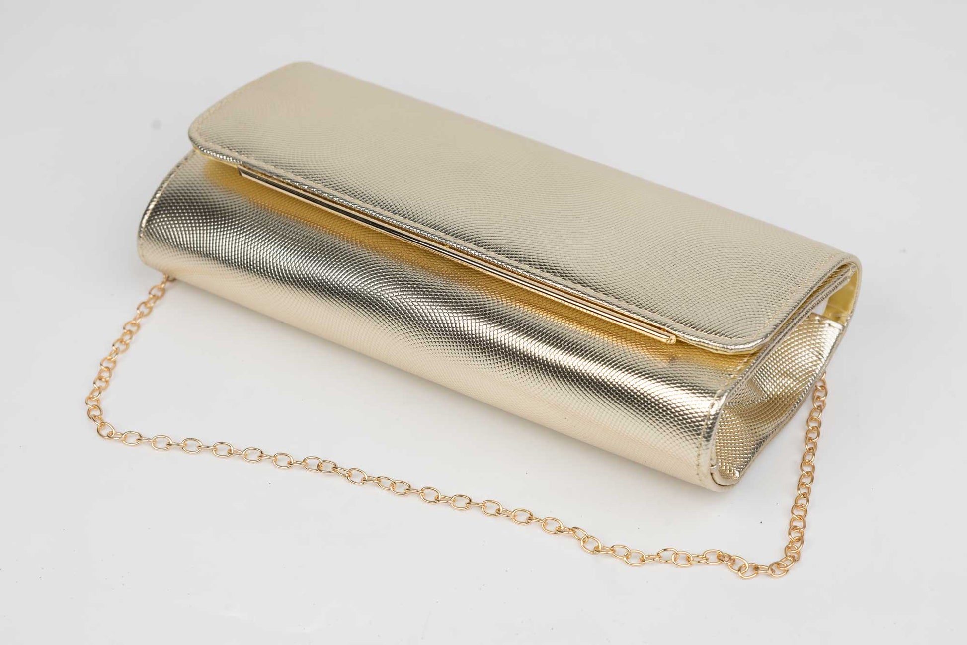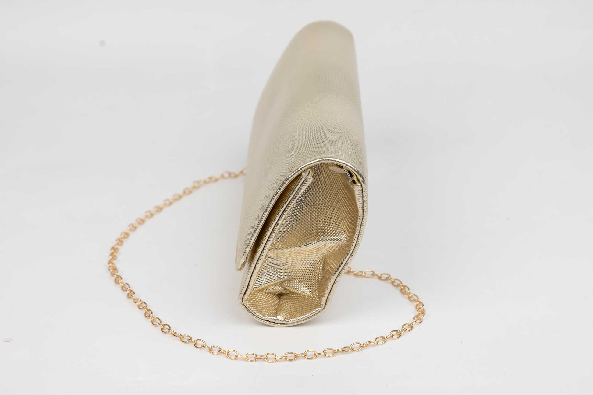 Un plic de dama auriu de marime 24-12 cm cu elemente sclipitoare aurii avand in dotare o curelusa lant metalice detasabile. Interiorul este unicameral (1 compartiment) si este potrivit si incapator pentru un telefon sau cosmetice. Inchiderea se face cu o clapeta metalica cu magnet in partea laterala a plicului.