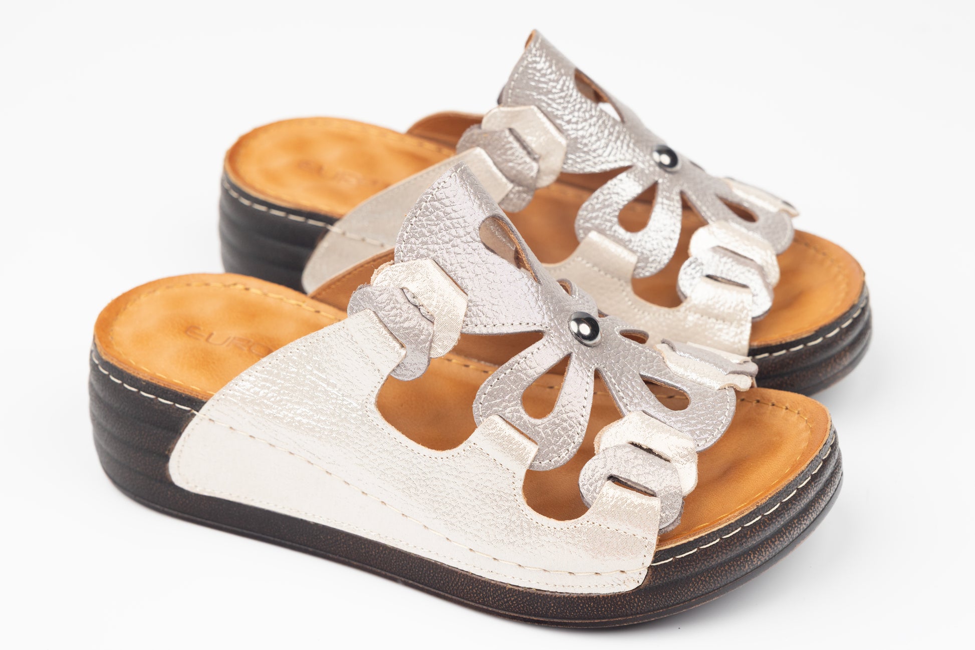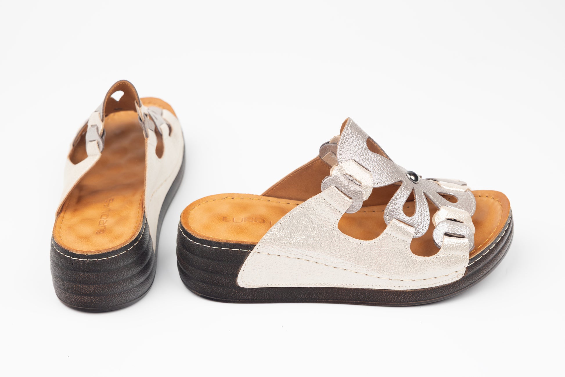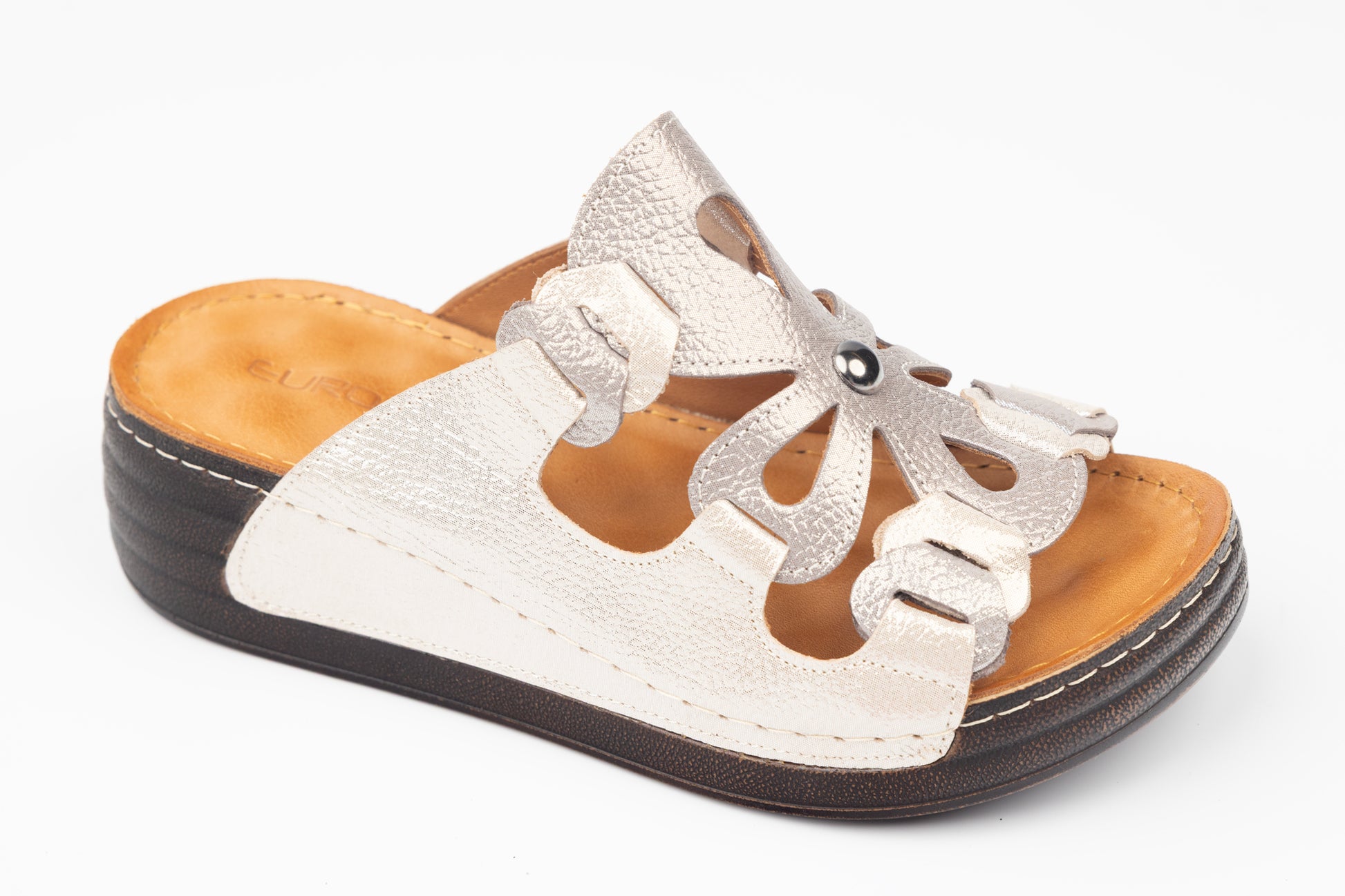 Șlapi dama LSD din piele naturala cu talpa groasa ortopedica captusite la interior cu piele naturala. Inclinatia lina a piciorului in aceste sandale face mult mai comoda purtarea lor un timp indelungat fiind recomandate chiar si pentru picioare cu mont pentru ca le acopera in intregime. Greutatea unui singur picior este de 150 grame. Mărimi de la 36 pana la 42.