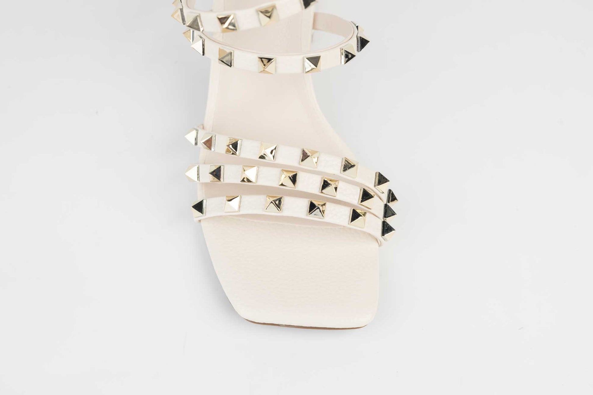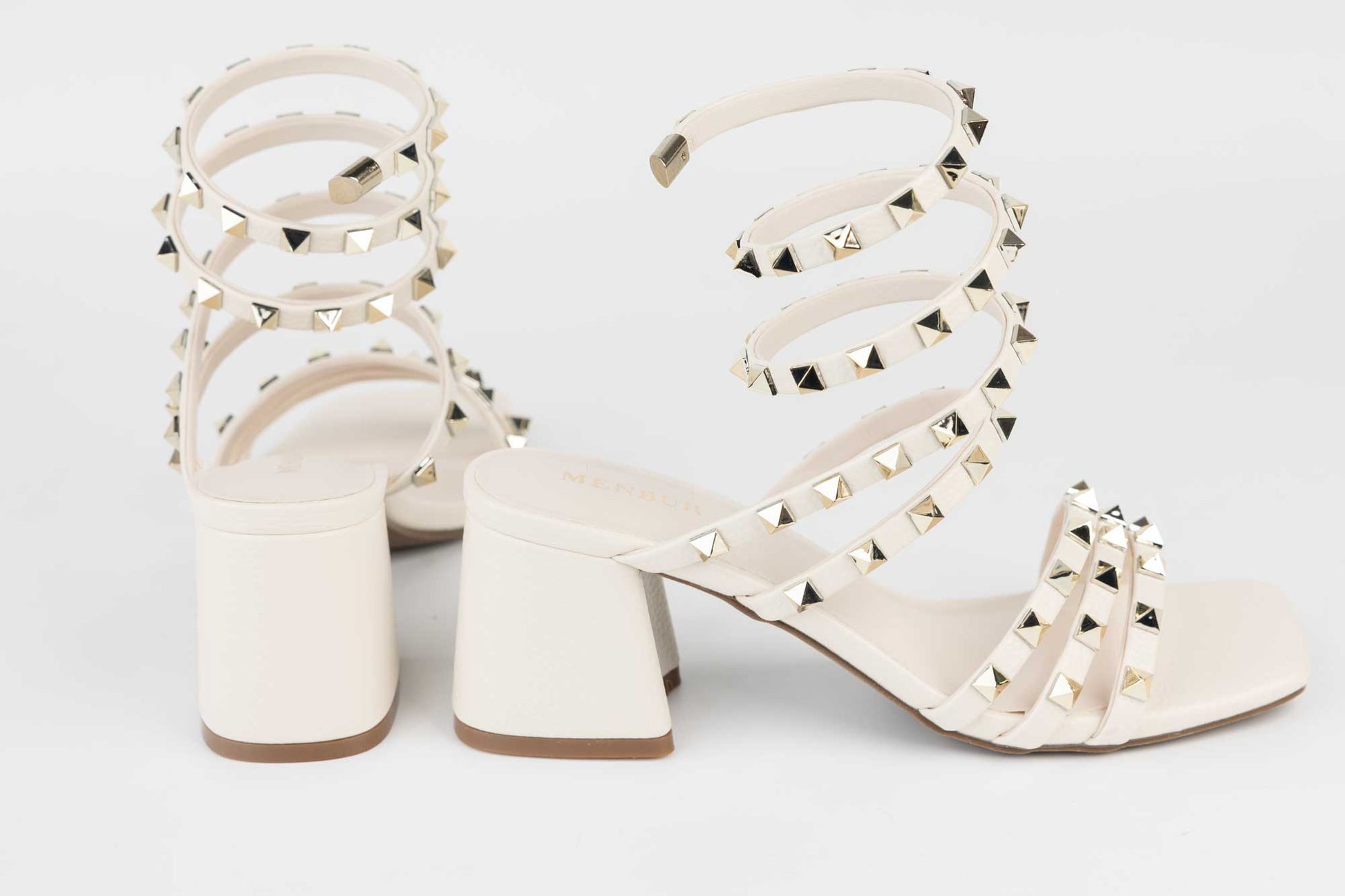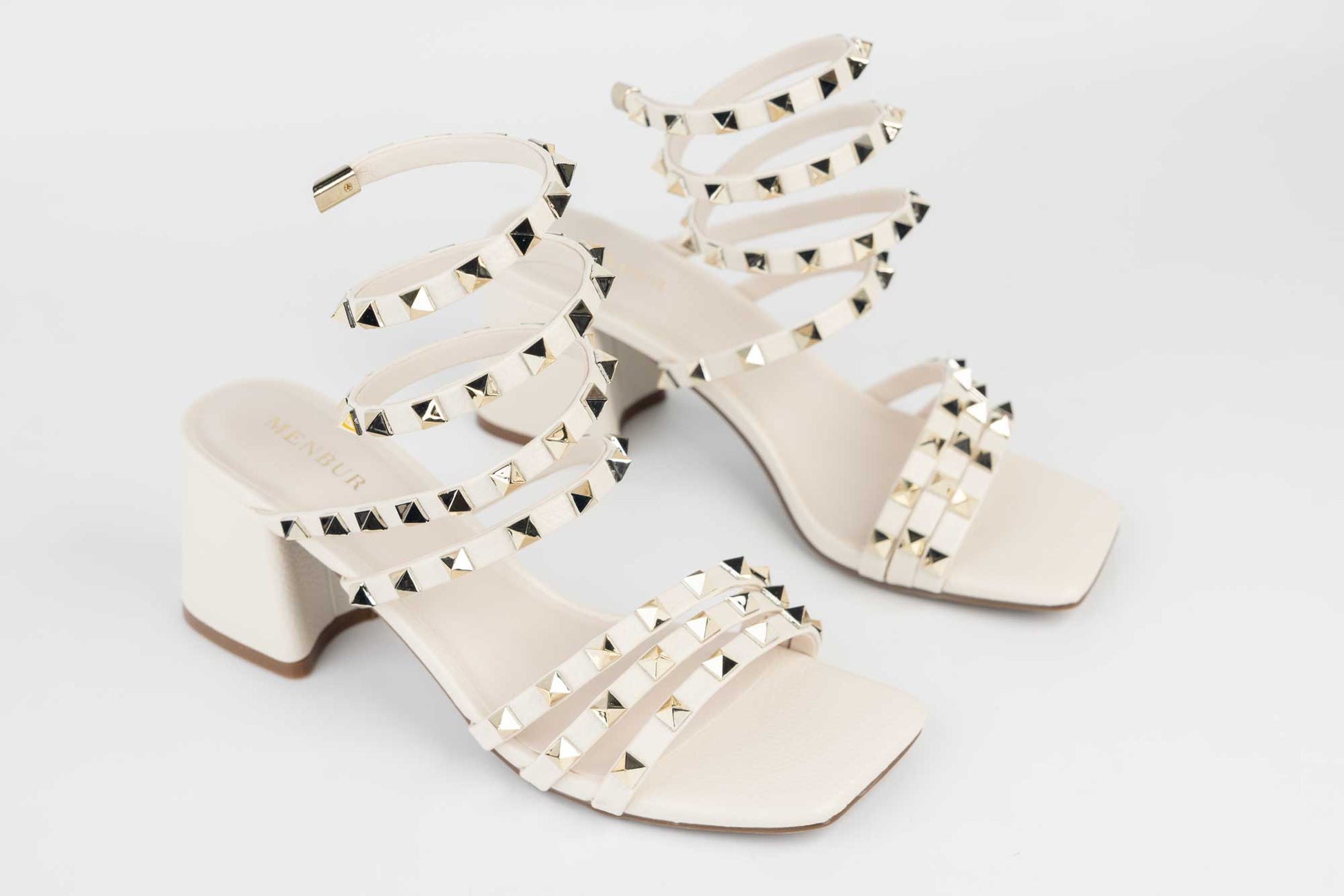 Sandale dama din piele eco MENBUR accesorizat cu tinte metalice pe baretele subtiri inclusiv pe cea in forma de arc avand un toc patrat de 6 cm inaltime. Talpa este de forma patrata si are 280 grame masurati la un singur picior. Made in Spain.