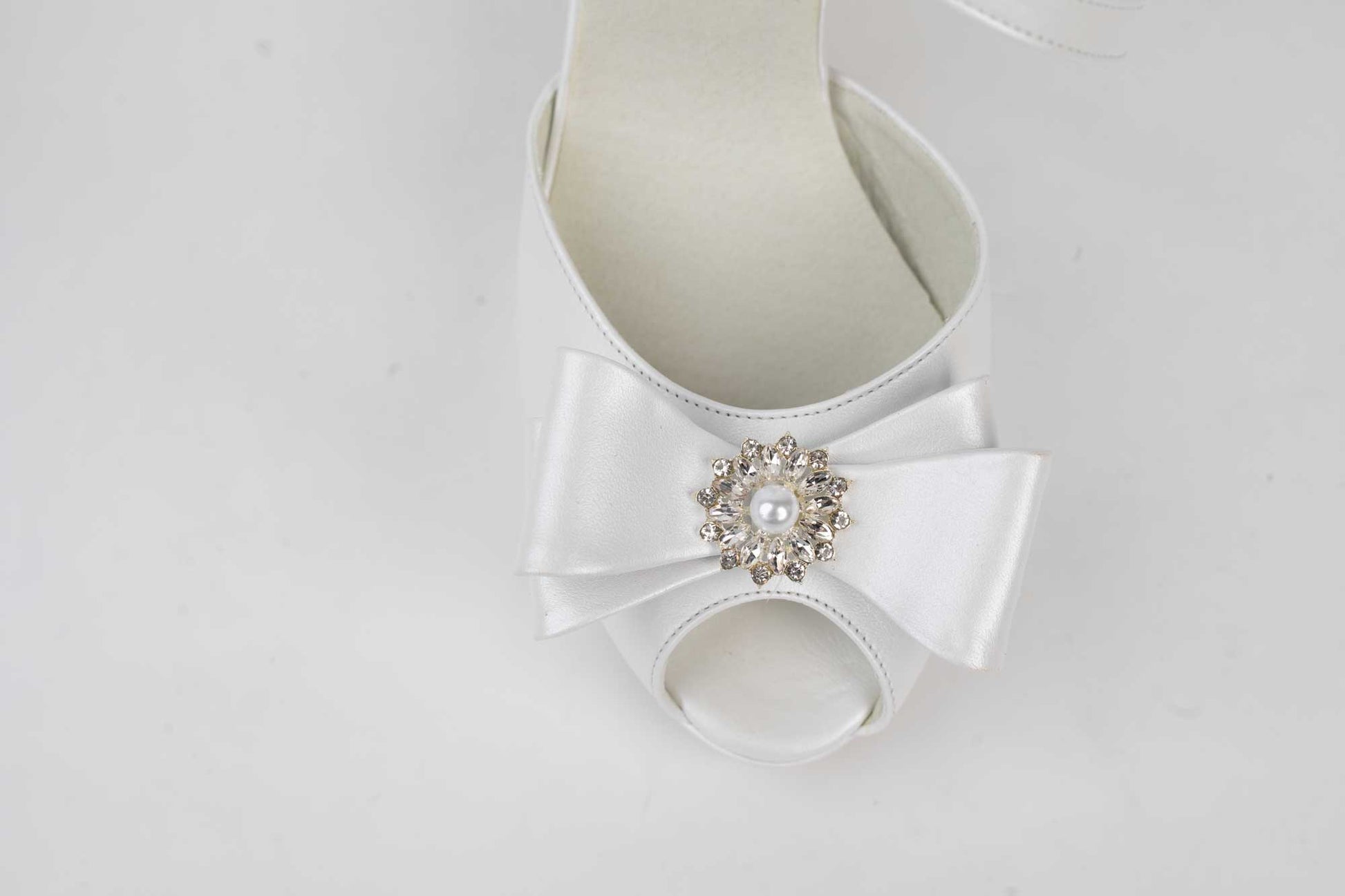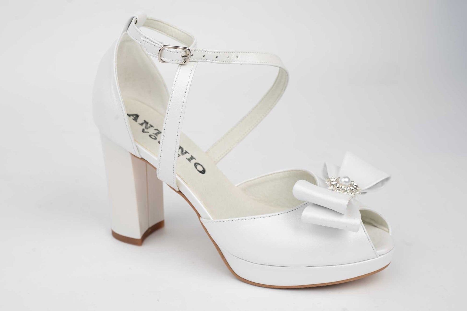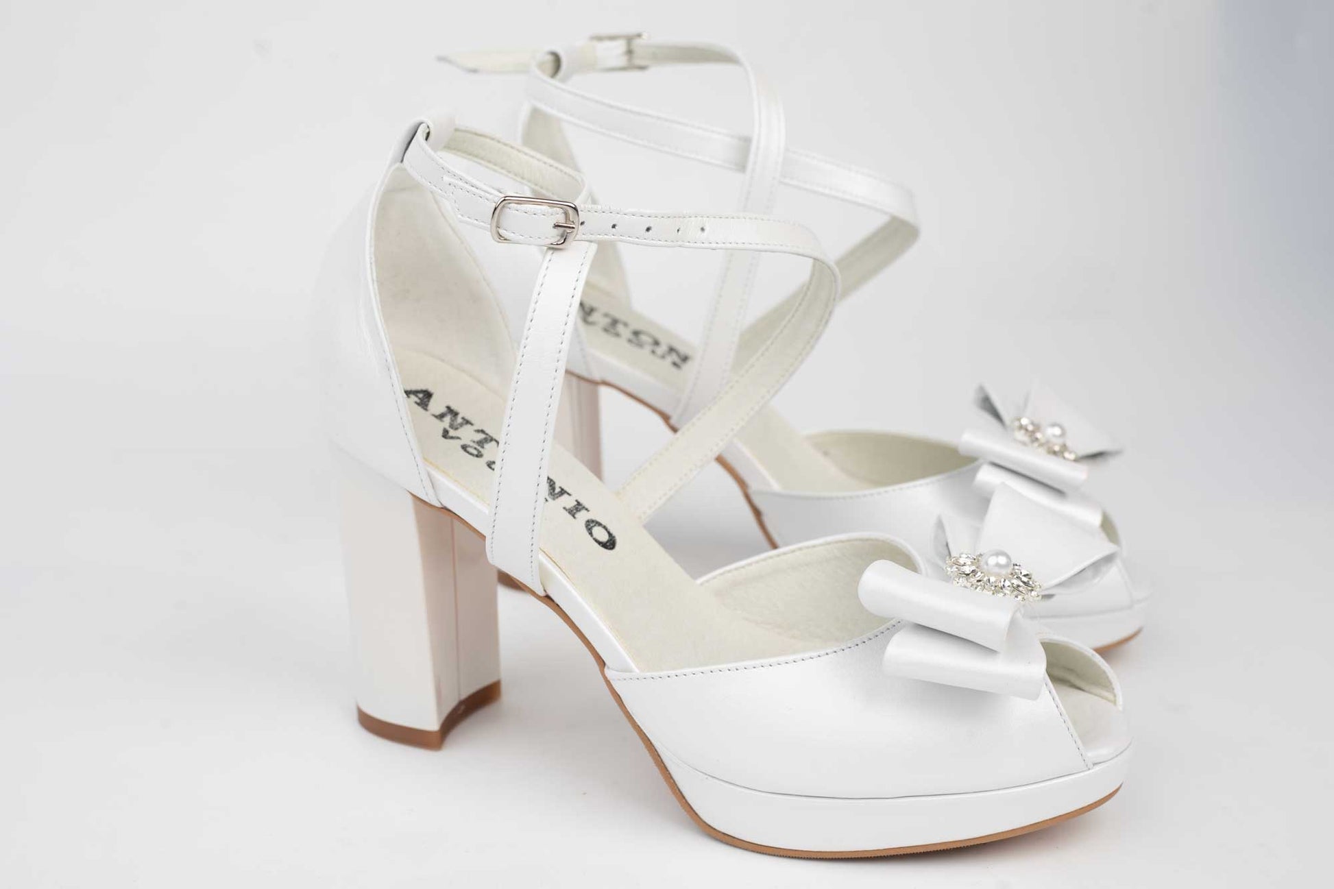 Sandale mireasa ANTONIO din piele naturală cu toc gros de 10 cm înălțime foarte stabil la mers având la partea din fata o platforma de 1 cm înălțime care conferă o înclinație lina și confortabila piciorului. Prinderea la glezna se face cu o bareta subtire dispusa in X intr-o catarama fina. Pe varf are montat un accesoriu din piele si o floricica metalica cu cristale superbe. Sandala se vinde atat cu accesoriu dar si fara el atasat. Marimi de la 34 pana la 41.