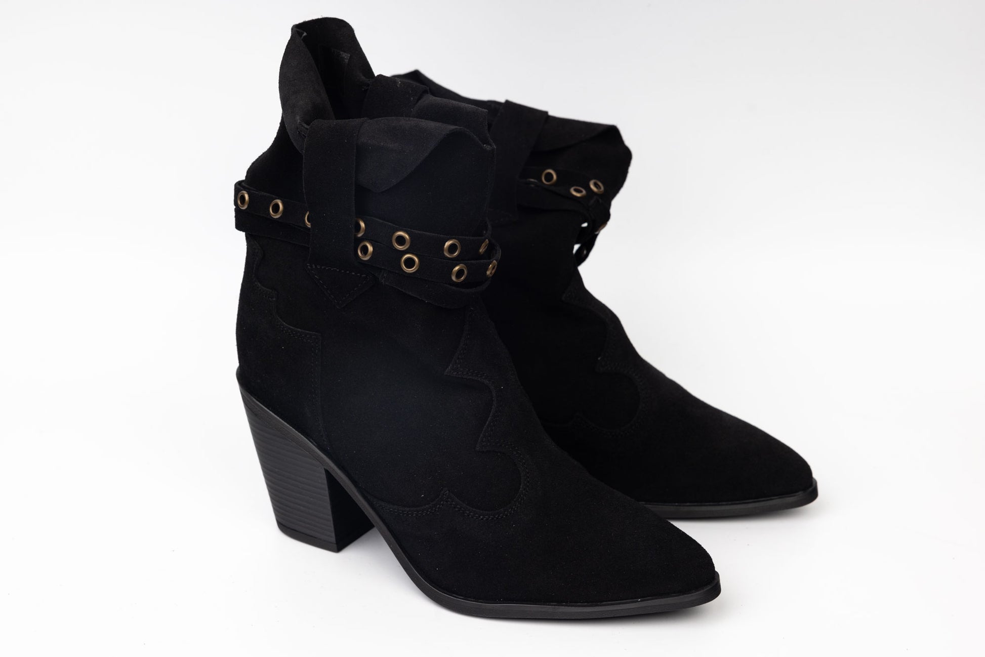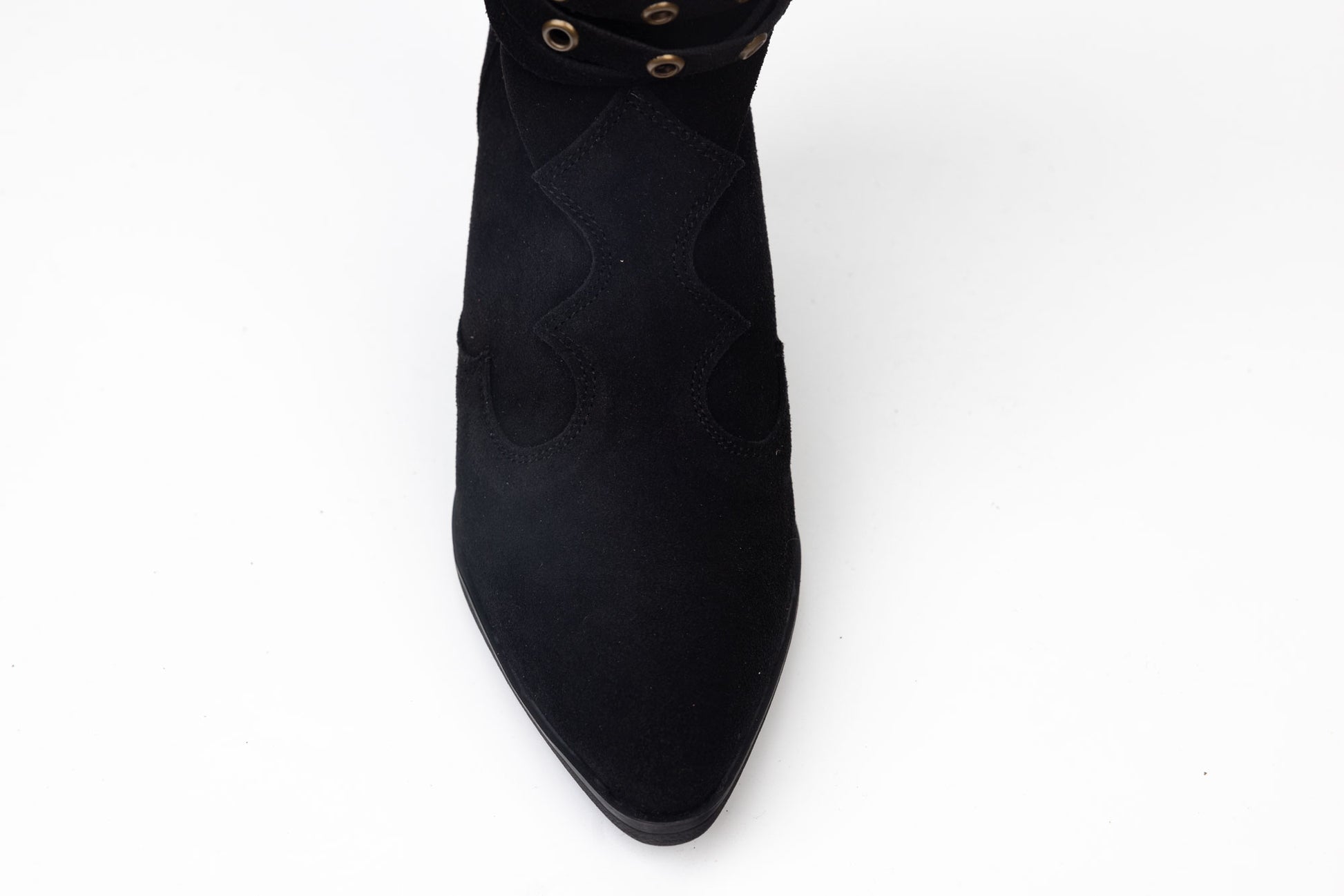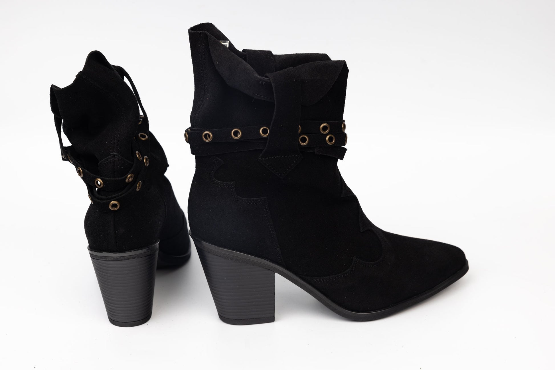 Ghete PERLA de dama din piele intoarsa naturala fără fermoar lateral,cu o curelusa la glezna si talpa cu toc gros de 7,5 cm cu varful ascutit,comode si usoare. Greutatea unui singur picior este de 340 grame.