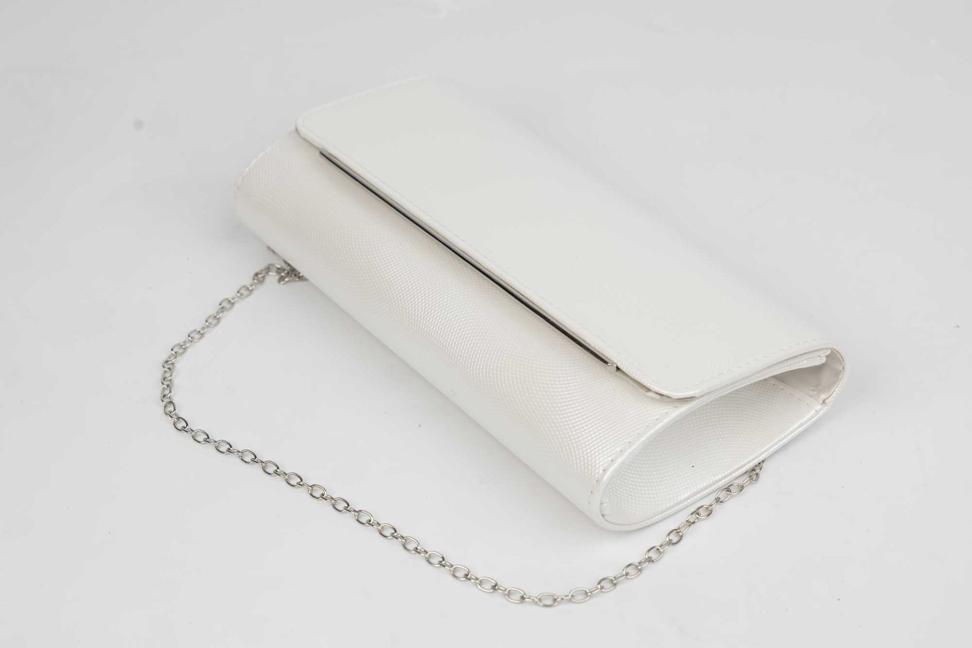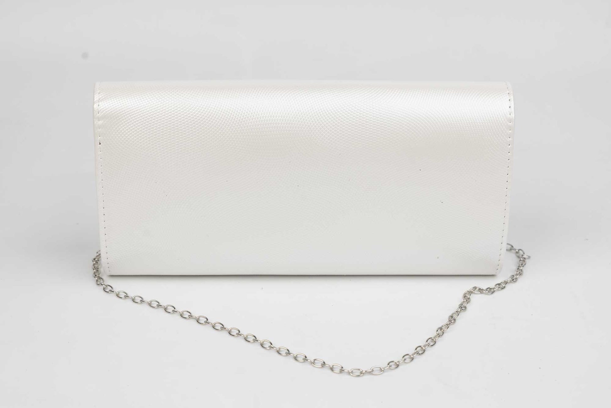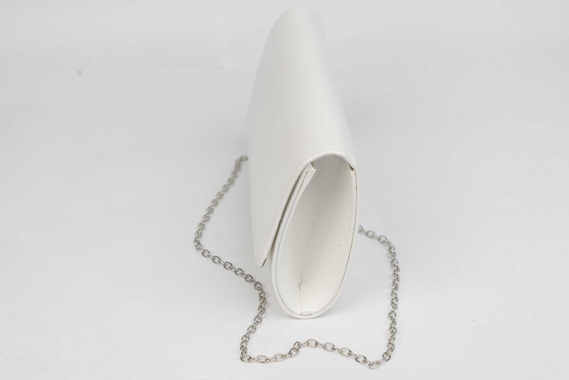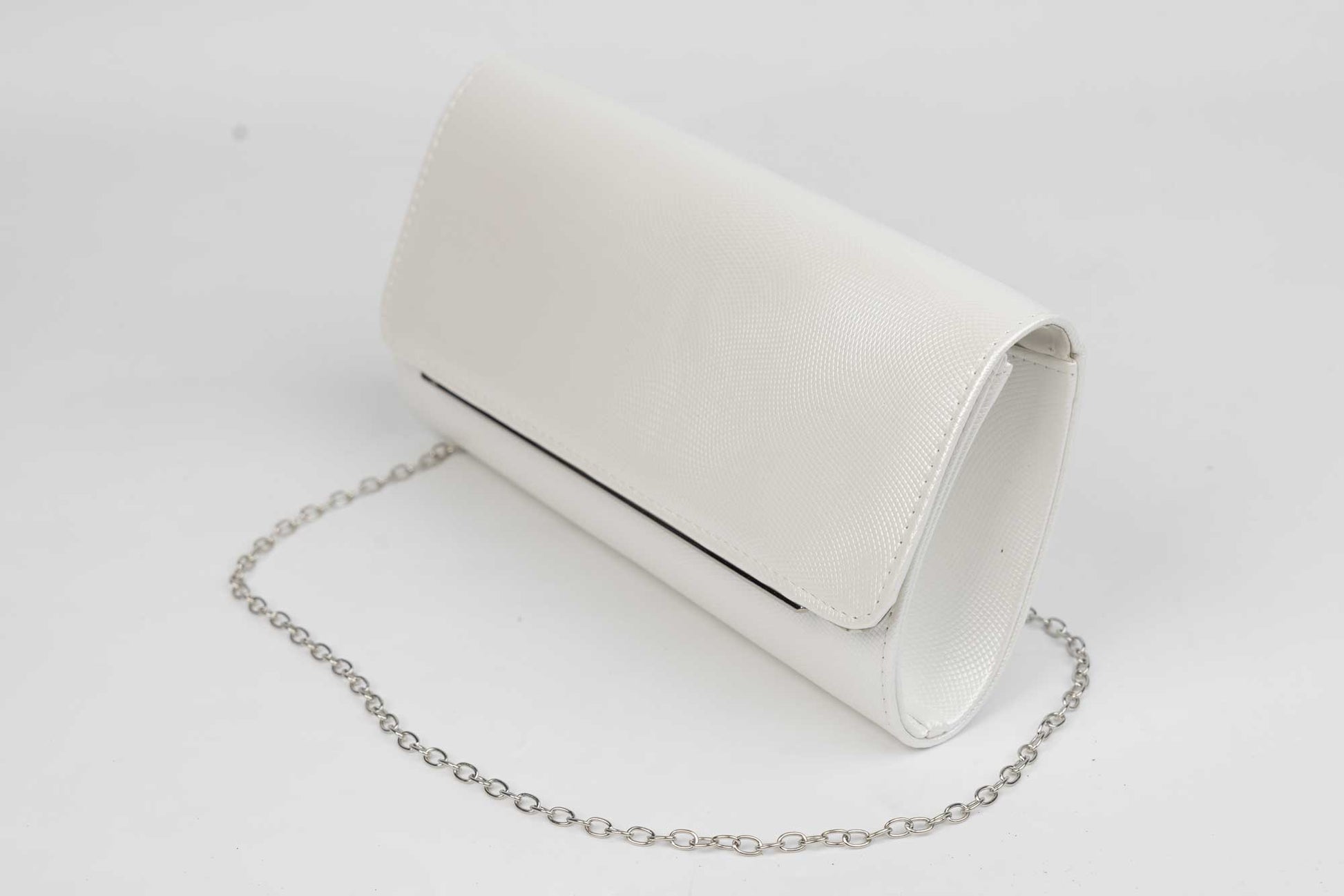 Un plic de dama alb de marime 24-12 cm cu elemente sclipitoare argintii avand in dotare o curelusa lant metalice detasabile. Interiorul este unicameral (1 compartiment) si este potrivit si incapator pentru un telefon sau cosmetice. Inchiderea se face cu o clapeta metalica cu magnet in partea laterala a plicului.