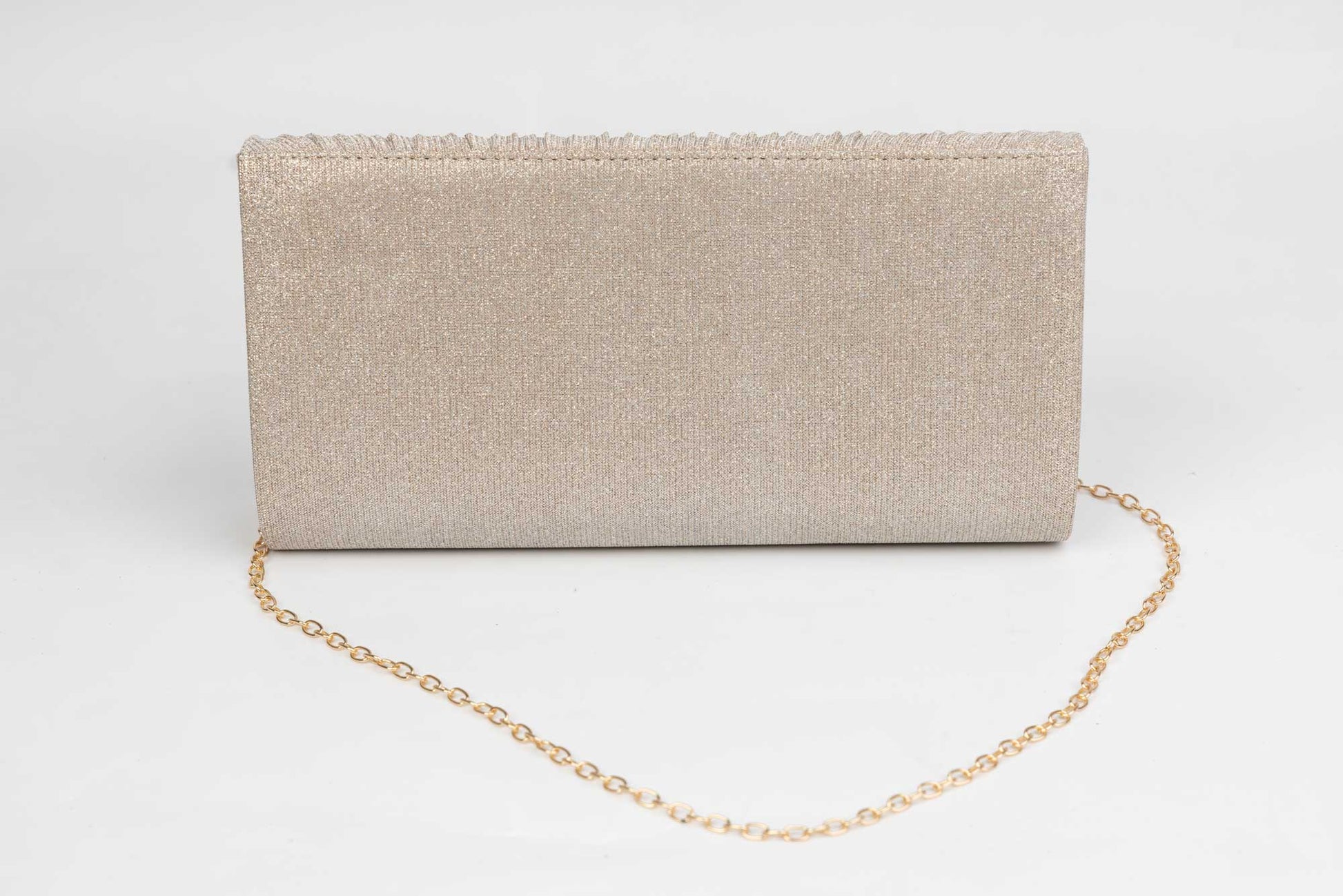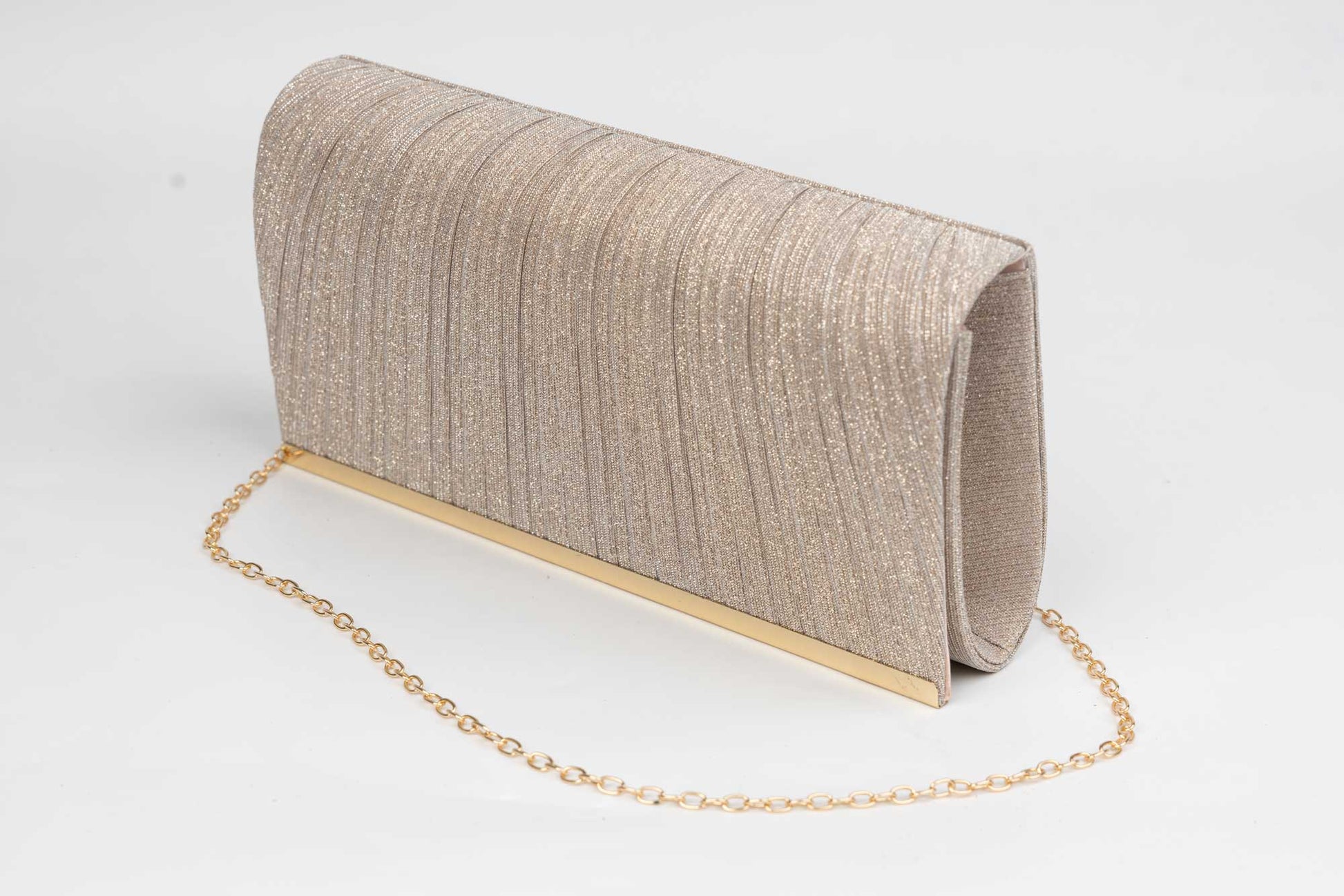 Un plic de dama de marime 26-13 cm din material auriu avand in dotare o curelusa lant metalica detasabila. Interiorul este unicameral (1 compartiment) si este potrivit si incapator pentru un telefon sau cosmetice. Inchiderea se face cu o clapeta metalica cu magnet in partea laterala a plicului.