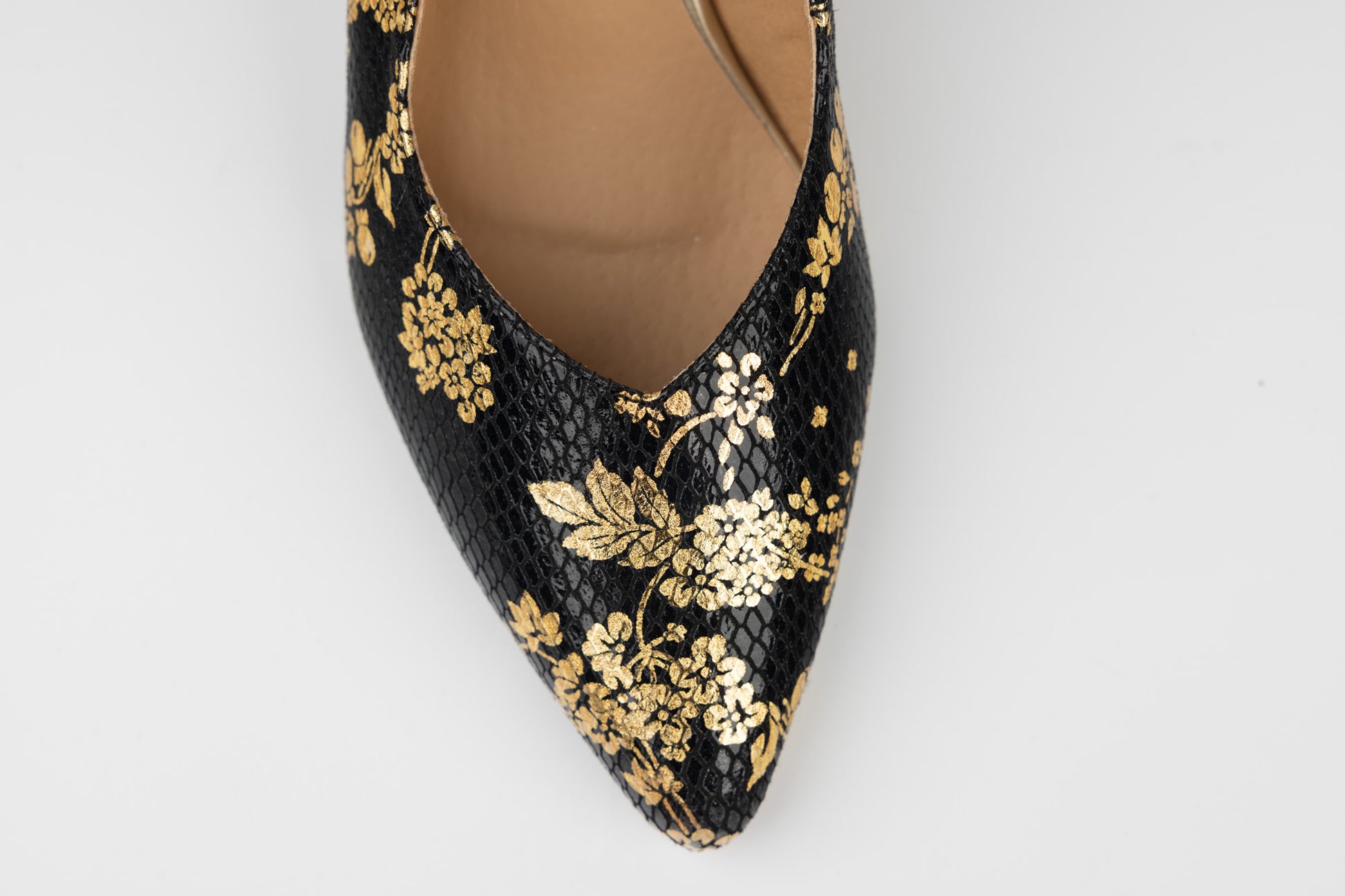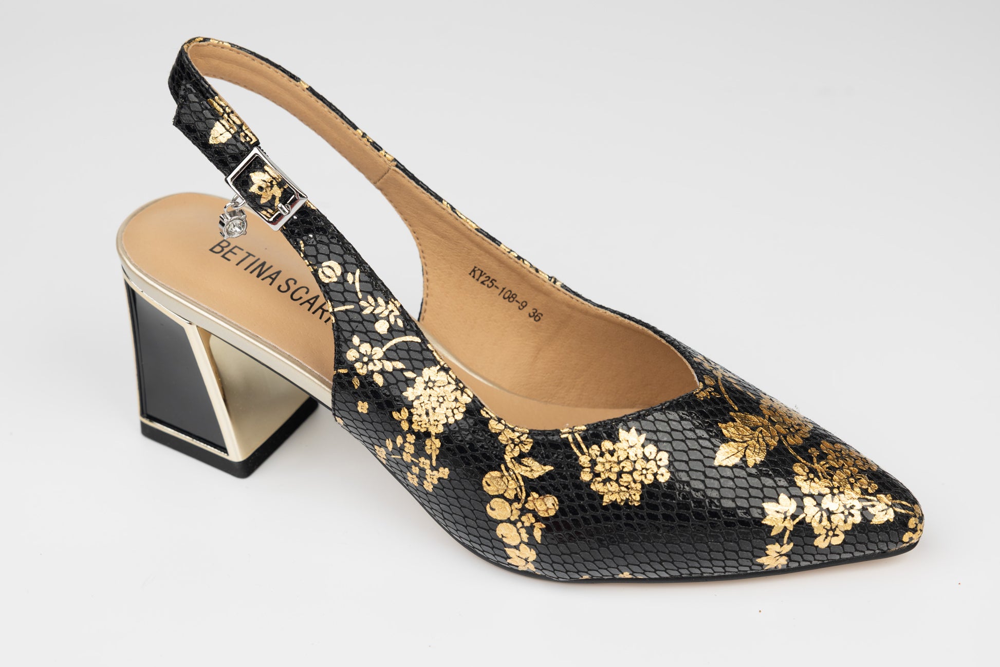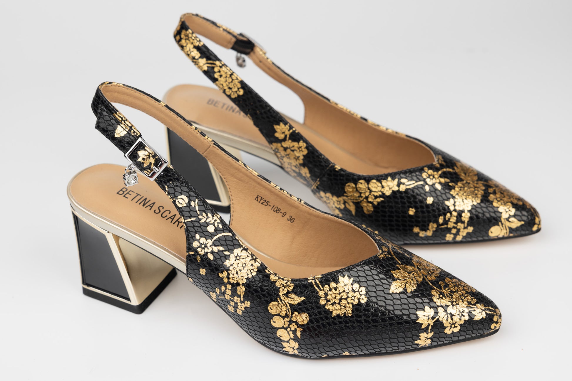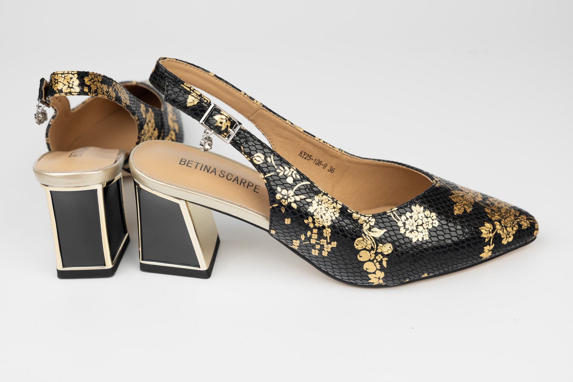 Pantofi BETINA de dama decupați din piele naturala cu toc de 6 cm inaltime. Pielea este foarte moale si ofera maximum de confort la purtare indelungata, talpa este usoara, iar pe interior deține un branț din piele, având un calapod lat XL special pentru picioare late sau cu mont. Greutatea unui singur picior este de 250 grame. Mărimi de la 36 pana la 41.