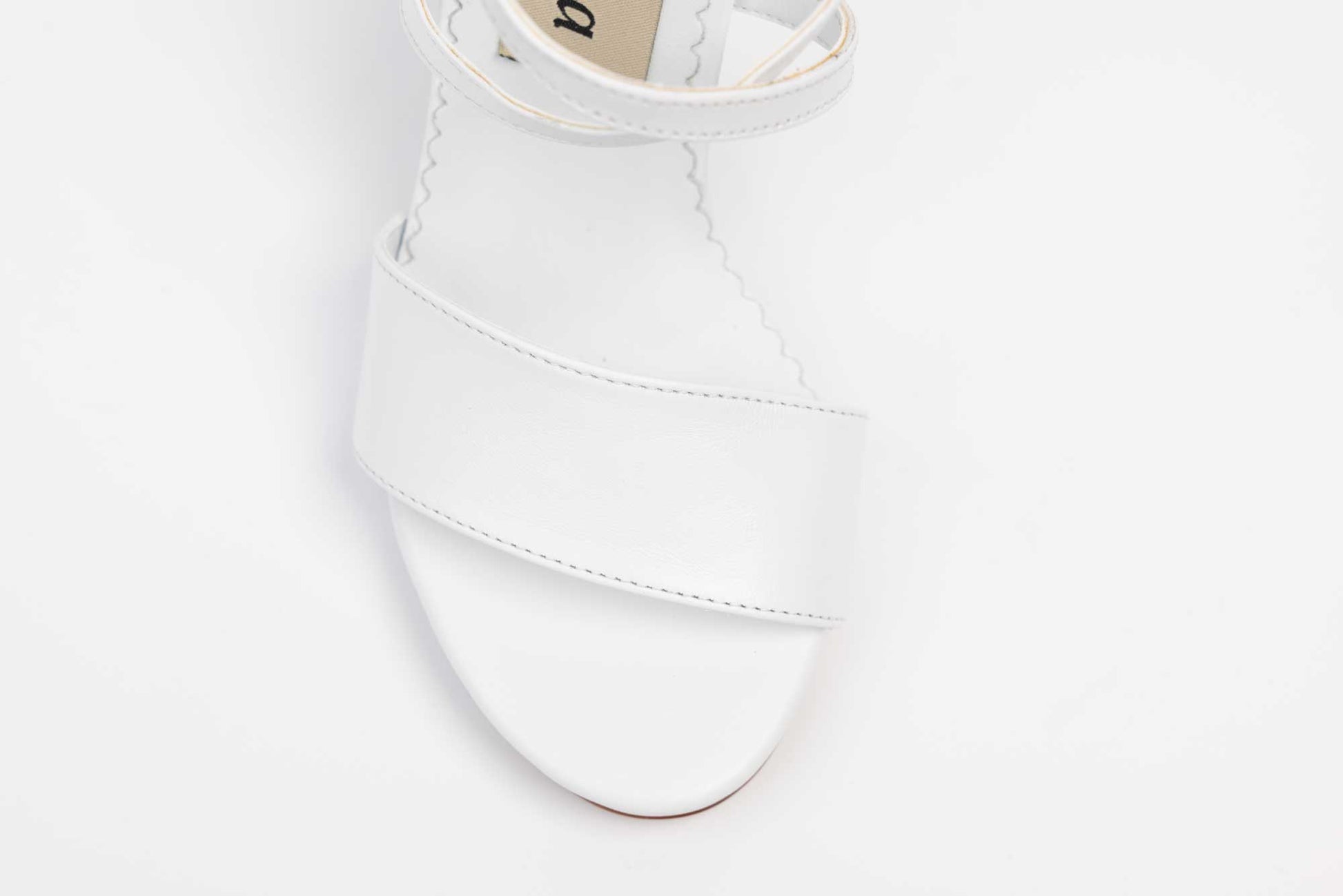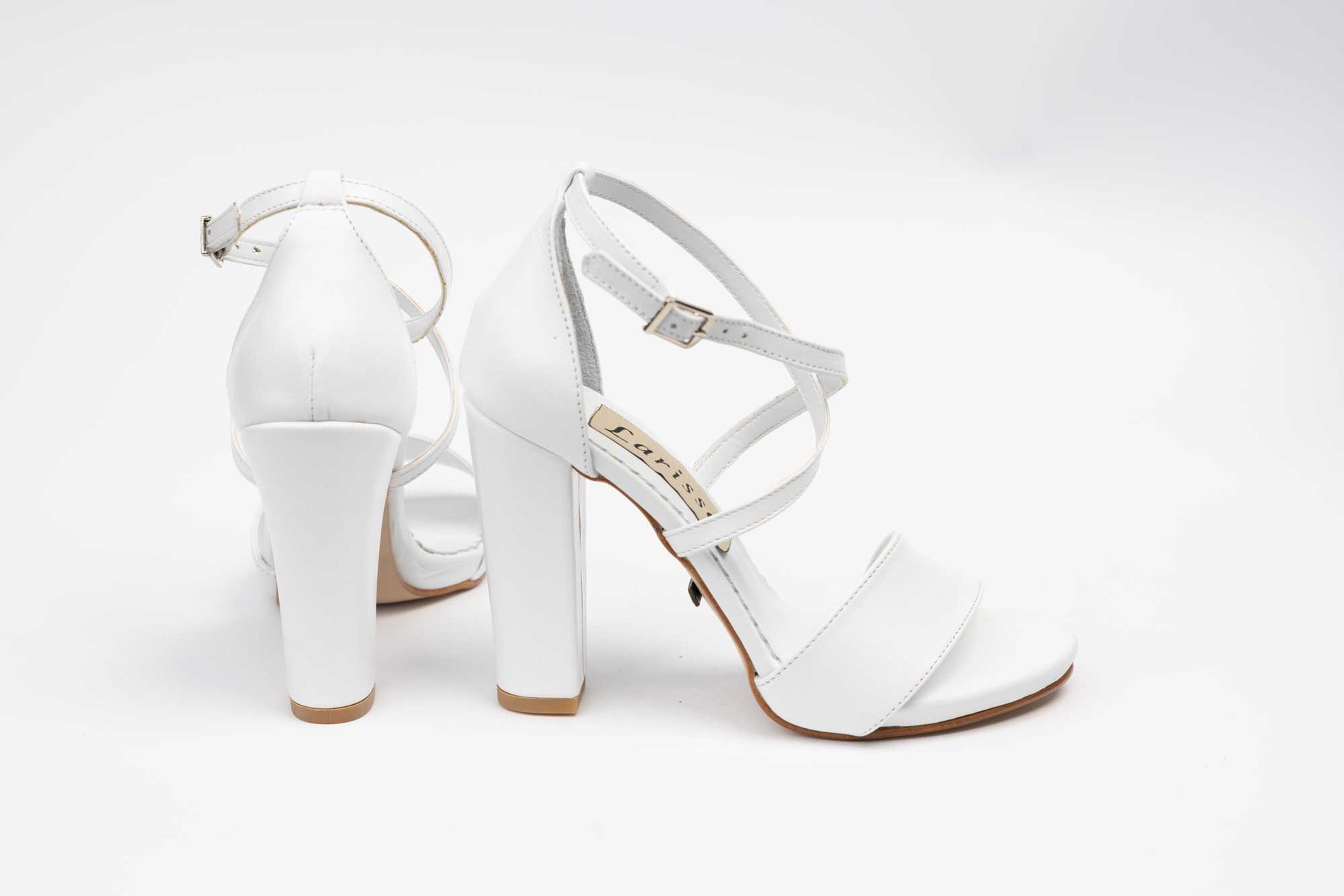 Sandale mireasa LARISA din piele naturala cu toc gros de 10 cm inaltime avand prindere deasupra gleznei cu 2 barete subtiri din piele in forma de X cu prindere intr-o catarama, iar in fata deasupra degetelor are o bareta lata de 3cm. Greutatea unui singur picior de sandala este de 177 grame.