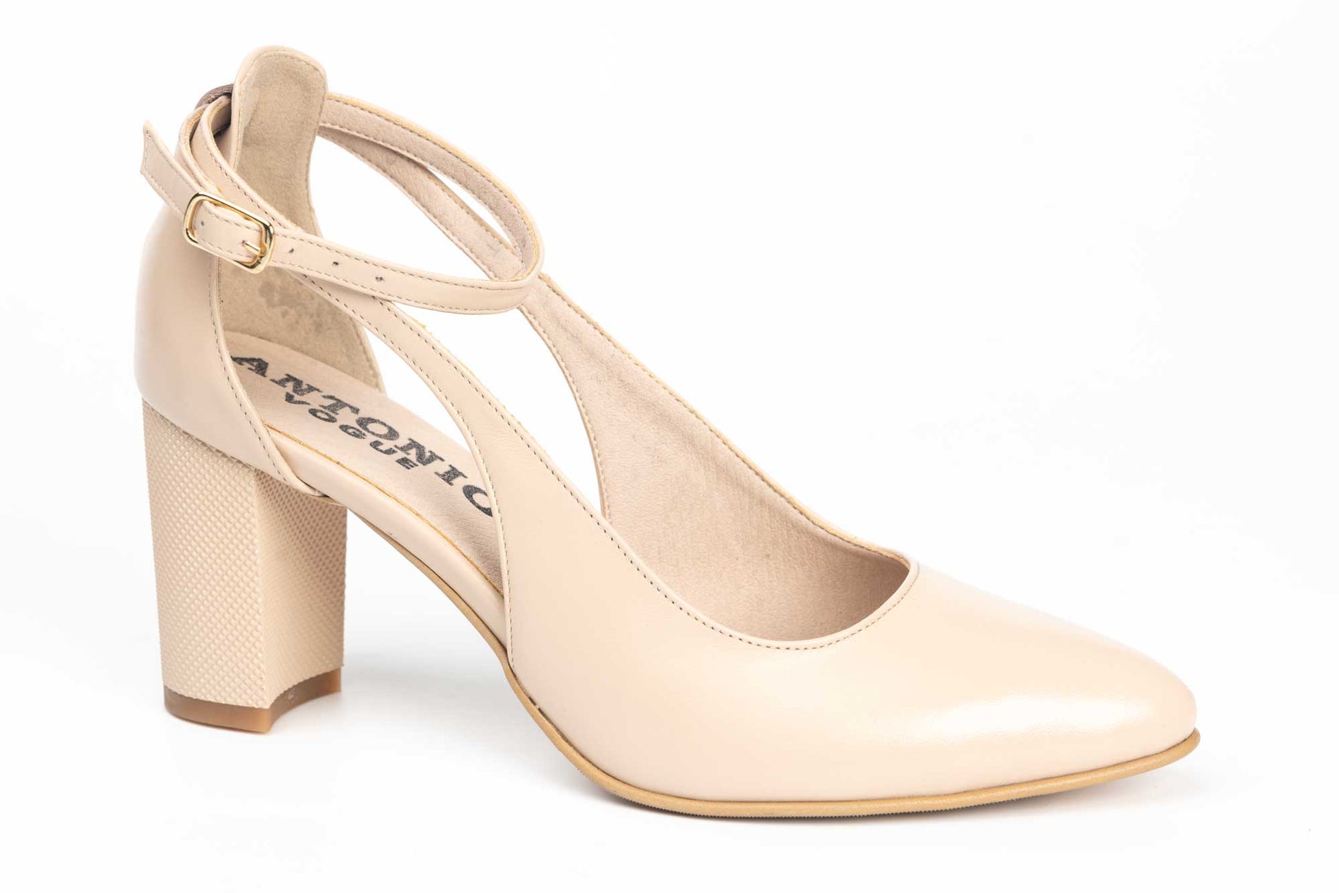 Pantofi ANTONIO de dama decupati din piele naturala avand tocul patrat de 6 cm si cu prindere de jur imprejurul gleznei intr-o bareta din piele. Greutatea unui singur picior este de 240 grame. Recomandat pentru doamne cu picior mai lat sau cu mont.