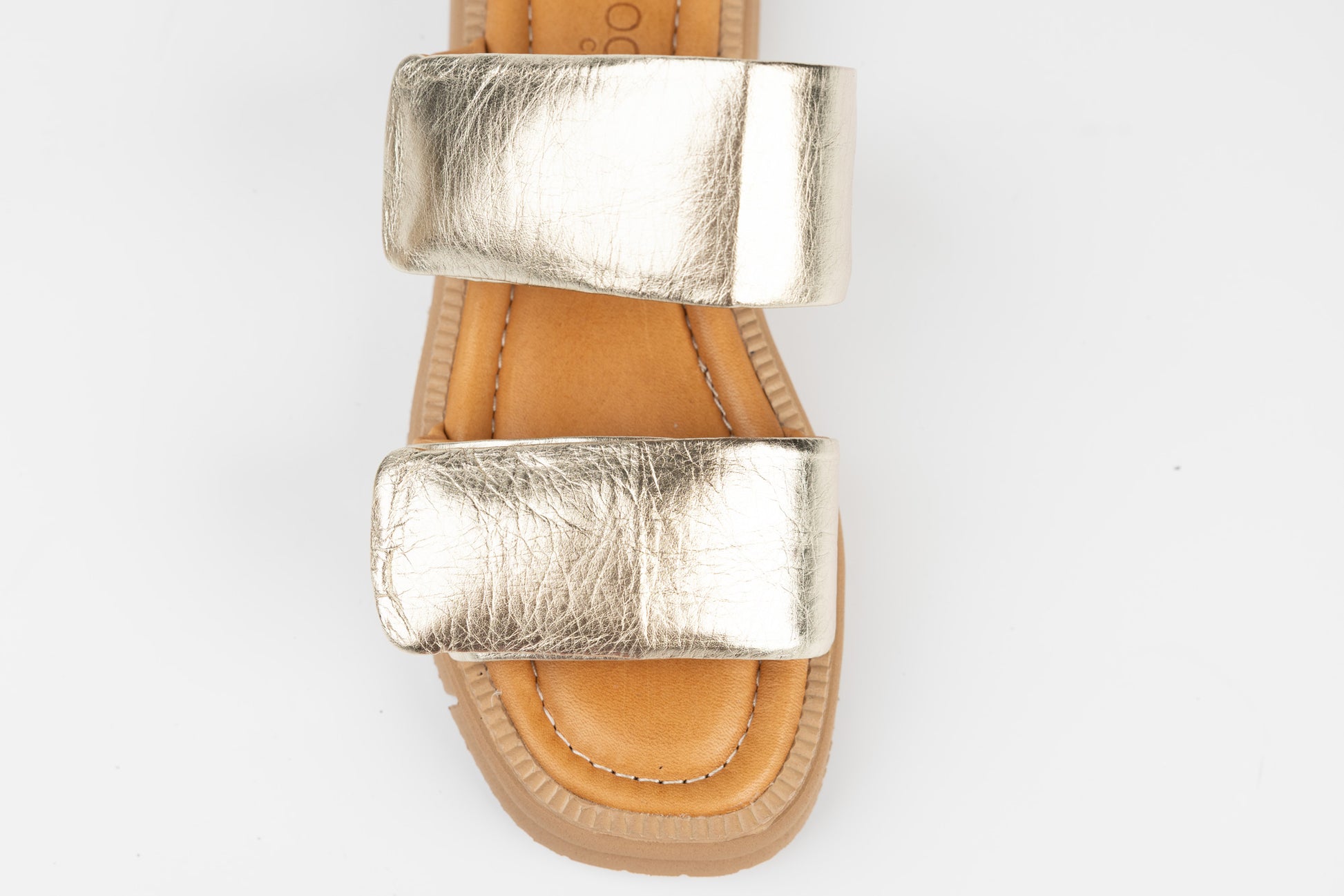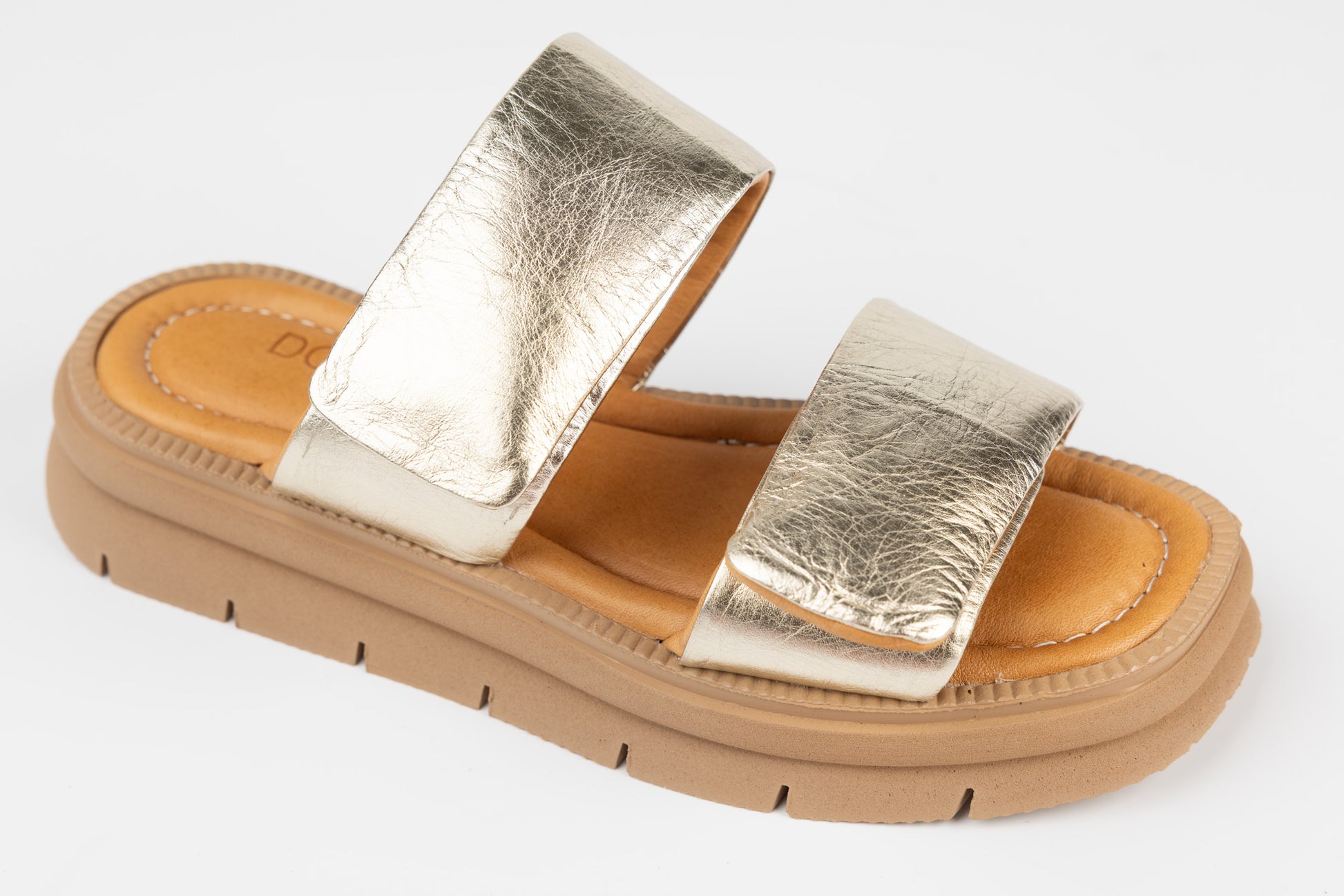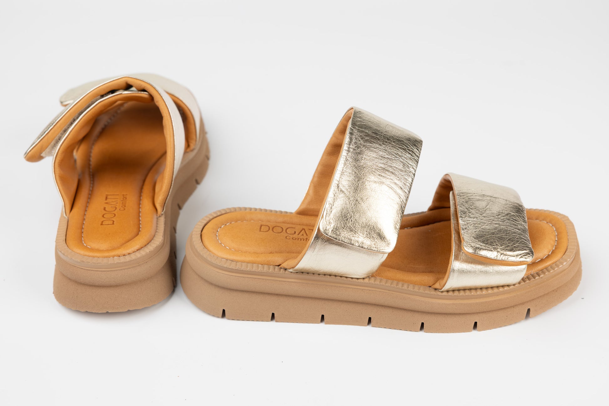 Șlapi dama DOGATI din piele naturala cu talpa groasa ortopedica captusite la interior cu piele naturala avand prinderea cu doua barete late cu scai reglabil. Inclinatia lina a piciorului in aceste sandale face mult mai comoda purtarea lor un timp indelungat fiind recomandate chiar si pentru picioare cu mont. Greutatea unui singur picior este de 250 grame. Mărimi de la 36 pana la 40.