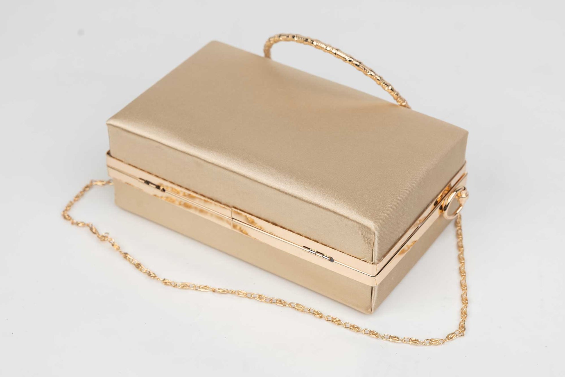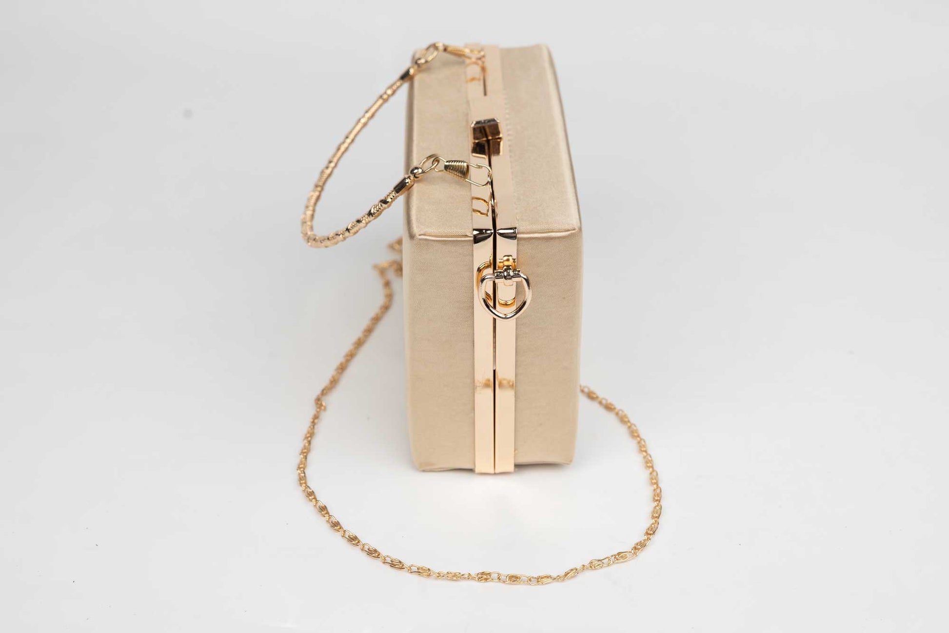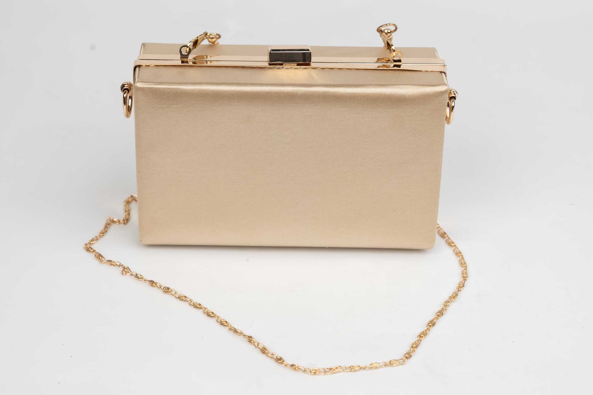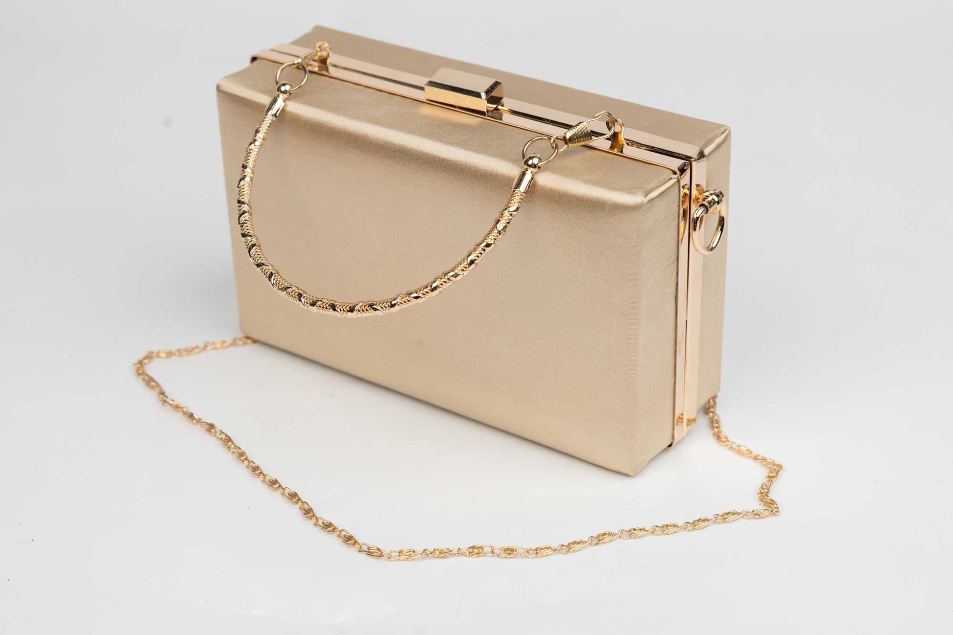 Un plic de dama de marime 18-11 cm din saten auriu avand in dotare un maner metalic si o curelusa lant metalica detasabila. Interiorul este bicameral (2 compartimente) si este potrivit si incapator pentru un telefon sau cosmetice. Inchiderea se face cu o clapeta metalica in partea de sus a plicului.