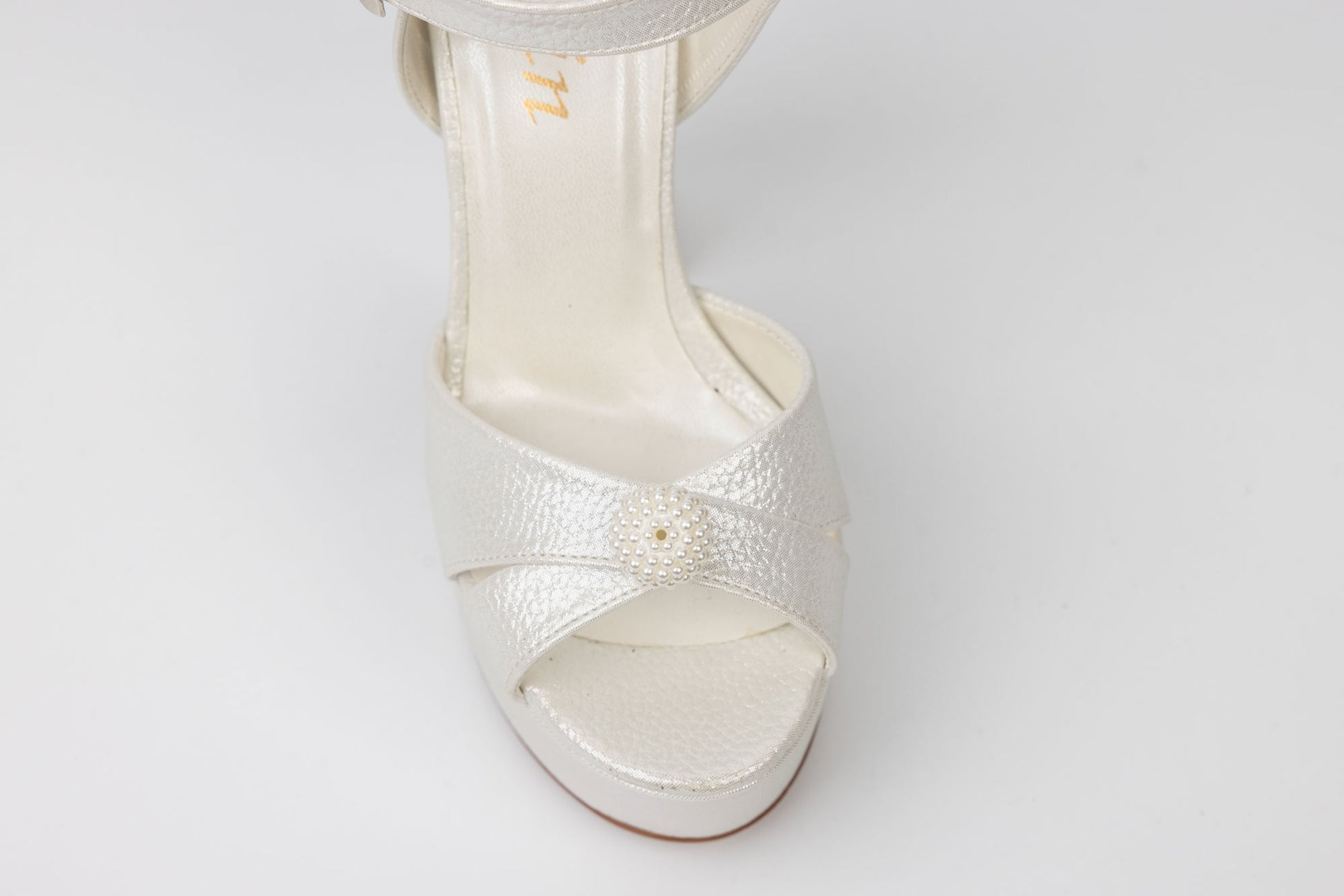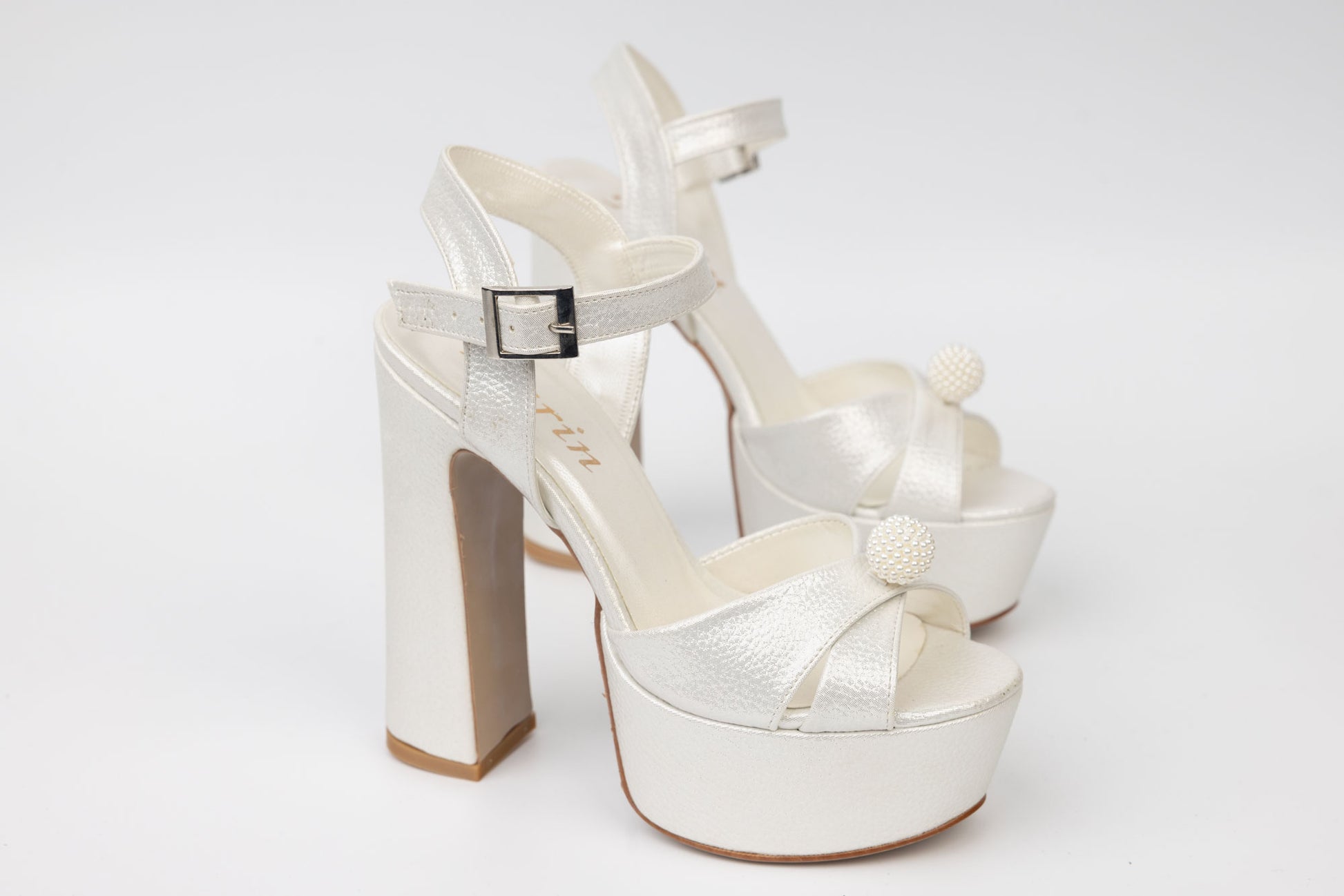 Sandale mireasa KARIN de piele ecologica de calitate premium cu tocul gros de 14 cm inaltime si platforma de 4 cm cu prindere cu o bareta subtire de jur imprejurul gleznei. Greutatea unui singur pantof este de 314 grame. Pe varf are montat un accesoriu floare cu perle finut.