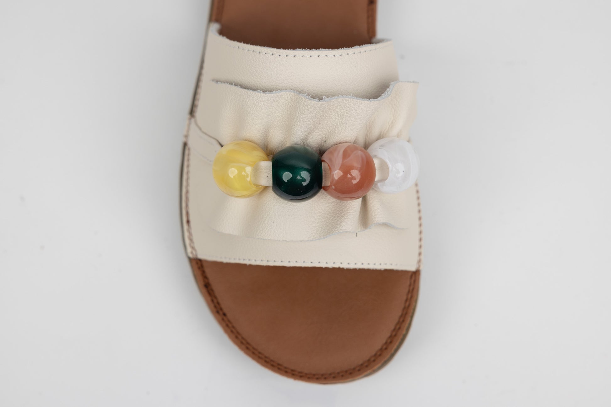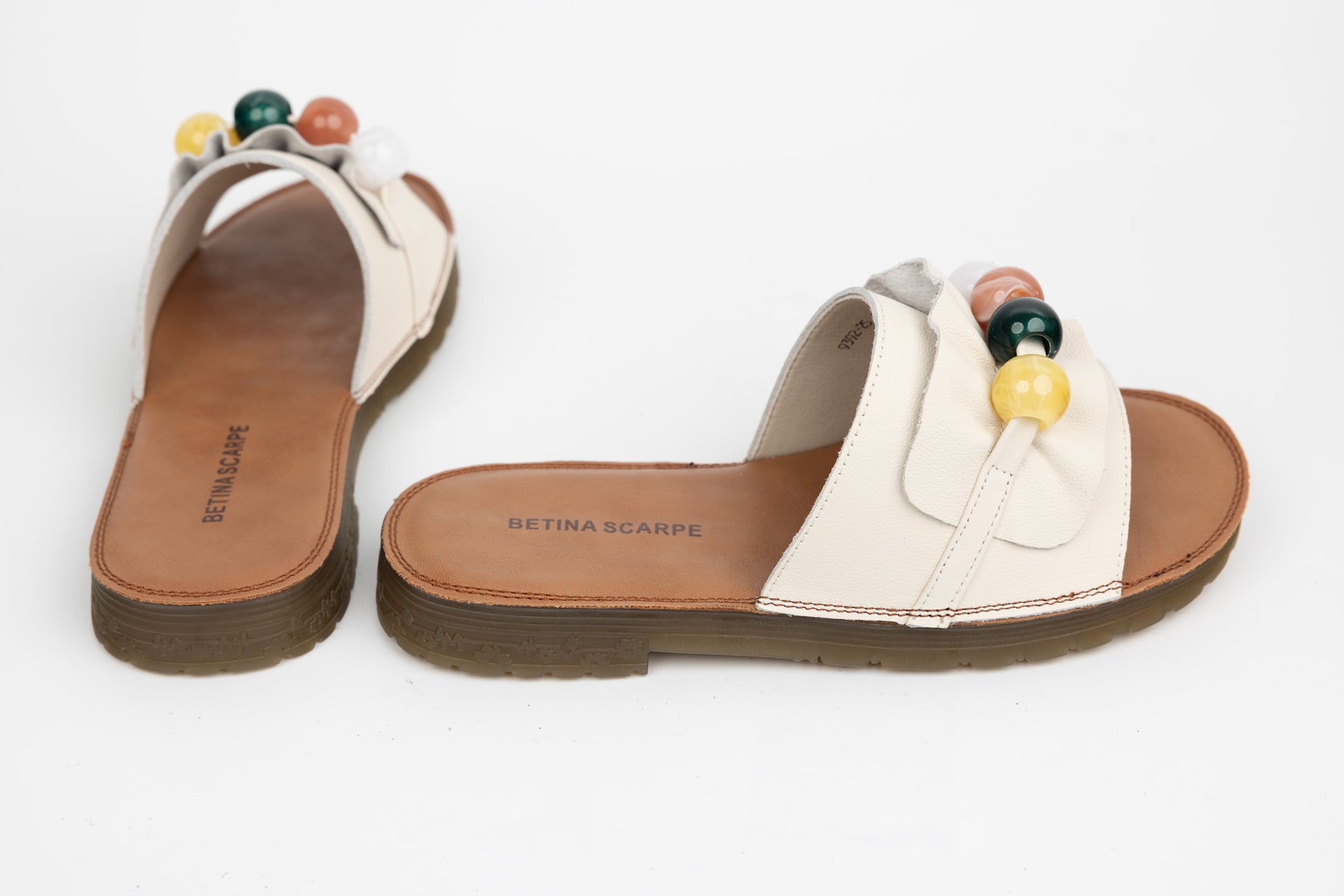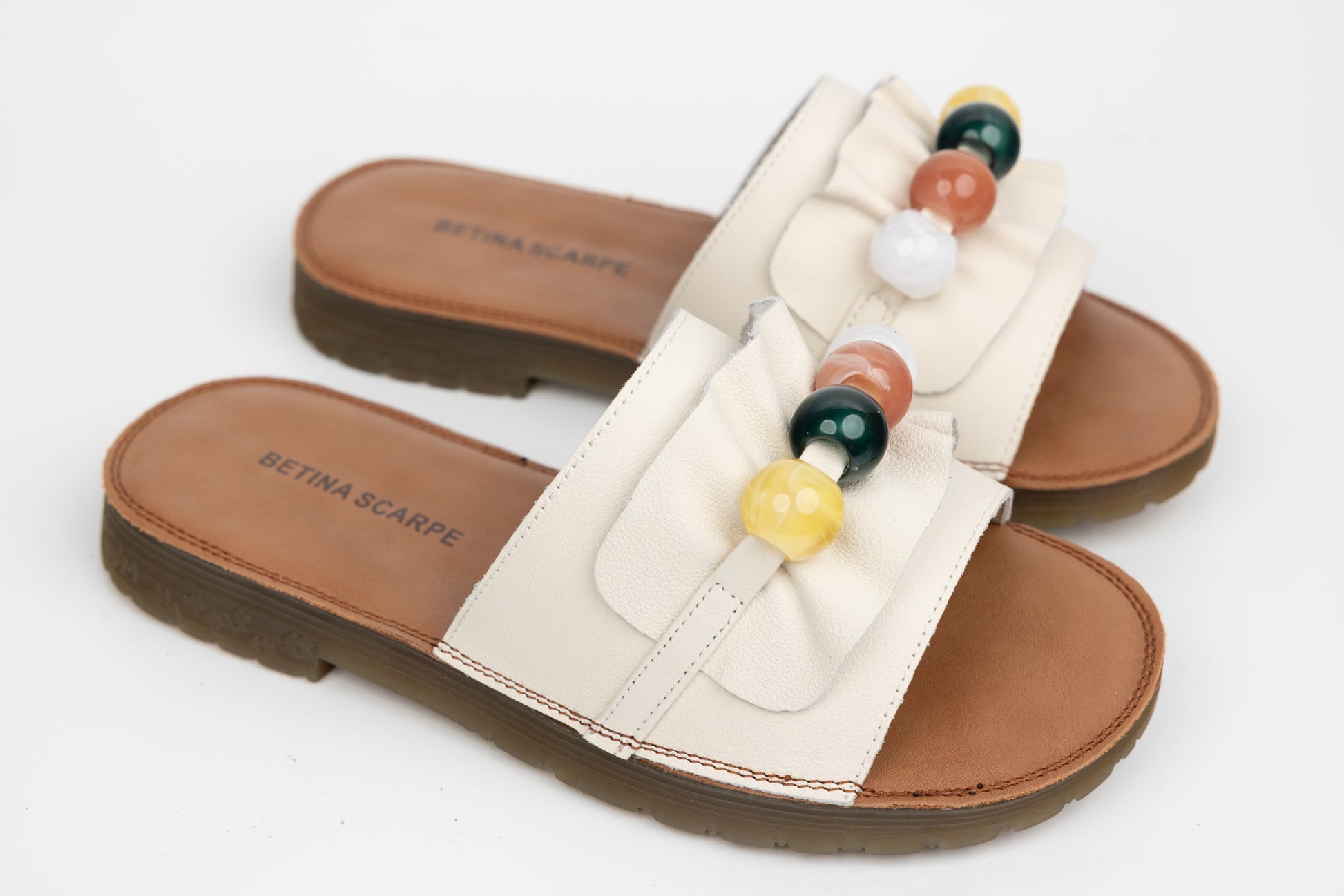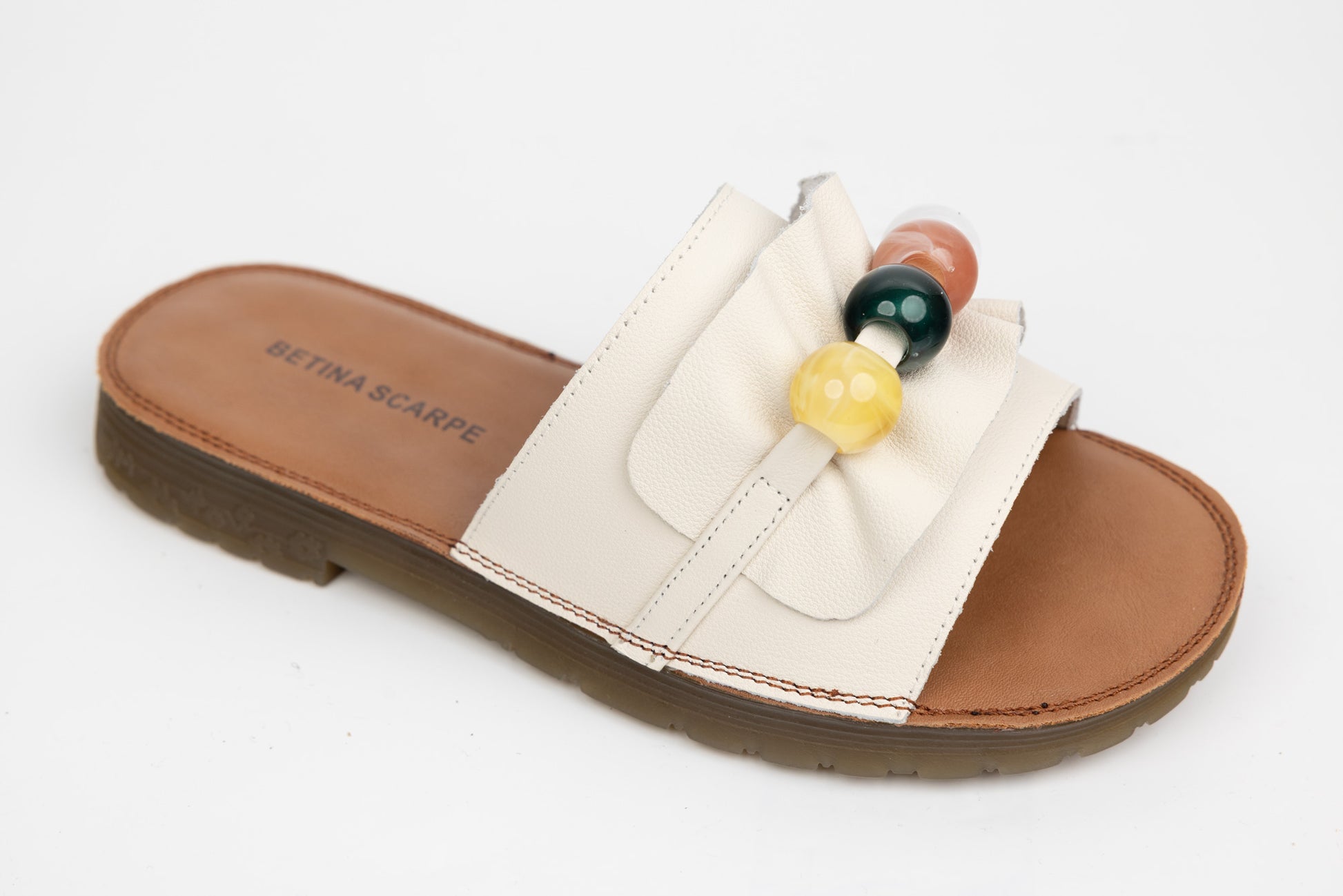 Slapi BETINA de dama din piele naturala cu fundita creata accesorizata cu un rand de margele-bomboane avand talpa groasa de 1 cm foarte moale si elastica avand brantul cu burete memory facand ca acest model sa fie unul foarte apreciat si comod la purtare indelungata. Greutatea unui singur slap este de 235 grame.