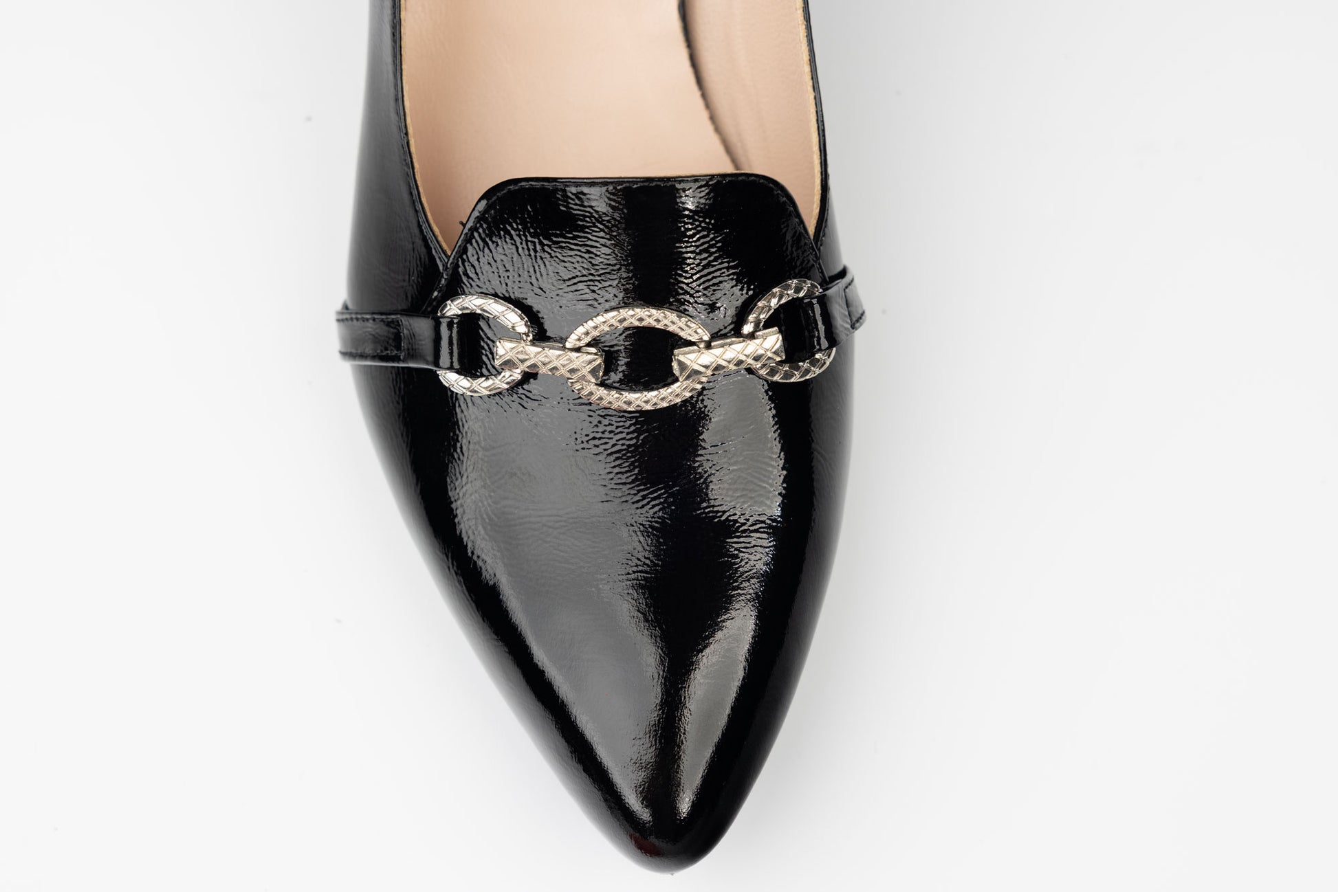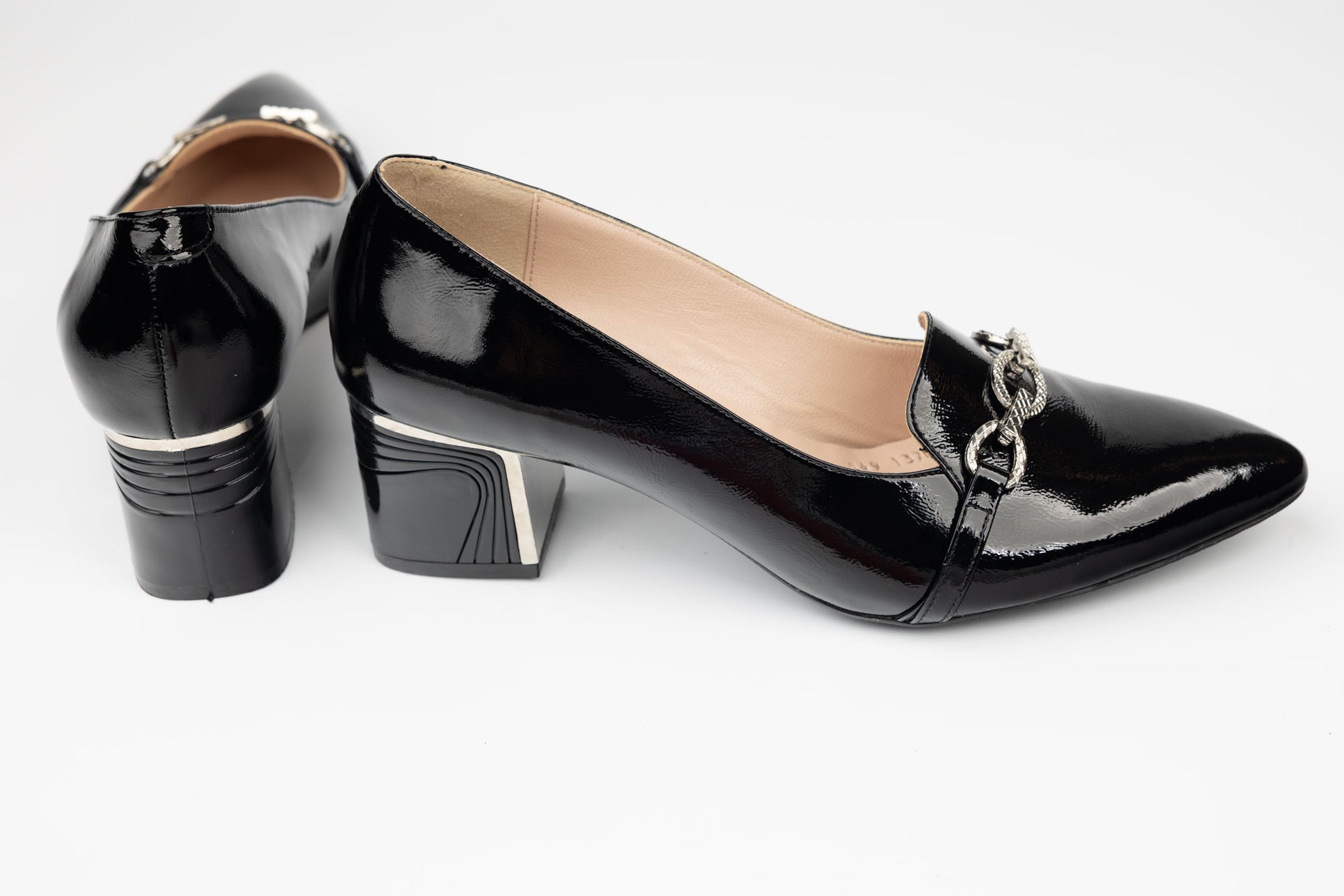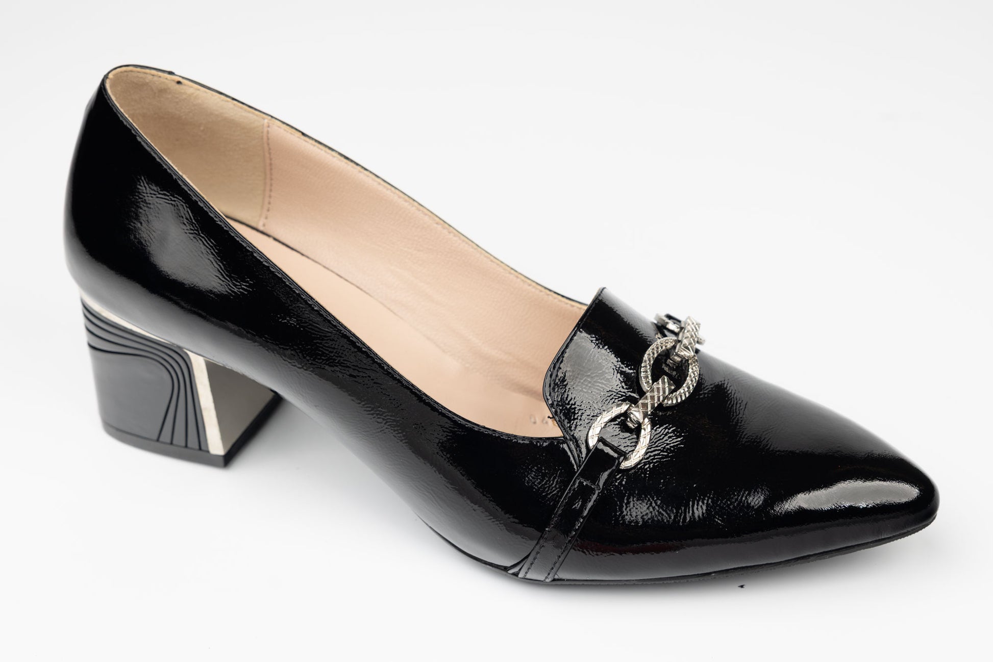 Pantofi DOGATI de dama din piele naturala lăcuită avand tocul pătrățos cu ornament , cu inaltime de 4,5 cm. Greutatea unui singur picior este de 240 grame. Recomandat pentru doamne cu picior mai lat sau cu mont. Mărimi de la 39 până la 42.