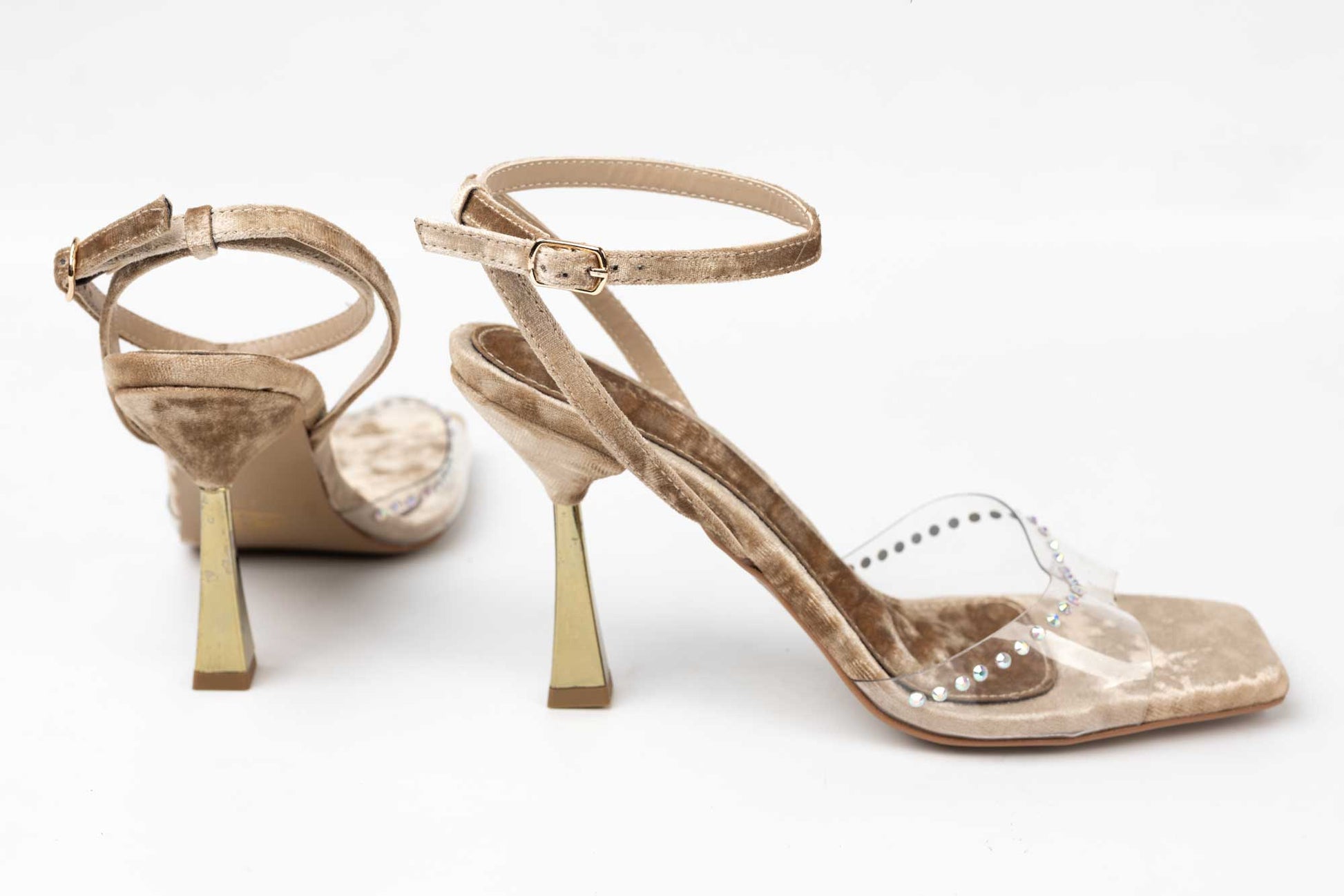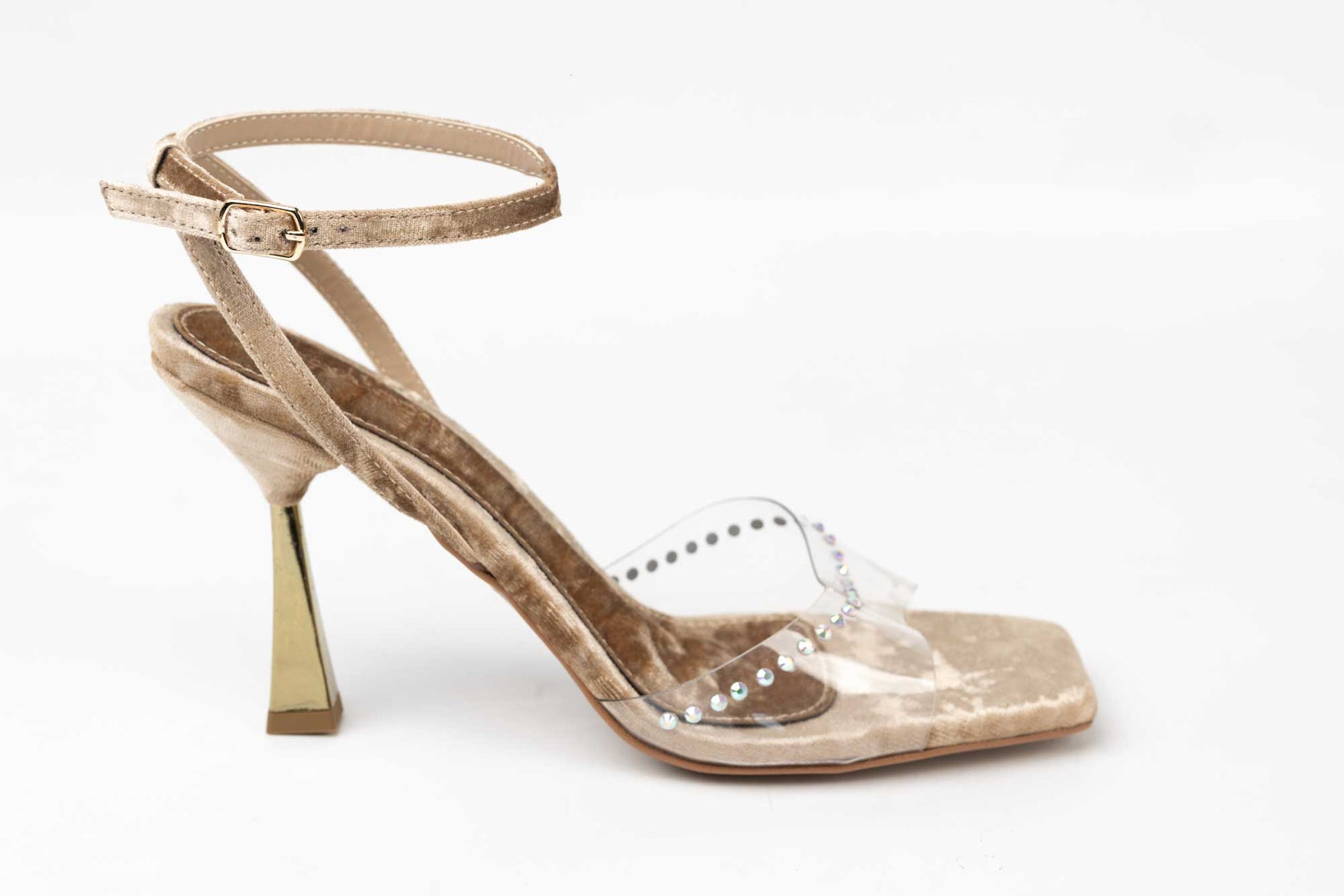 Sandale LONDON din piele eco satenata de calitate premium cu prindere intr-o baretuta subtire cu o catarama. Tocul este de 9 cm inaltime iar la partea din fata are o bareta peste degete din nylon elastic cu cristale care face ca acest model sa fie unul deosebit.