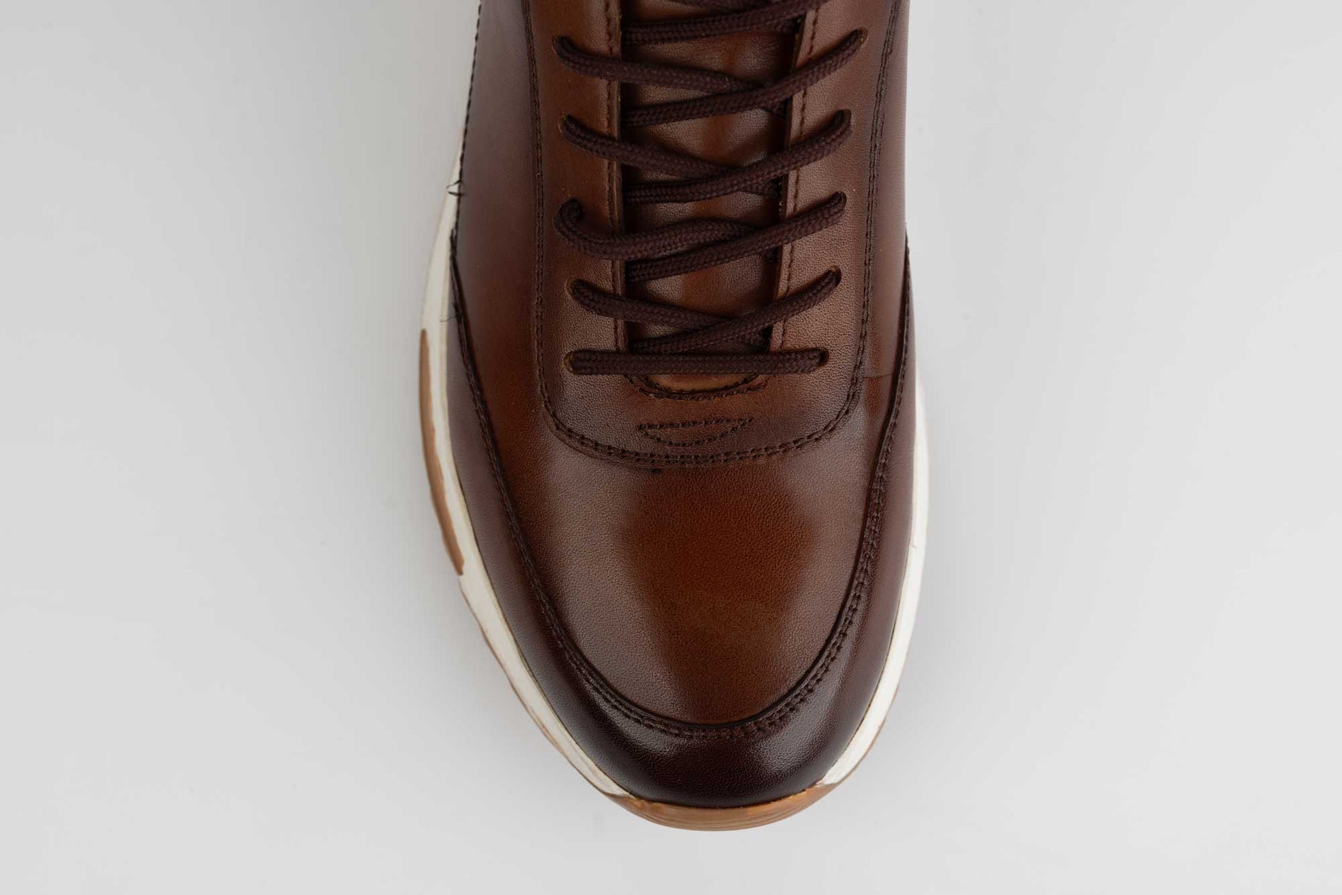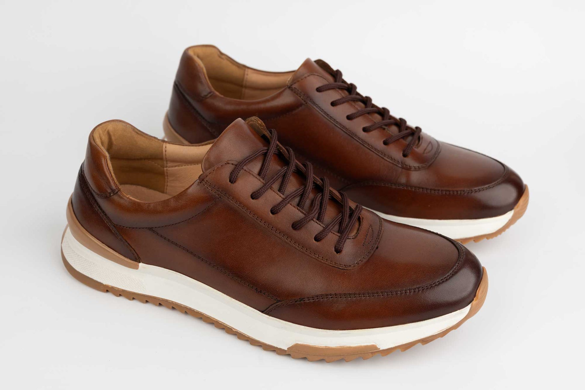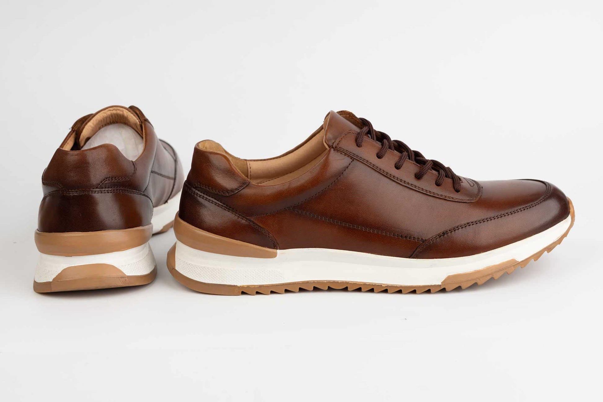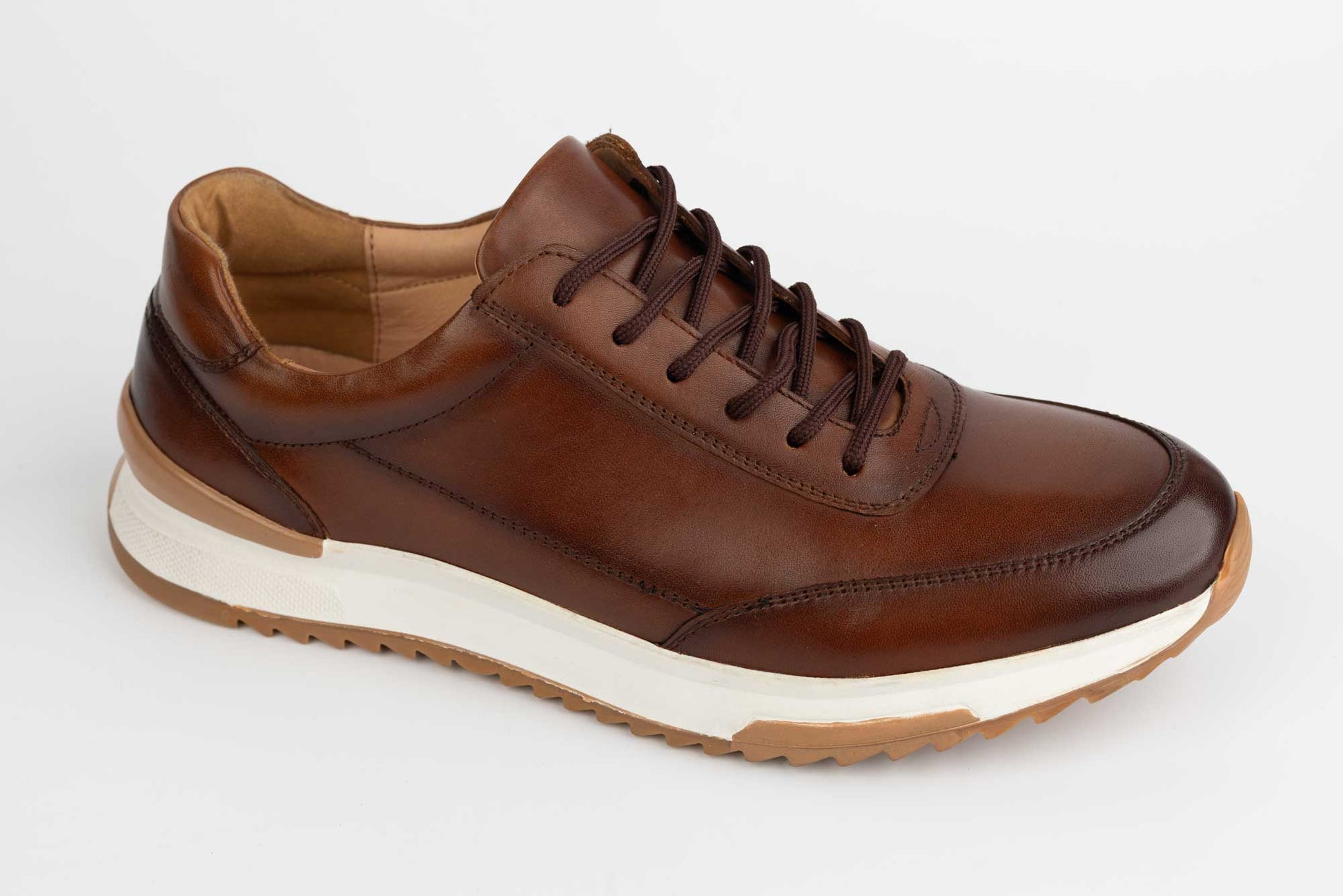 Pantofi MELS de barbati din piele naturala foarte fina si moale la atingere cu siret si o talpa alba sport cu insertii maro. La interior are un brant cu moale pentru un confort maxim. Greutatea unui singur pantof este de 210 grame.