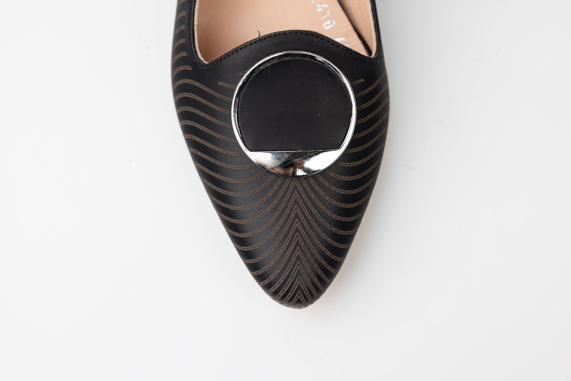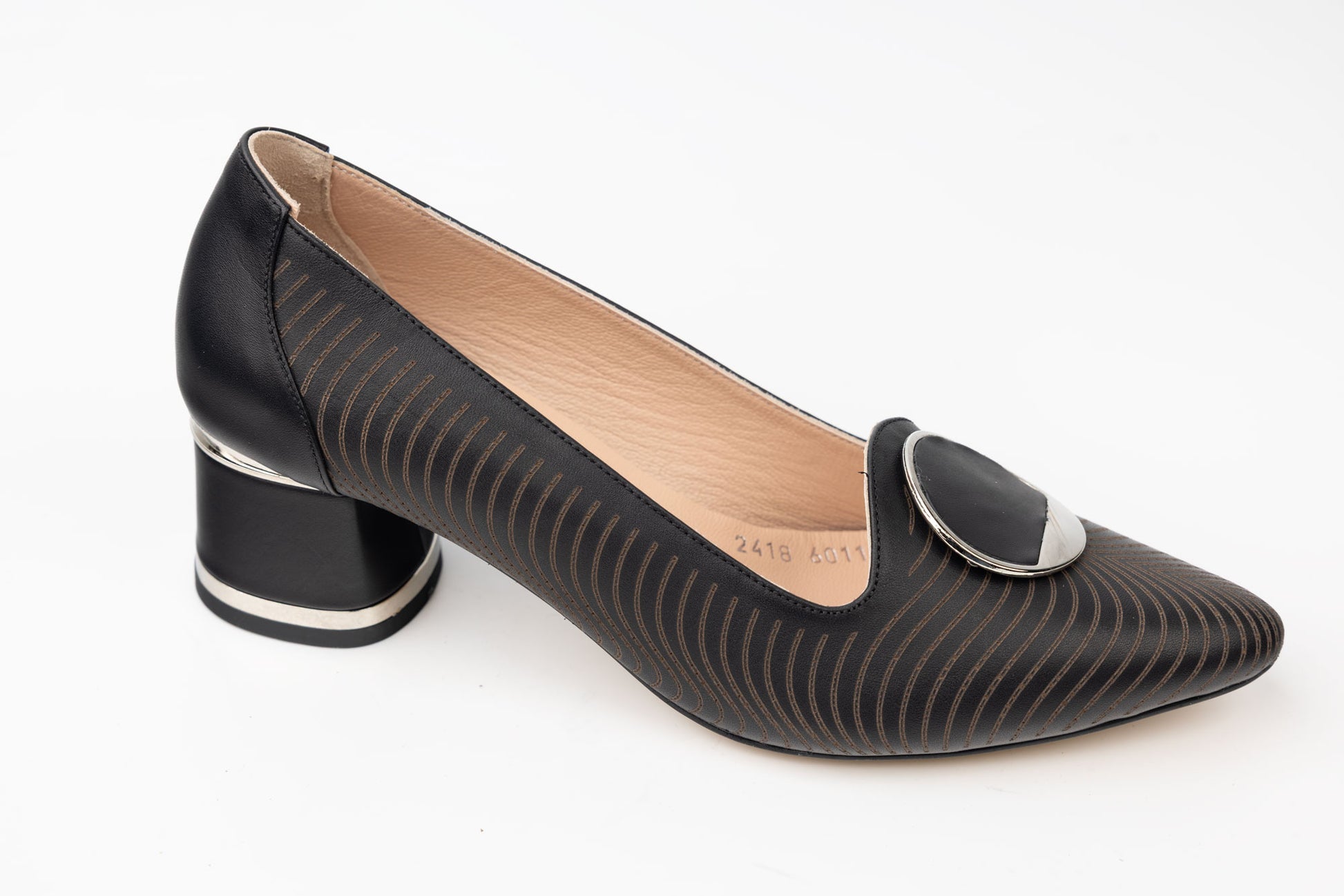 Pantofi LSD de dama decupați din piele naturala cu toc rotunjit de 6 cm inaltime. Pielea este foarte moale si ofera maximum de confort la purtare indelungata, talpa este usoara, iar pe interior deține un branț din piele, având un calapod lat XL special pentru picioare late sau cu mont. Greutatea unui singur picior este de 250 grame.
