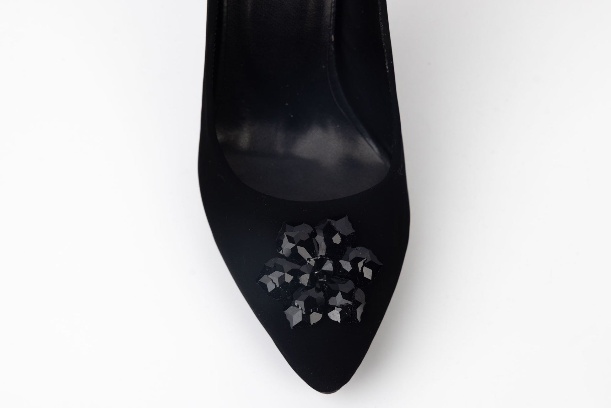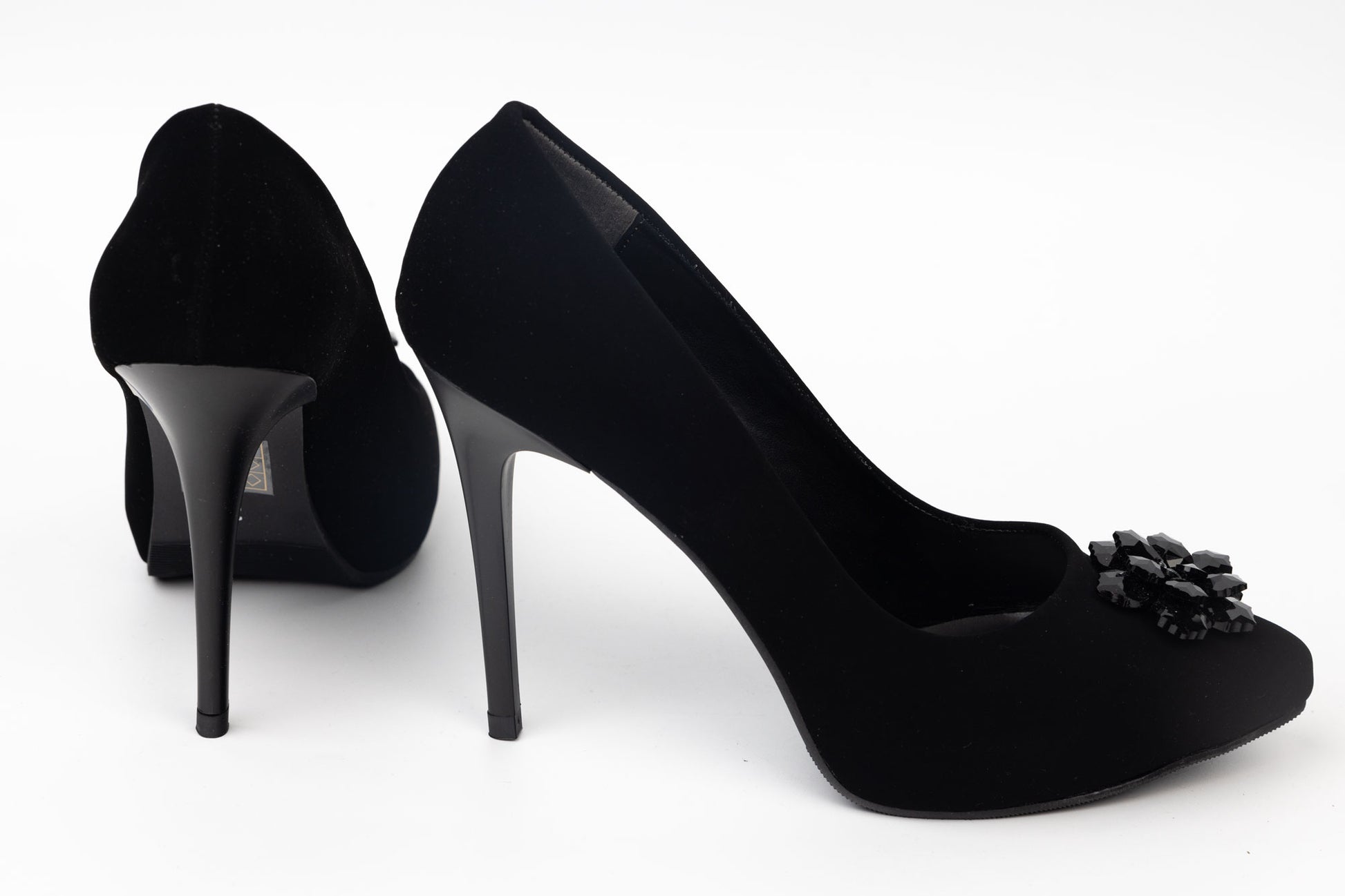 Pantofi KARIN de dama din piele ecologica intoarsa de calitate premium cu toc stiletto de 10 cm inaltime. Acest pantof este foarte comod datorita platformei de 1 cm ascunse in interior care face ca inclinatia piciorului sa fie una lina. Greutatea unui singur pantof este de 190 grame. Pe varf are montat un accesoriu cu cristale negre.