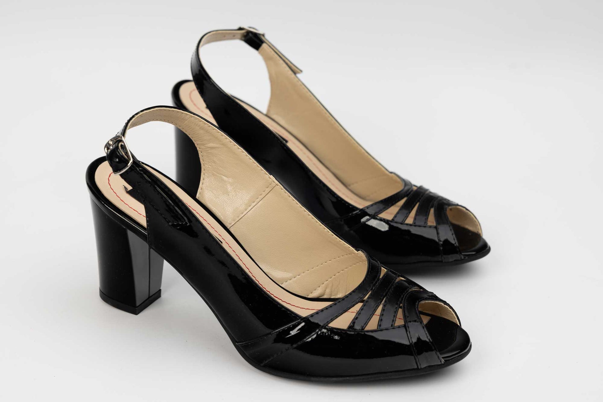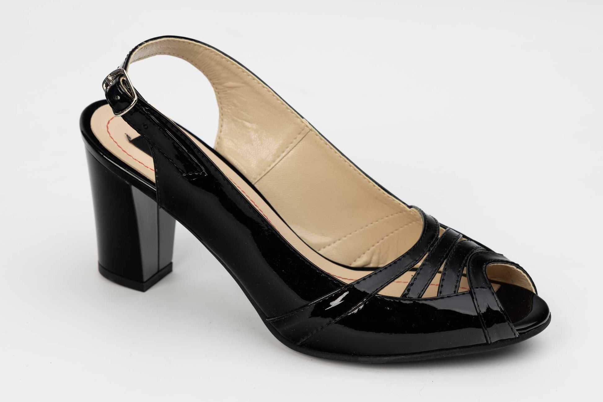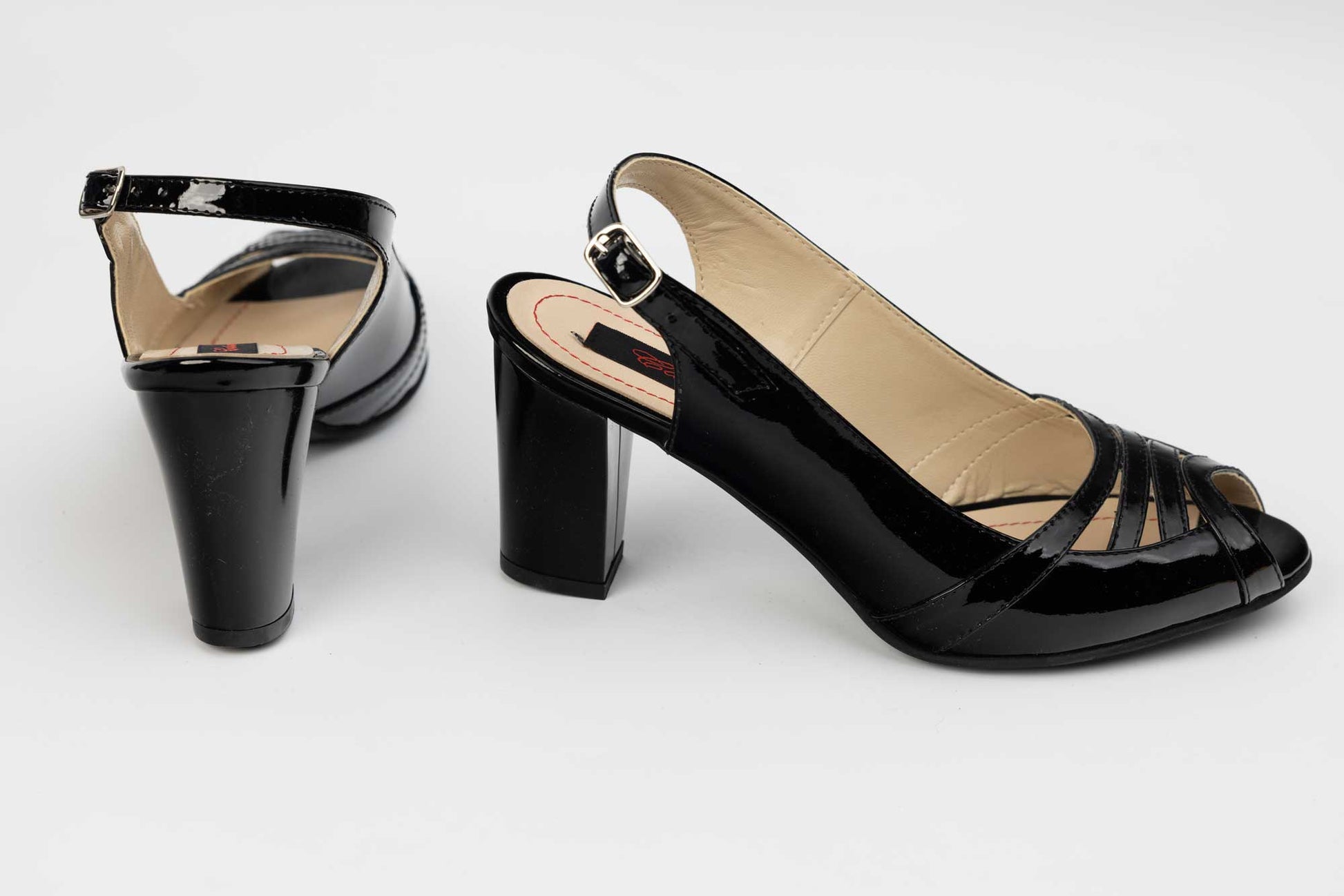 Sandale SORTEC de dama din piele naturala lac, cu toc gros inalt de 7 cm avand prindere in spatele calcaiului cu o bareta subtire intr-o catarama fina. In partea din fata are o bareta franjurata pentru o sustinere mai buna a piciorului. Greutatea unui singur picior este de 285 grame.