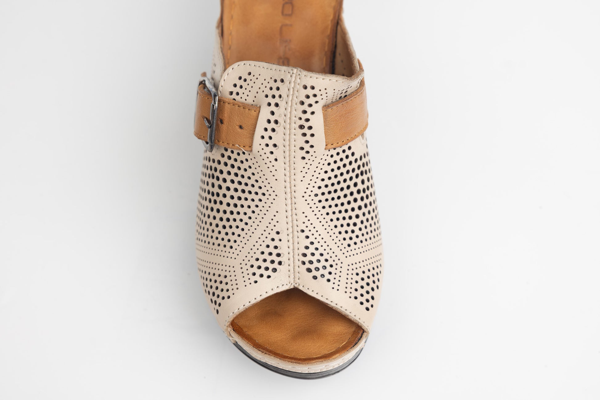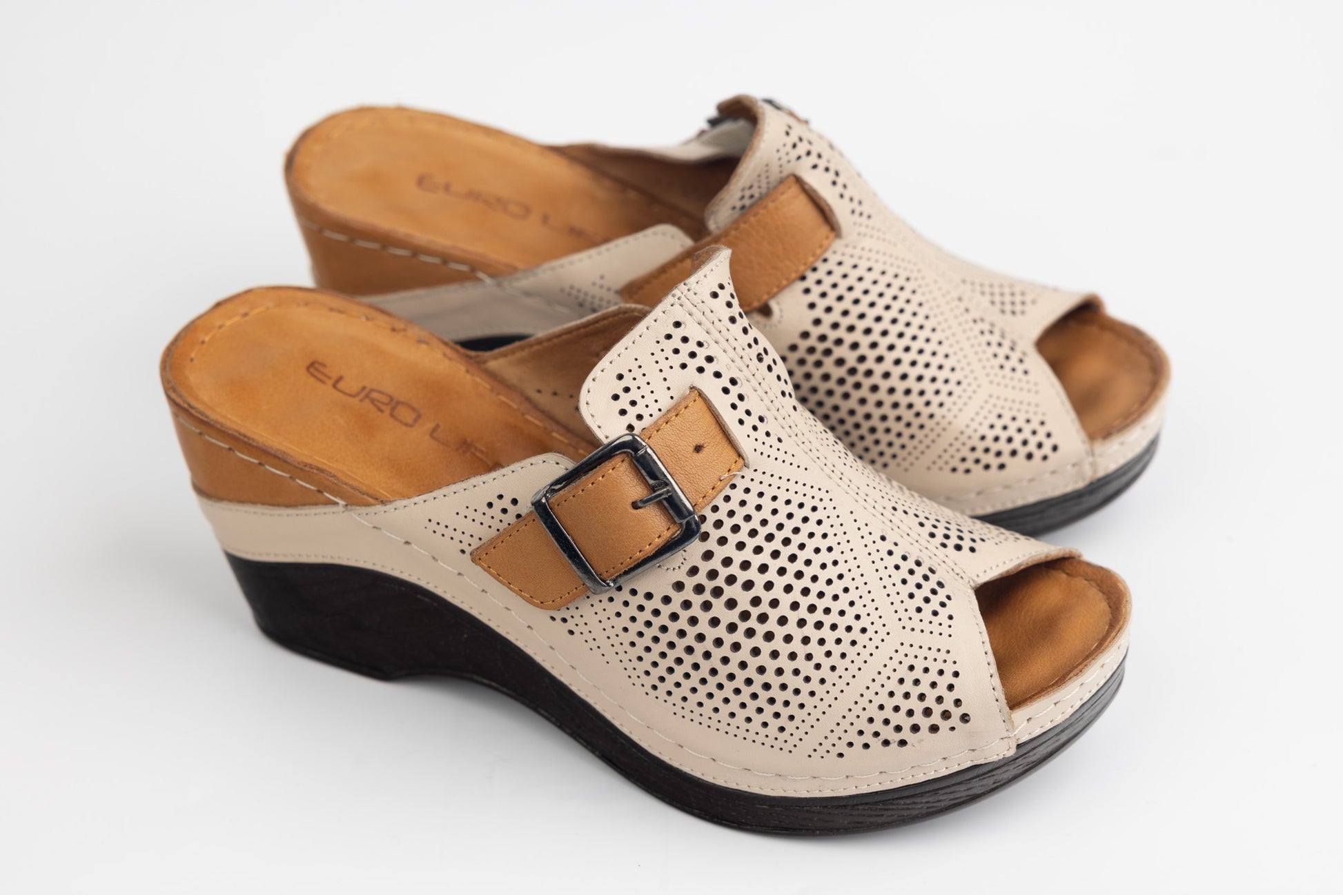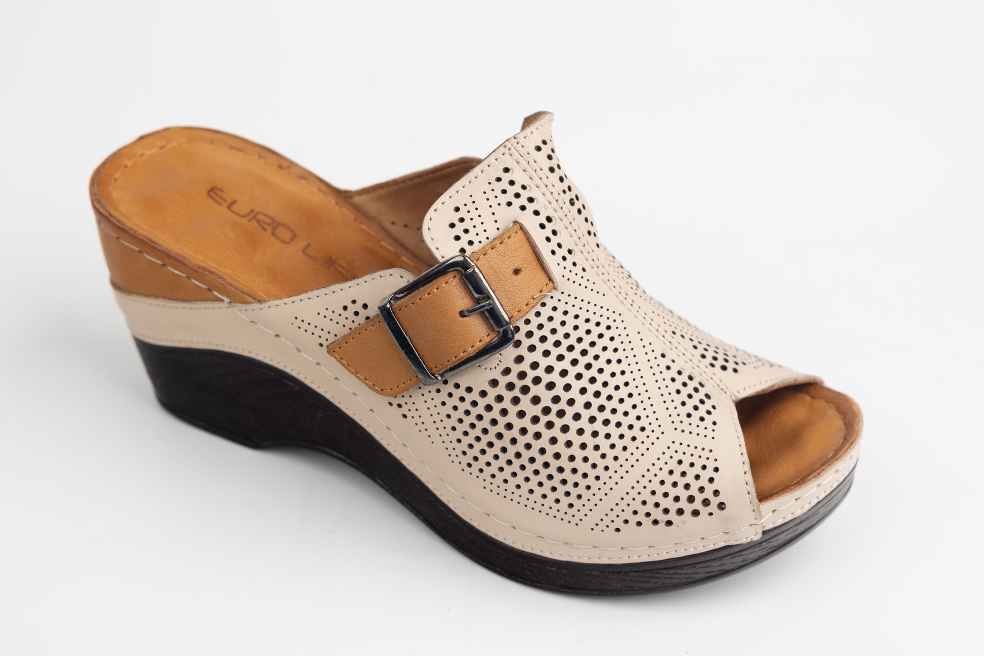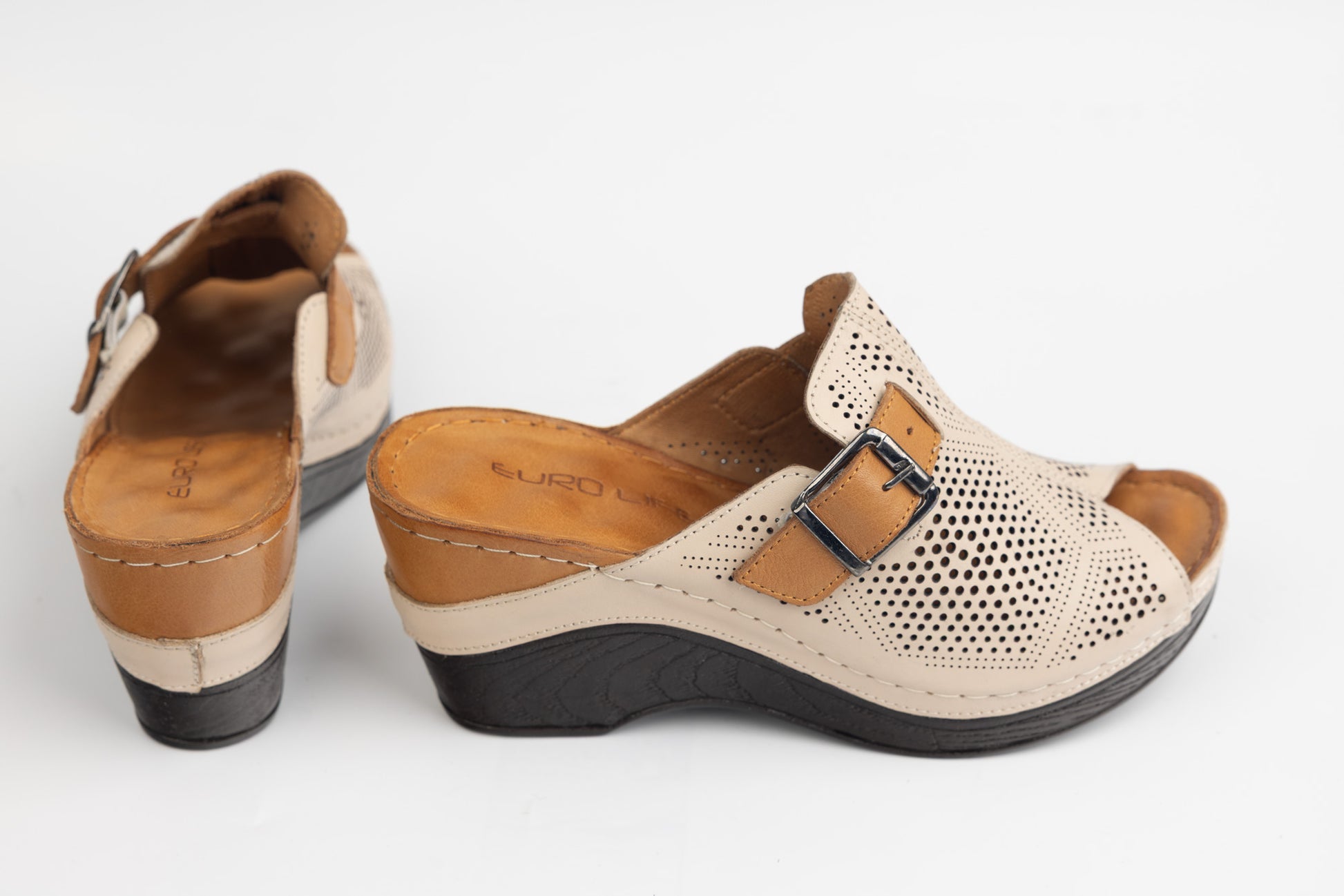 Saboți dama LSD din piele naturala cu talpa groasa ortopedica de 6,5 cm captusite la interior cu piele naturala avand prinderea pe o bareta cu catarama in laterala piciorului. Inclinatia lina a piciorului in aceste sandale face mult mai comoda purtarea lor un timp indelungat fiind recomandate chiar si pentru picioare cu mont pentru ca le acopera in intregime. Greutatea unui singur picior este de 250 grame.