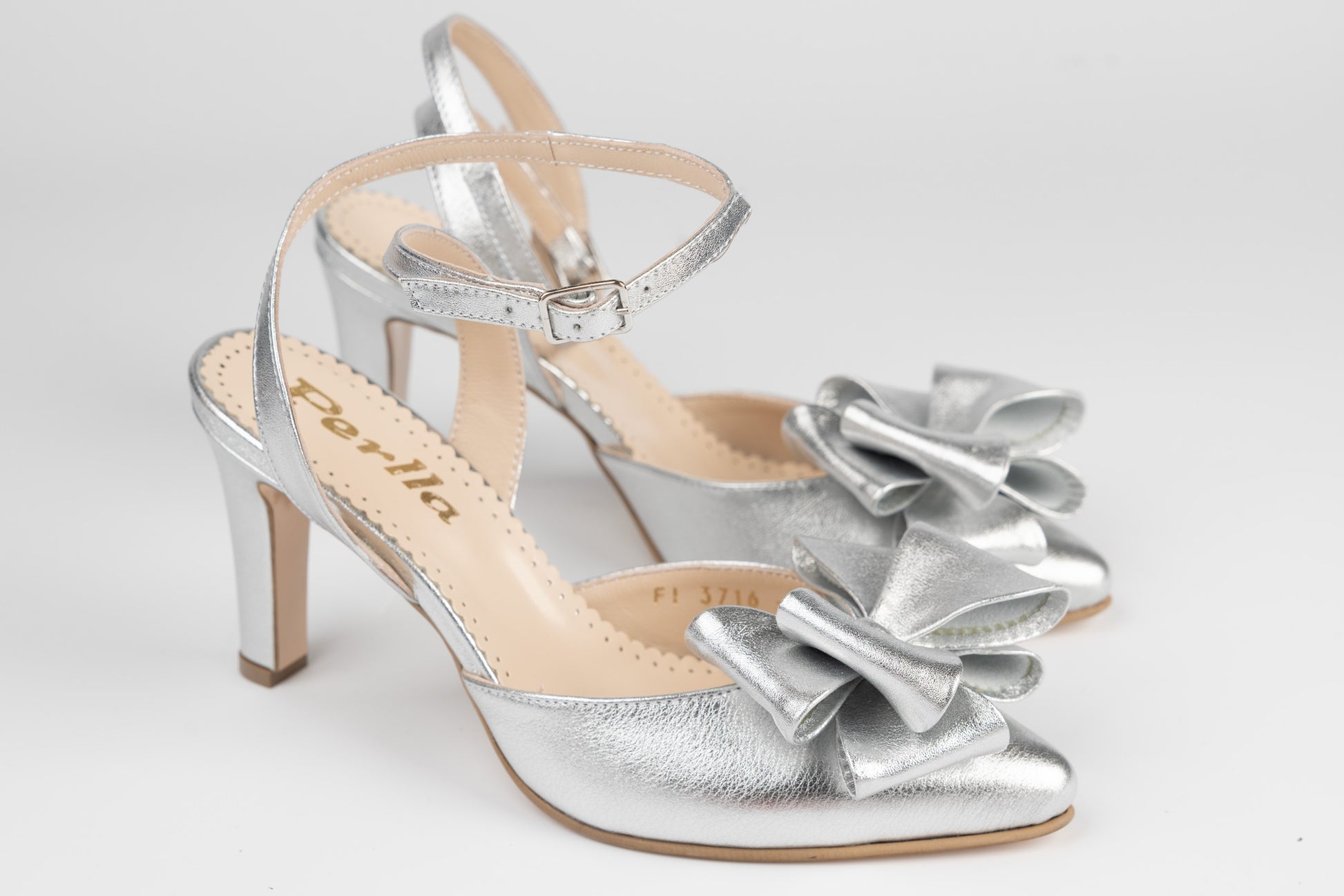Pantofi PERLA din piele naturala cu toc mediu mai gros si varful ascuțit , model simplu, decupat la mijloc si in spate având prinderea o bareta pe glezna.. Inaltimea tocului este de 7 cm iar pe vârf are montata o fundiță din piele naturală . Greutatea unui singur picior este de 260 grame. Mărimi de la 35 pana la 42.
