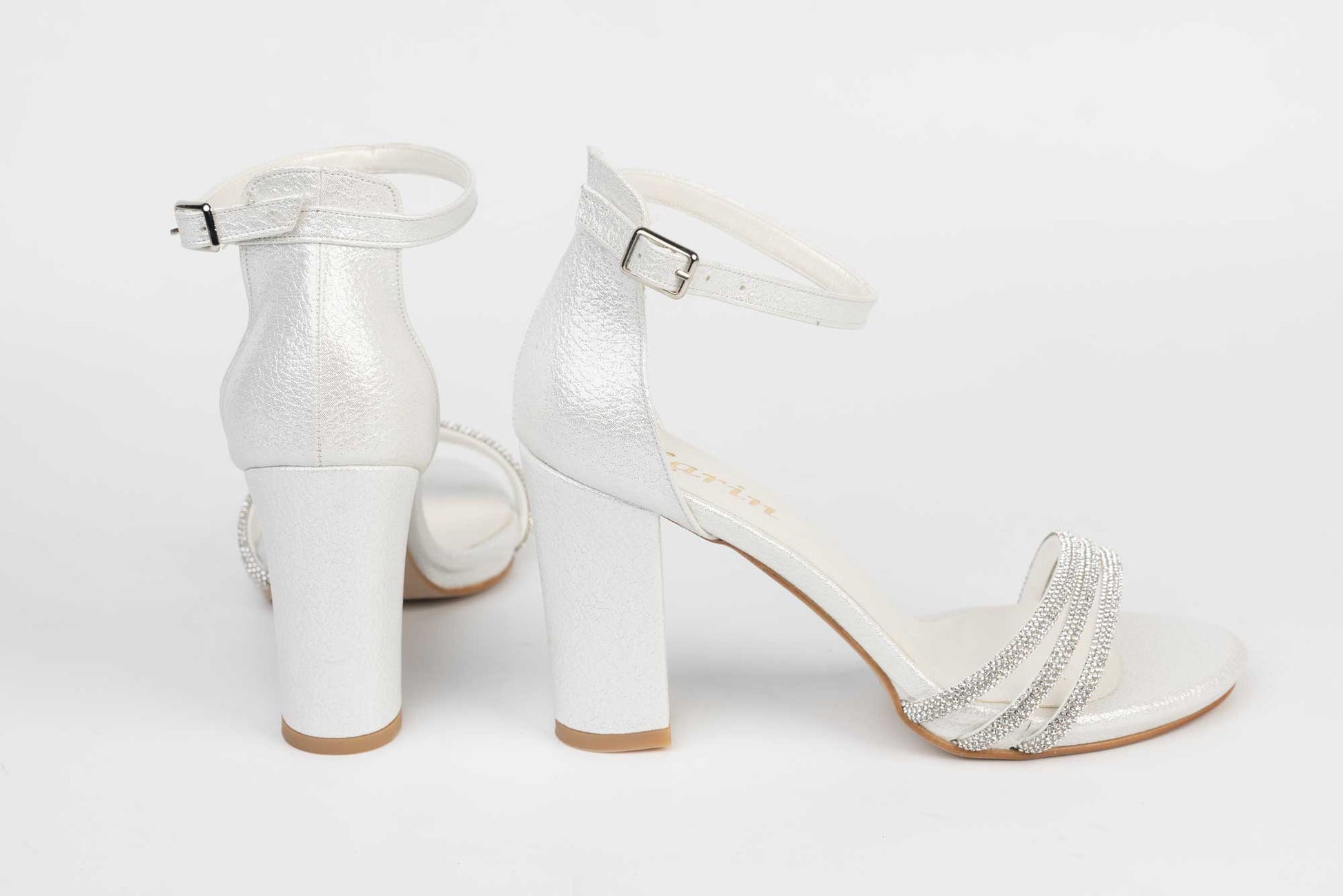 Sandale mireasa KARIN din piele ecologica de calitate preminm avand un toc gros de 7 cm inaltime. Greutatea unui singur picior este 218 grame. Prinderea se face cu o bareta deasupra gleznei pentru o fixare mai buna a piciorului. Partea din fata este alcatuita din 3 barete cu cristale care face aceasta sandala sa fie una foarte eleganta si comoda.