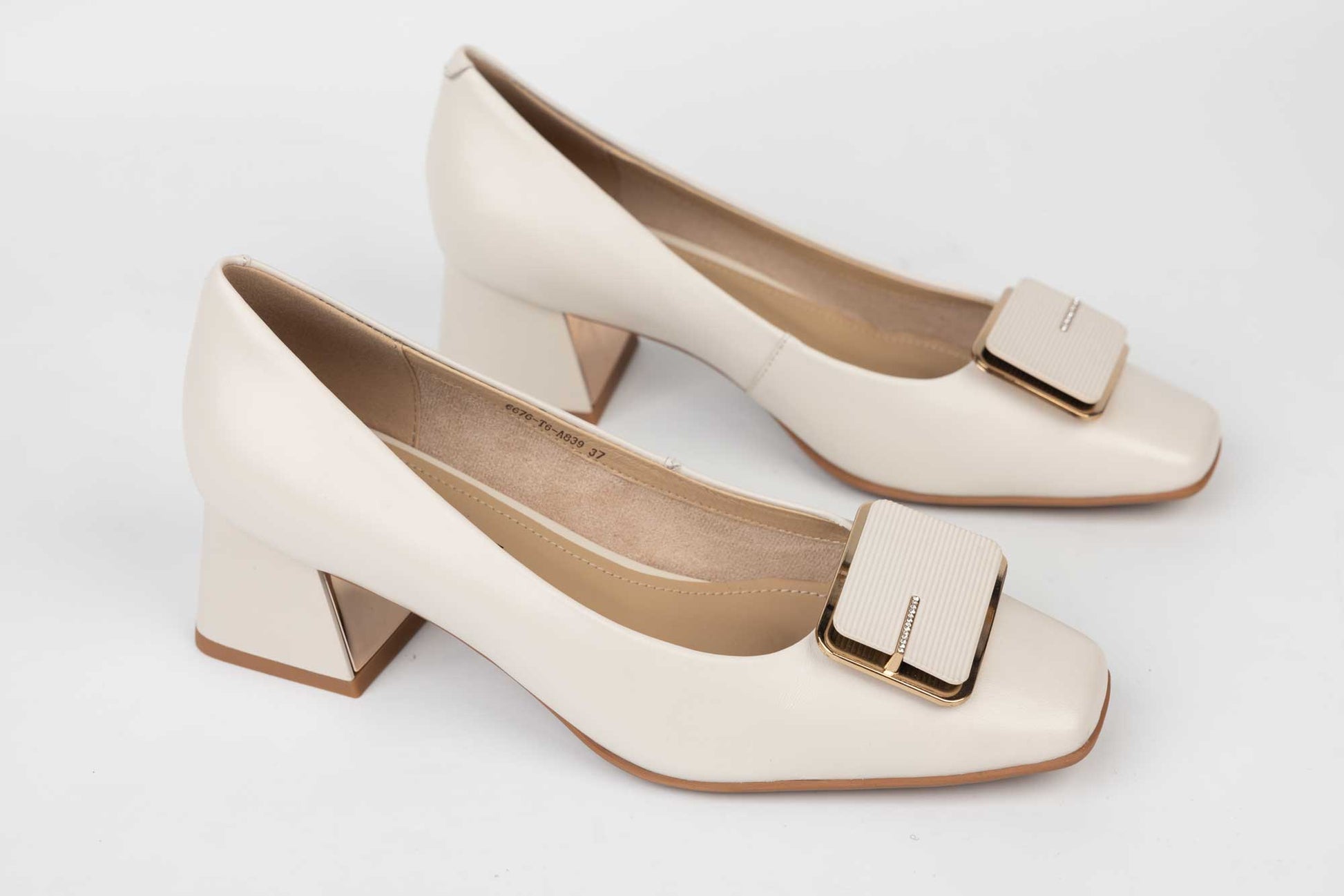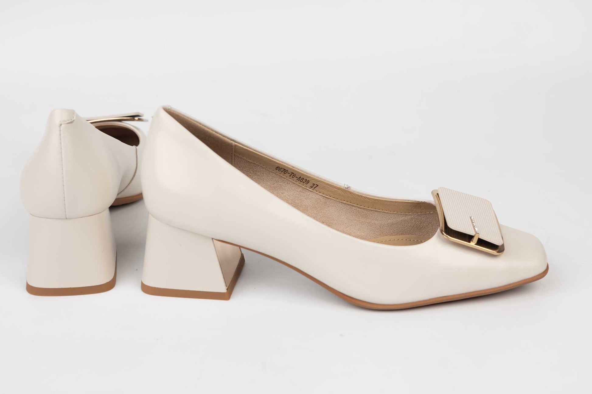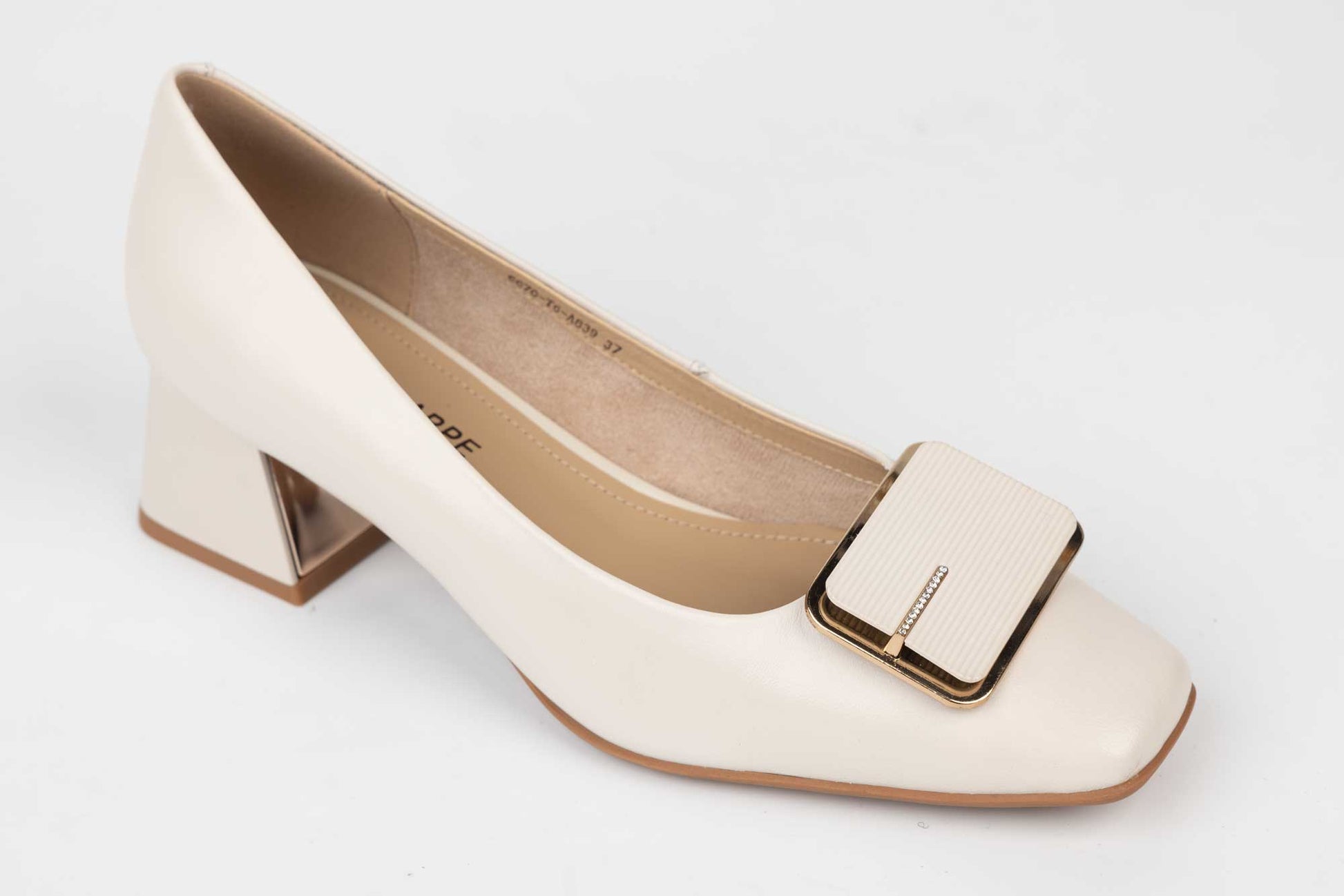 Pantofi BETINA de dama din piele naturala cu toc patrat de 4 cm inaltime si e accesorizat pe varf . Pielea este foarte moale si ofera maximum de confort la purtare indelungata, Talpa este usoara, flexibila iar pe interior detine un brant cu memory. Greutatea unui singur picior este de 190 grame.