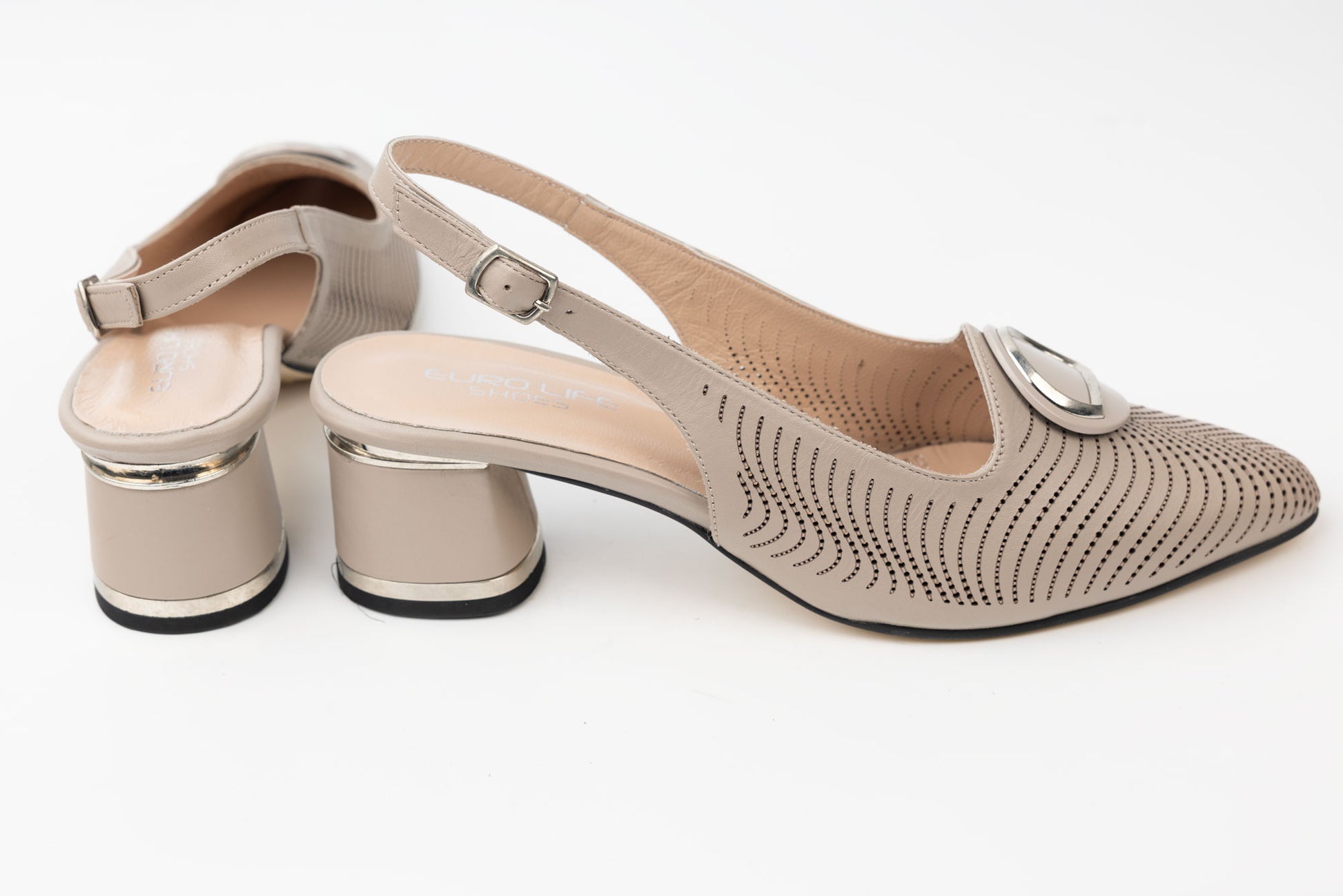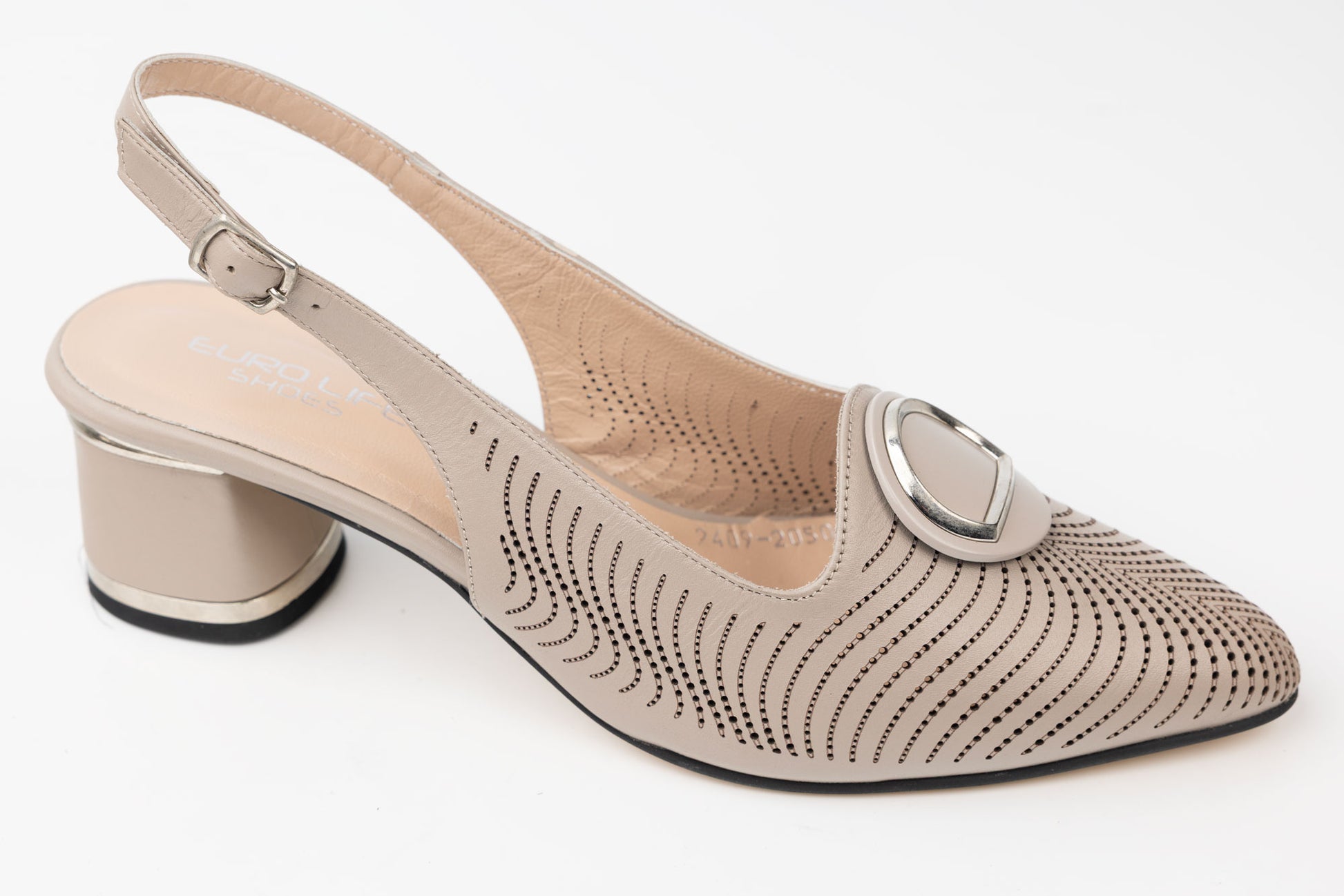 Pantofi LSD de dama decupați din piele naturala cu toc rotunjit de 6 cm inaltime. Pielea este foarte moale si ofera maximum de confort la purtare indelungata, talpa este usoara, iar pe interior deține un branț din piele, având un calapod lat XL special pentru picioare late sau cu mont. Greutatea unui singur picior este de 250 grame.