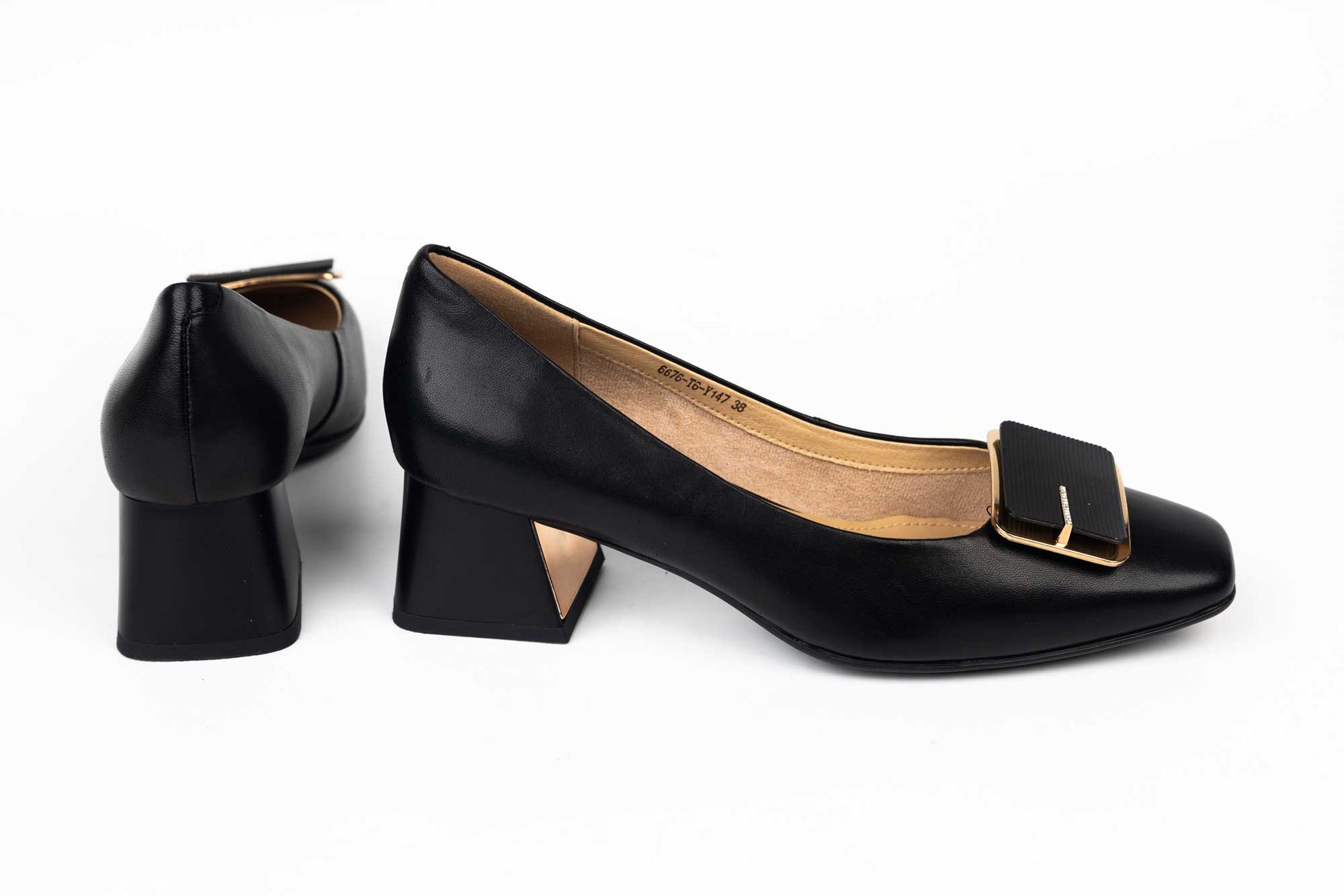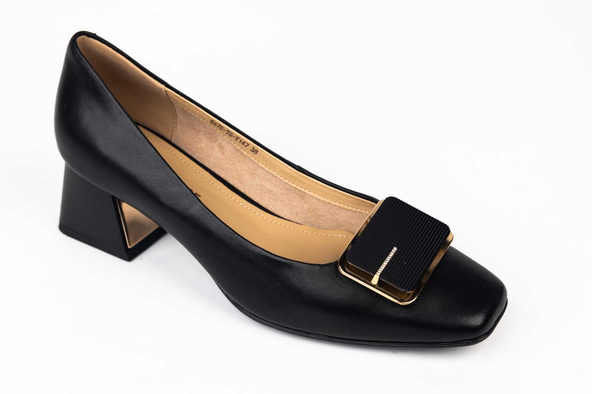 Pantofi BETINA de dama din piele naturala cu toc patrat de 4 cm inaltime si e accesorizat pe varf . Pielea este foarte moale si ofera maximum de confort la purtare indelungata, Talpa este usoara, flexibila iar pe interior detine un brant cu memory. Greutatea unui singur picior este de 190 grame.