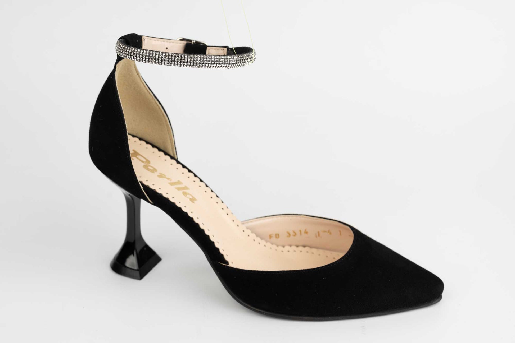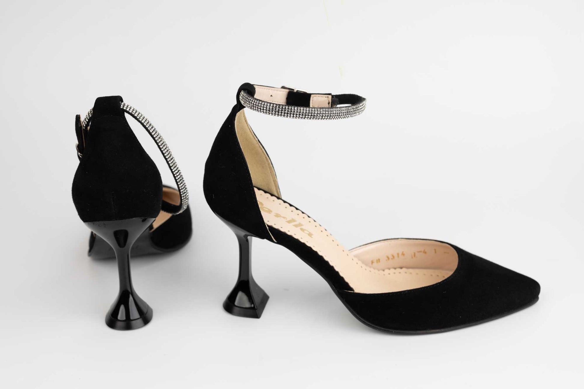 Pantofi PERLA de dama din piele naturală decupați la mijloc cu prindere cu bareta de cristale intr-o catarama finuța, având un toc subtire evazat cu înălțimea de 8 cm oferind piciorului înclinația potrivită pentru mers și stabilitate. Greutatea unui singur picior este de 230 grame.