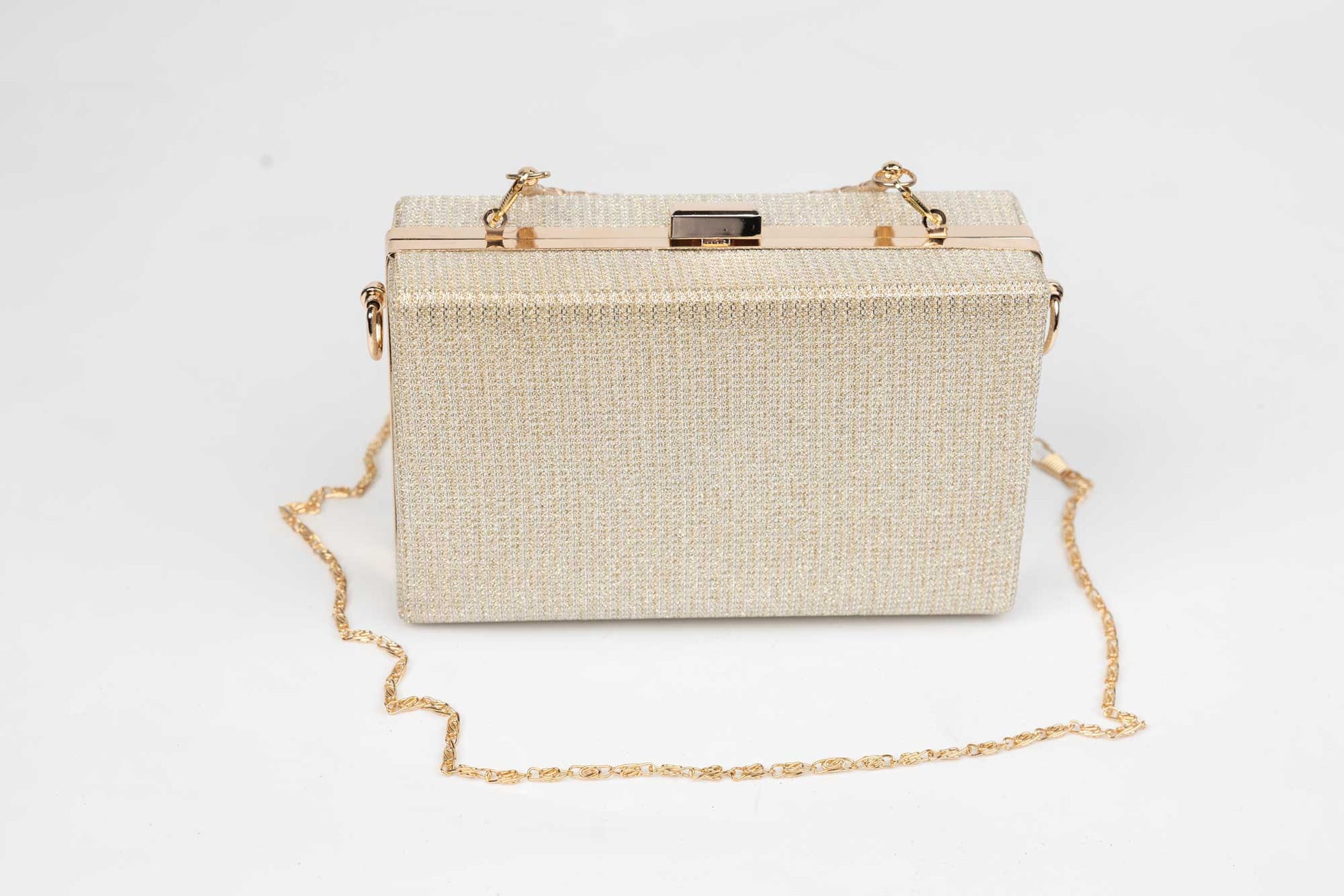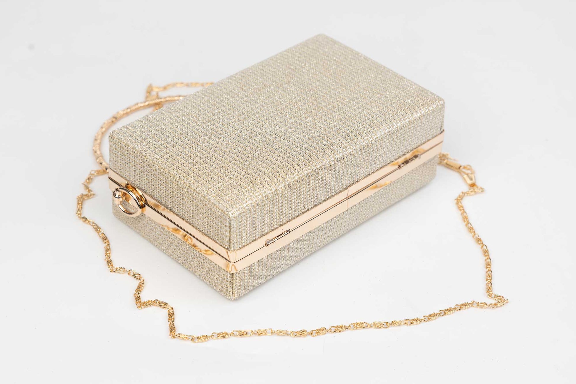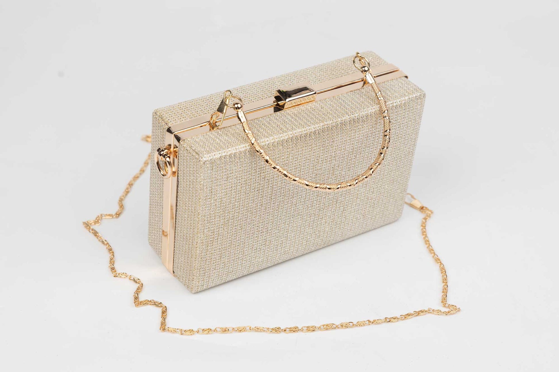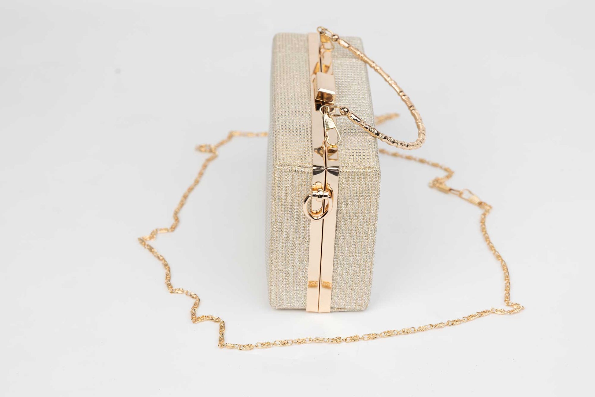 Un plic de dama de marime 18-11 cm din material auriu avand in dotare un maner metalic si o curelusa lant metalica detasabila. Interiorul este bicameral (2 compartimente) si este potrivit si incapator pentru un telefon sau cosmetice. Inchiderea se face cu o clapeta metalica in partea de sus a plicului.