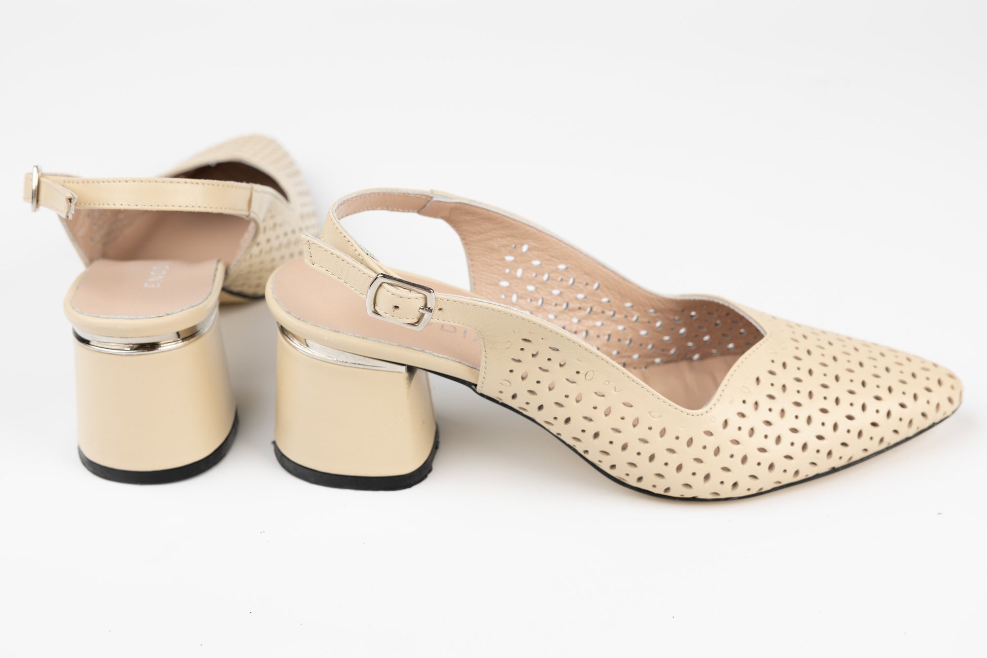 Pantofi LSD de dama decupați din piele naturala cu toc rotunjit de 6 cm inaltime. Pielea este foarte moale si ofera maximum de confort la purtare indelungata, talpa este usoara, iar pe interior deține un branț din piele, având un calapod lat XL special pentru picioare late sau cu mont. Greutatea unui singur picior este de 250 grame. Mărimi de la 36 pana la 40.