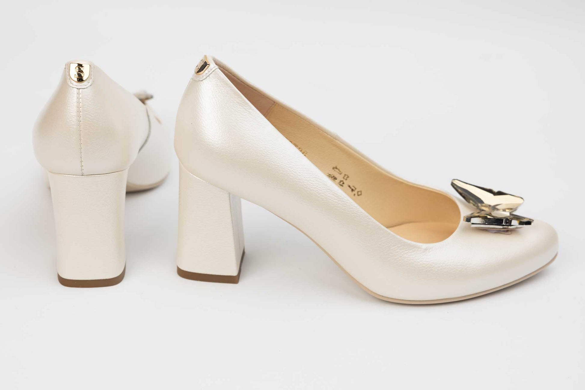 Pantof SALA cu toc patrat cu insertie accesoriu auriu, este un model clasic si simplu, confectionat din piele naturala de vitel moale la atingere, ofera un confort sporit datorita calapodului testat. Usor de purtat , acest model are inaltimea tocului de 7 cm. Greutatea unui singur pantof 280 grame.