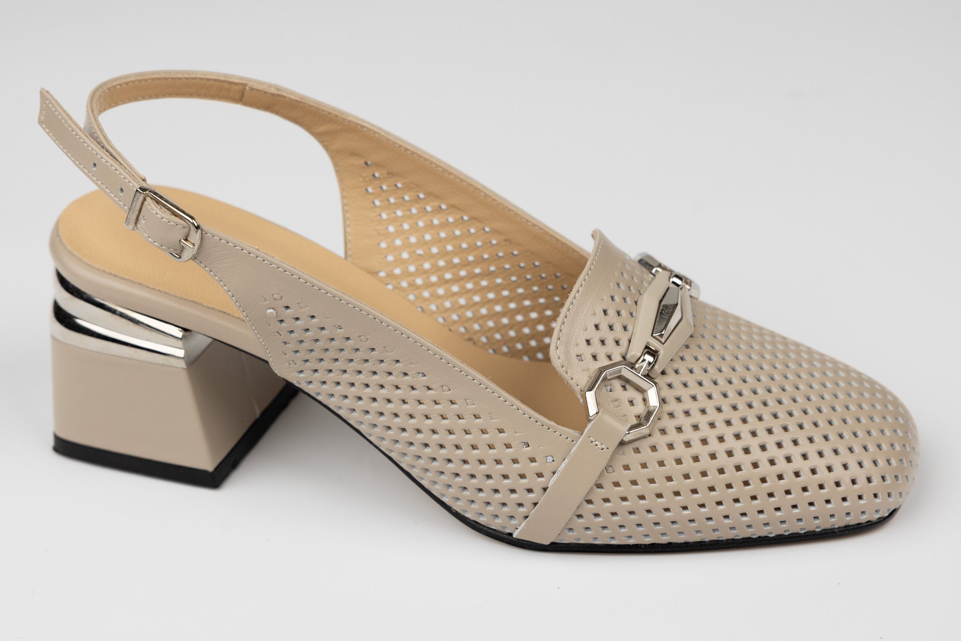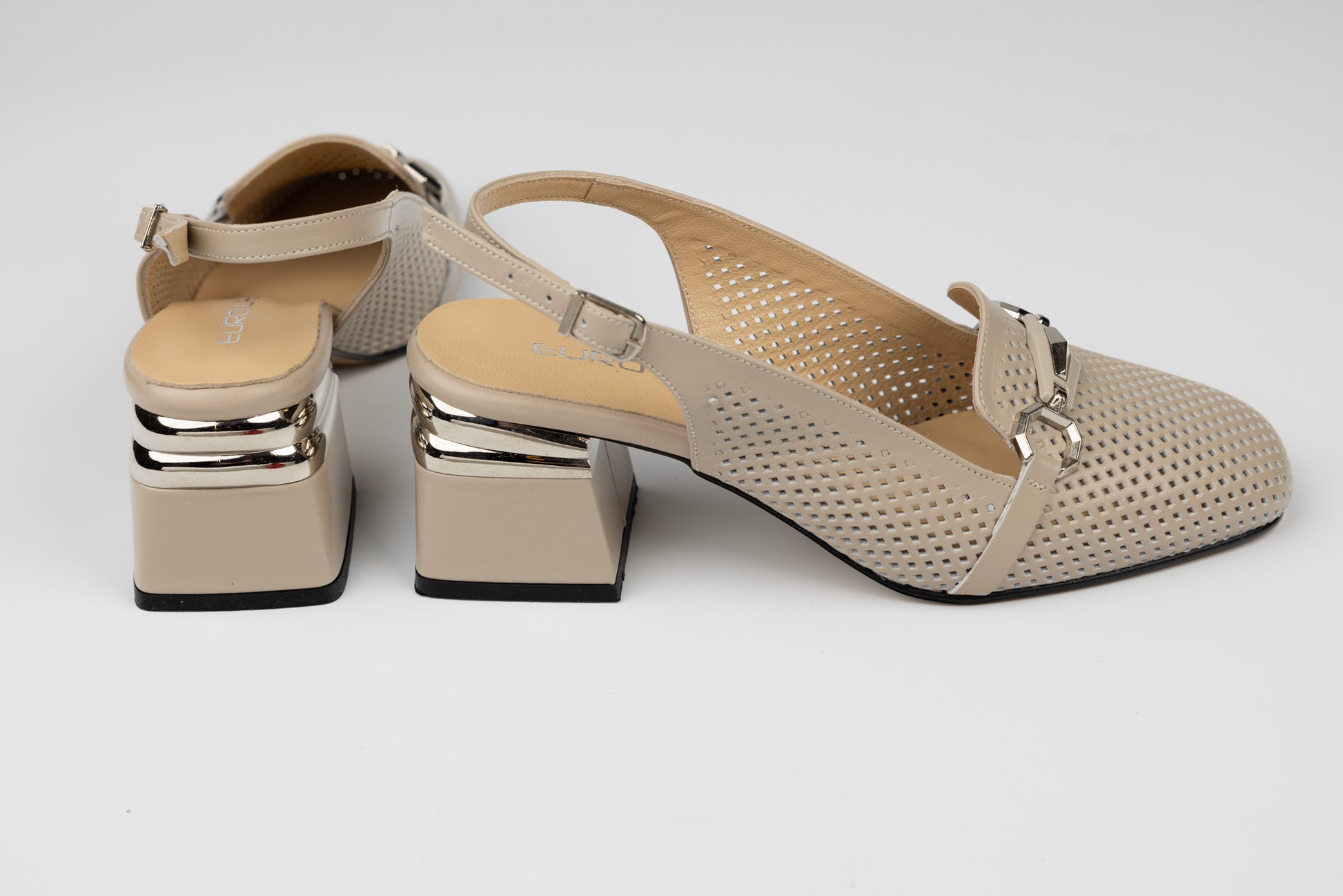 Pantofi LSD de dama decupați din piele naturala cu toc rotunjit de 6 cm inaltime. Pielea este foarte moale si ofera maximum de confort la purtare indelungata, talpa este usoara, iar pe interior deține un branț din piele, având un calapod lat XL special pentru picioare late sau cu mont. Greutatea unui singur picior este de 250 grame. Mărimi de la 36 pana la 40.