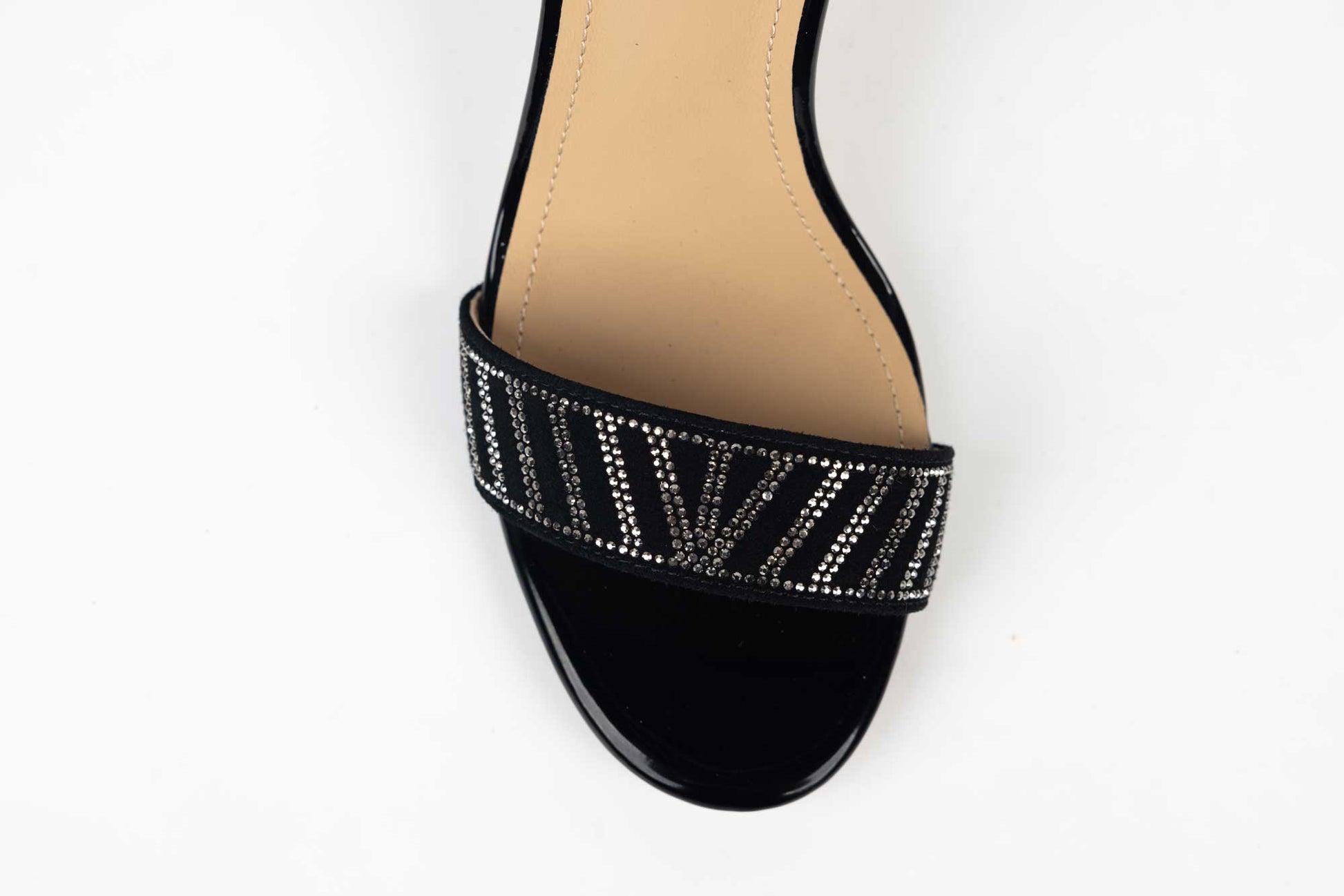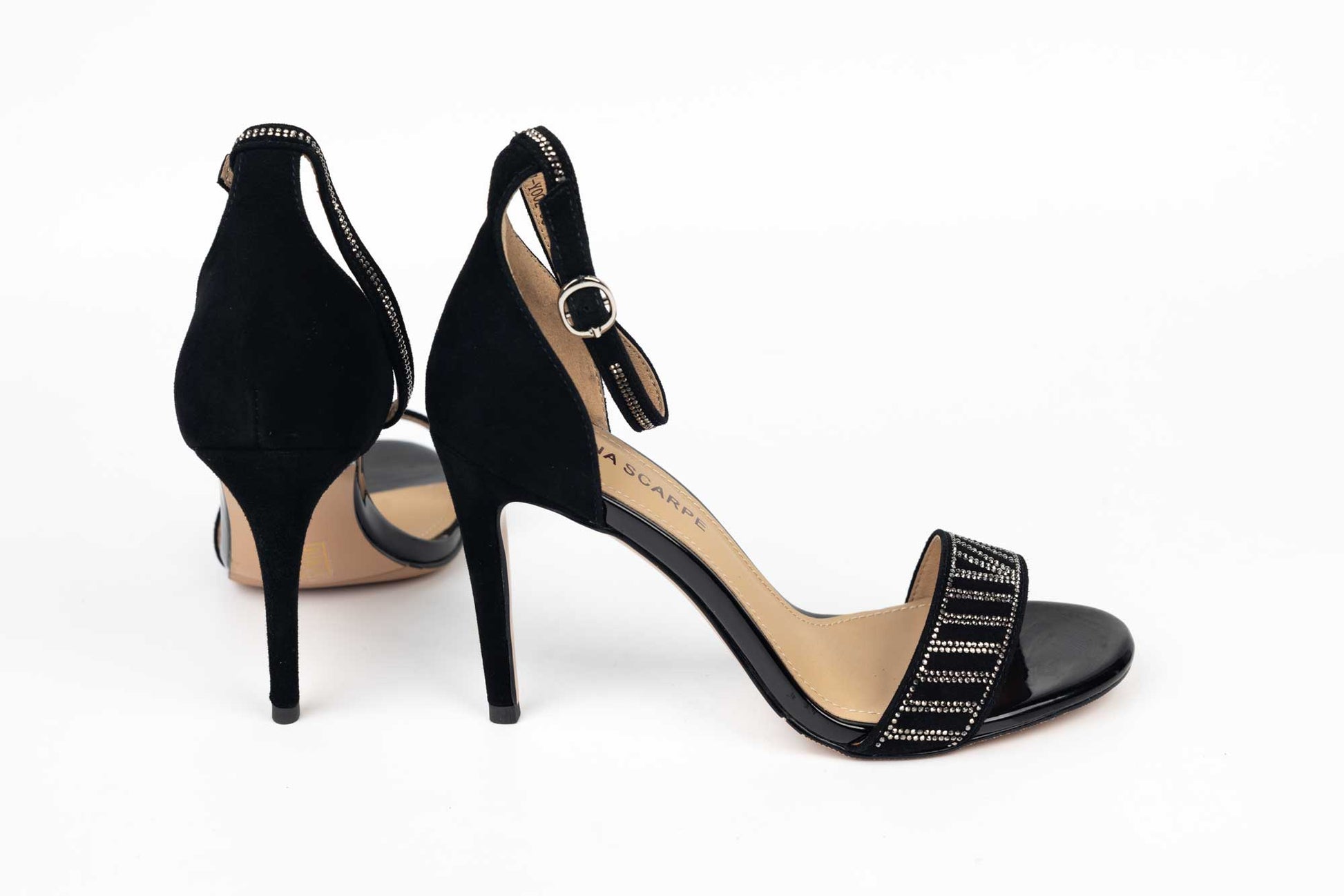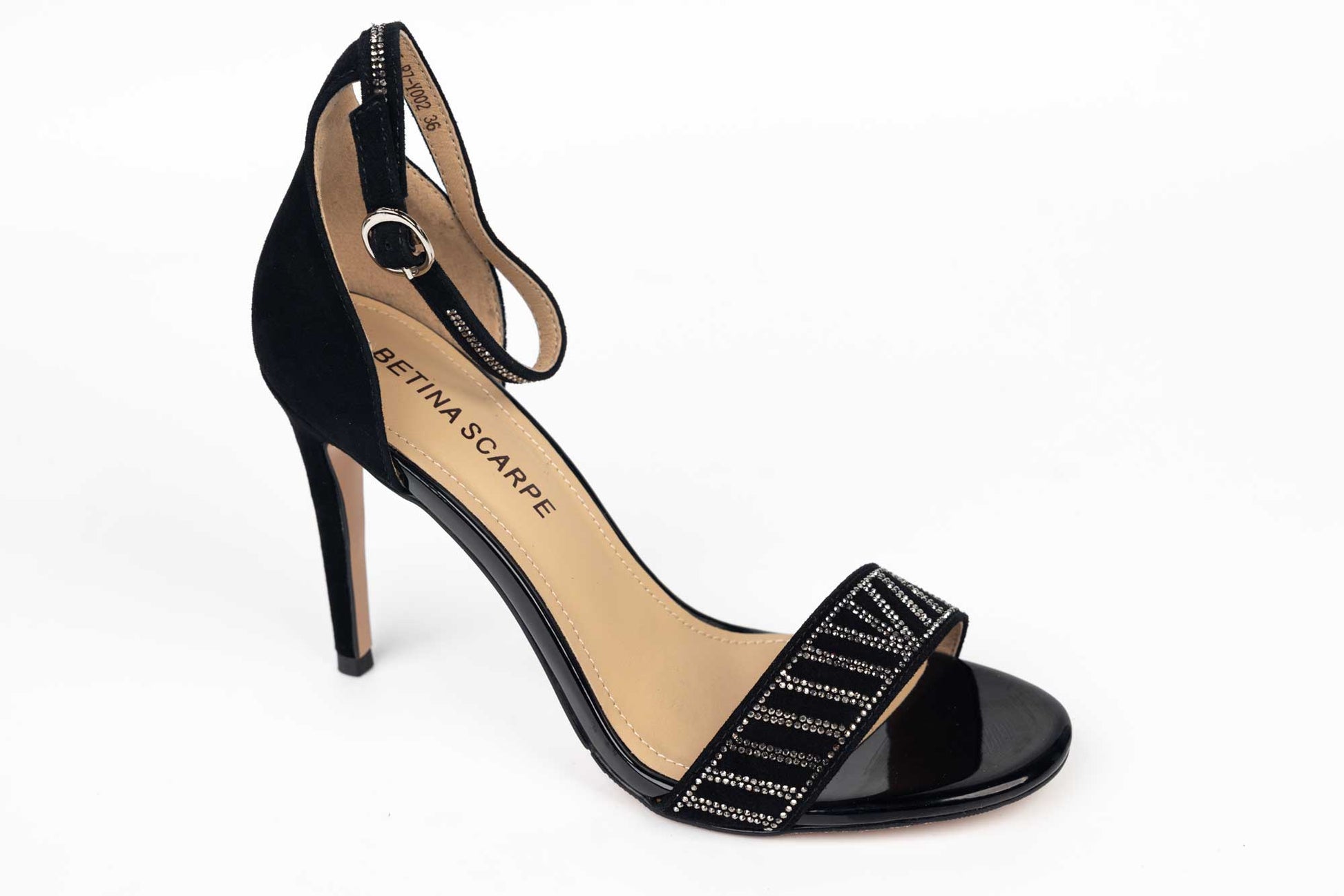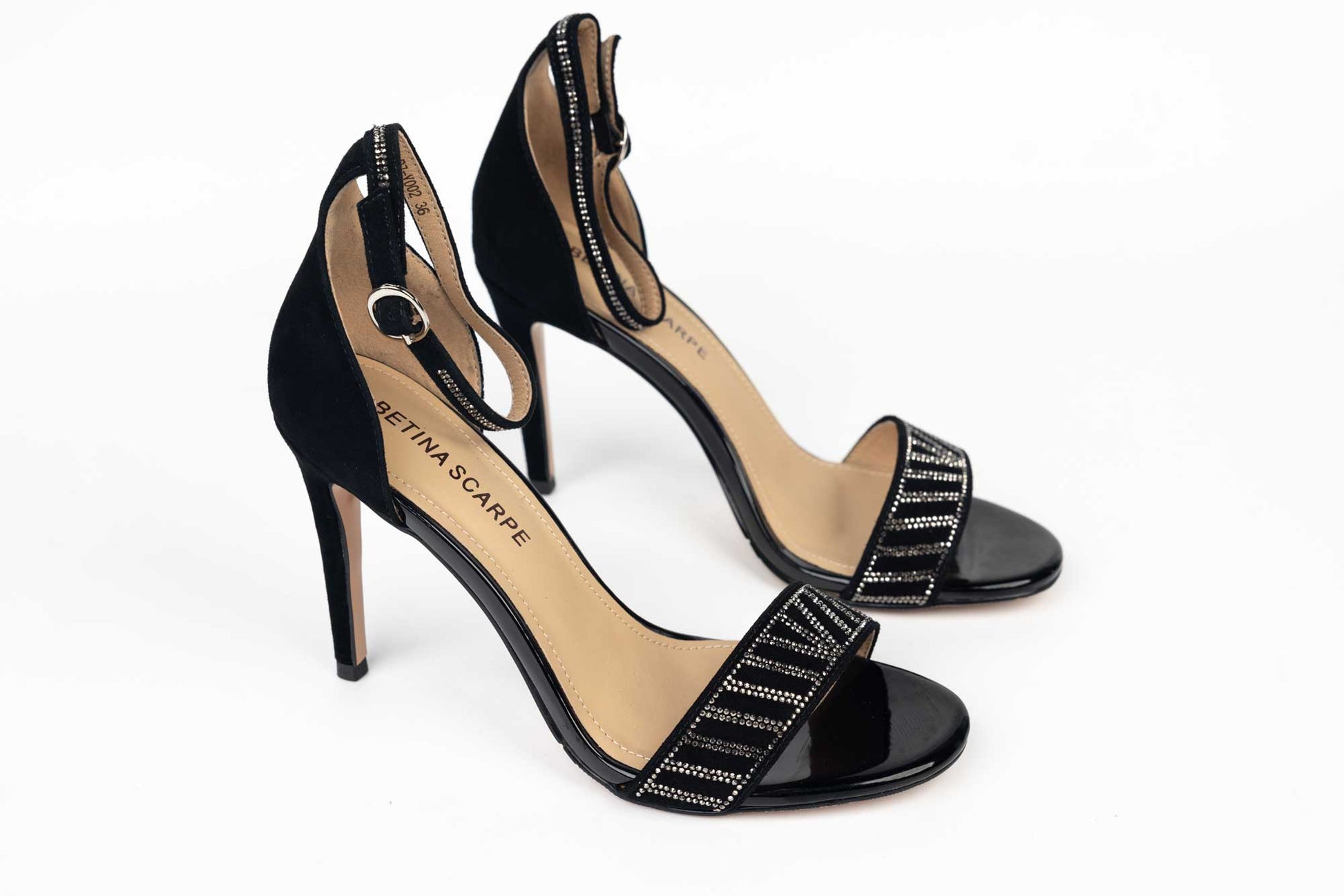 Sandale BETINA de dama din piele naturală întoarsă accesorizat cu cristale pe bareta din fata având prindere intr-o bareta subțire. Tocul la aceasta sandaluta este de 9 cm iar greutatea unui singur picior este 190 grame.