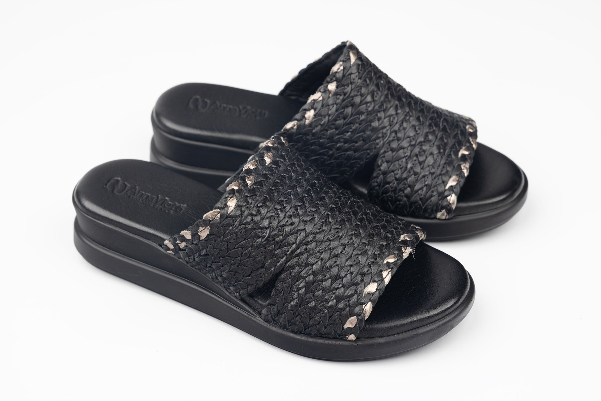 Șlapi ANNA VIOTI de dama din piele naturala cu talpa ortopedică de 3,5 cm cu 1 bareta cu reglaj într~un scai pe laterală piciorului . Greutatea unui singur picior este de 280 grame. Marimi de la 36 - 40.