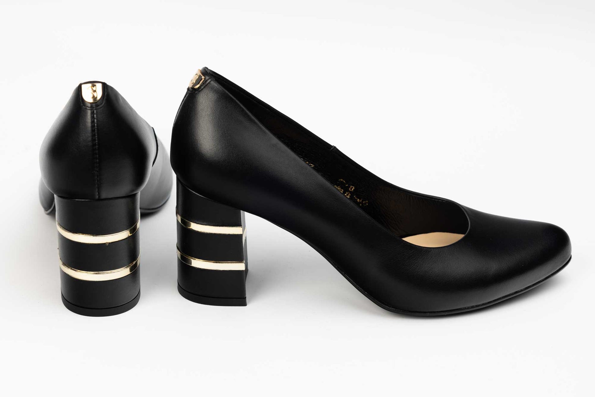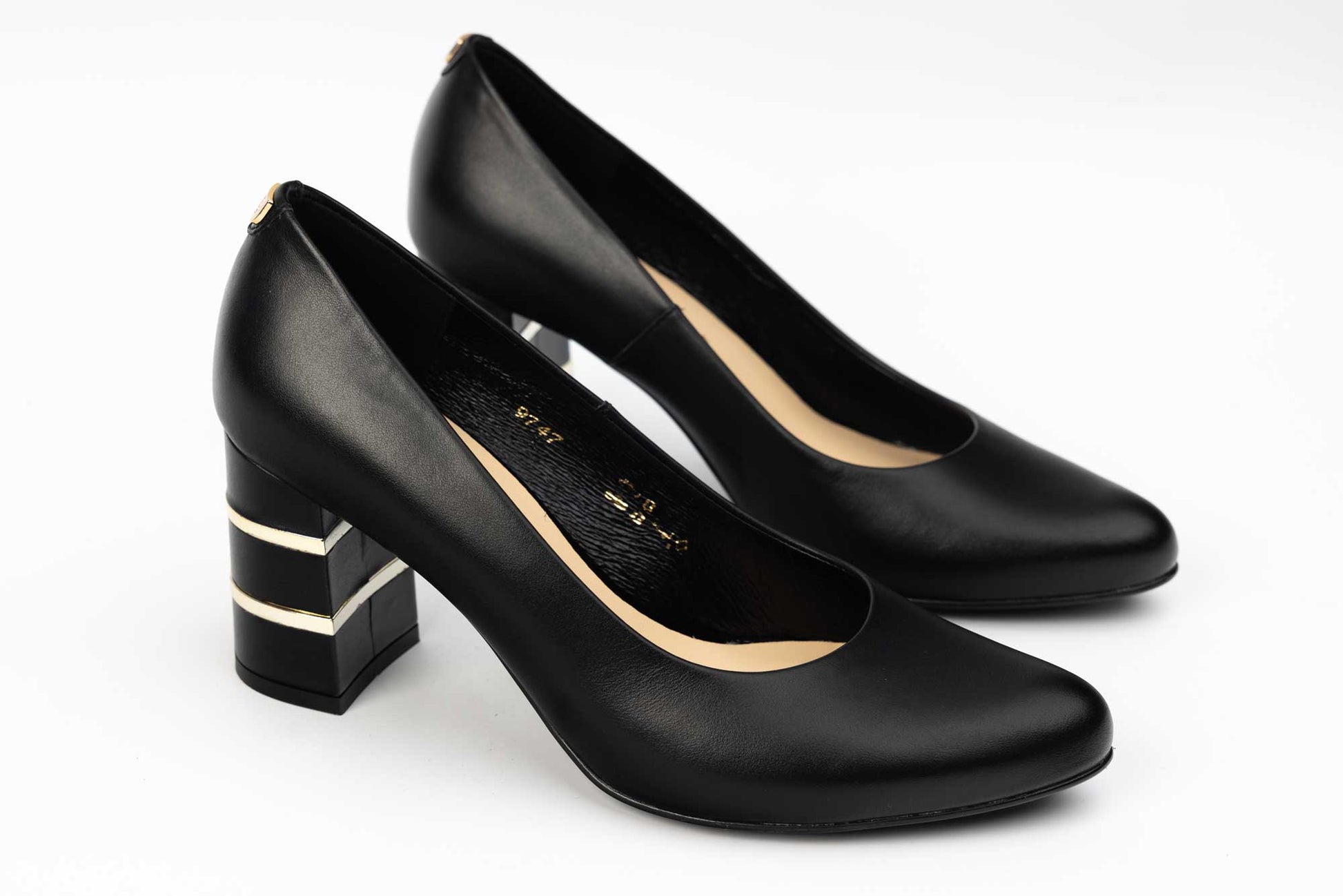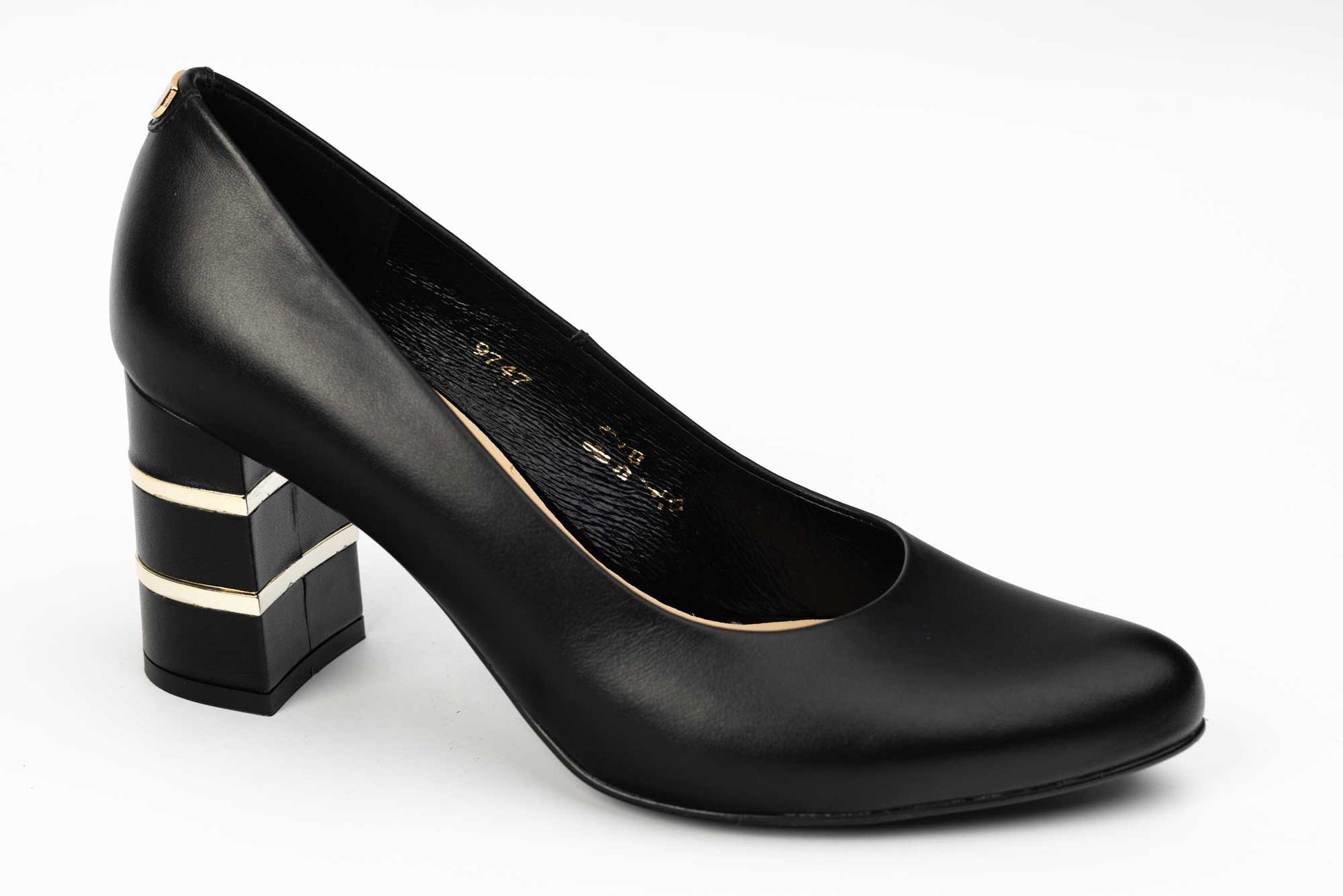Pantof SALA cu toc patrat cu insertie accesoriu auriu, este un model clasic si simplu, confectionat din piele naturala de vitel moale la atingere, ofera un confort sporit datorita calapodului testat. Usor de purtat , acest model are inaltimea tocului de 7 cm. Greutatea unui singur pantof 210 grame.