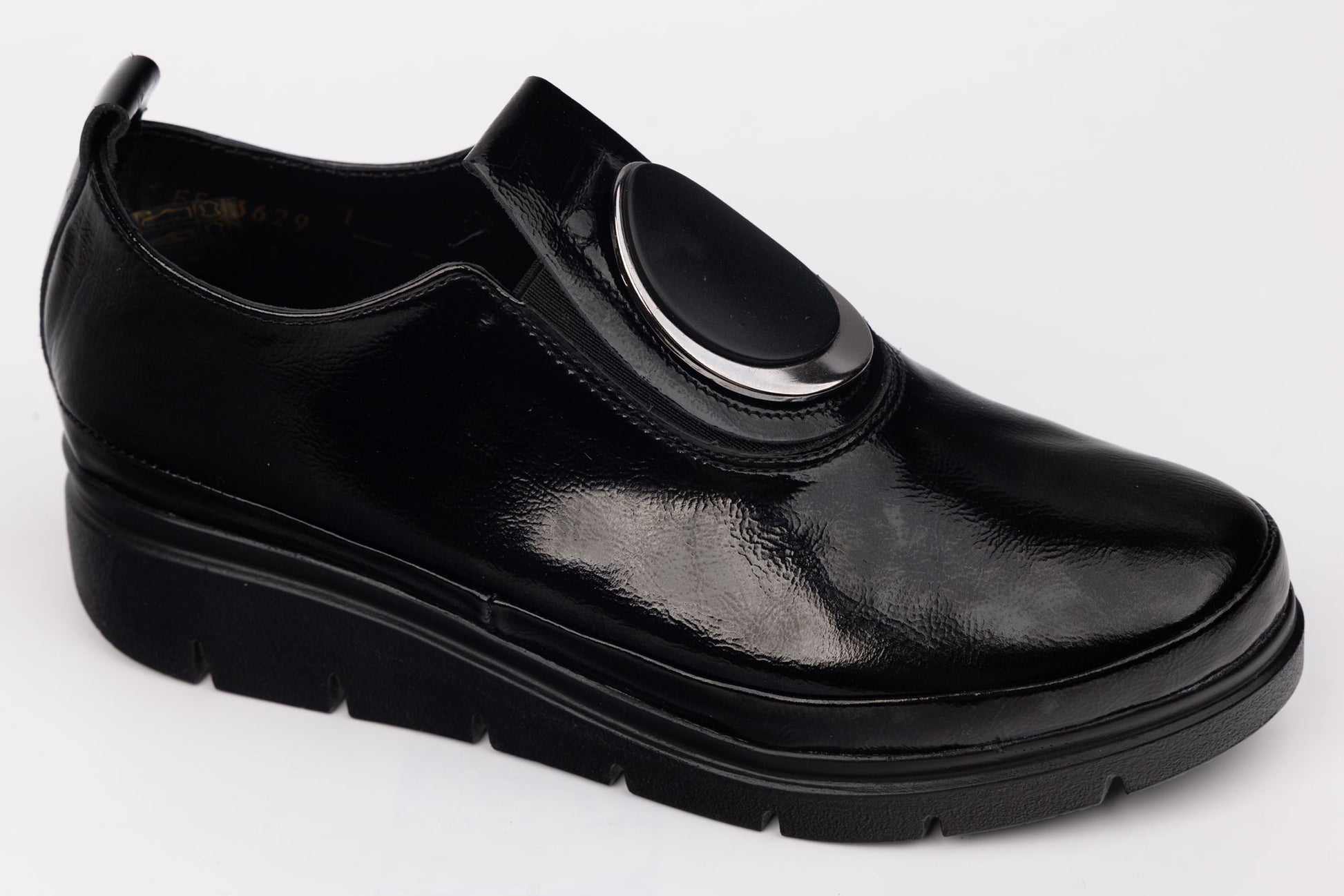 Pantofi damă PERLA din piele naturală lăcuită având elastice pe laterale și o talpă turnata ușoară ce oferă maximul de confort la purtare îndelungată și este construit pe un calapod lat.