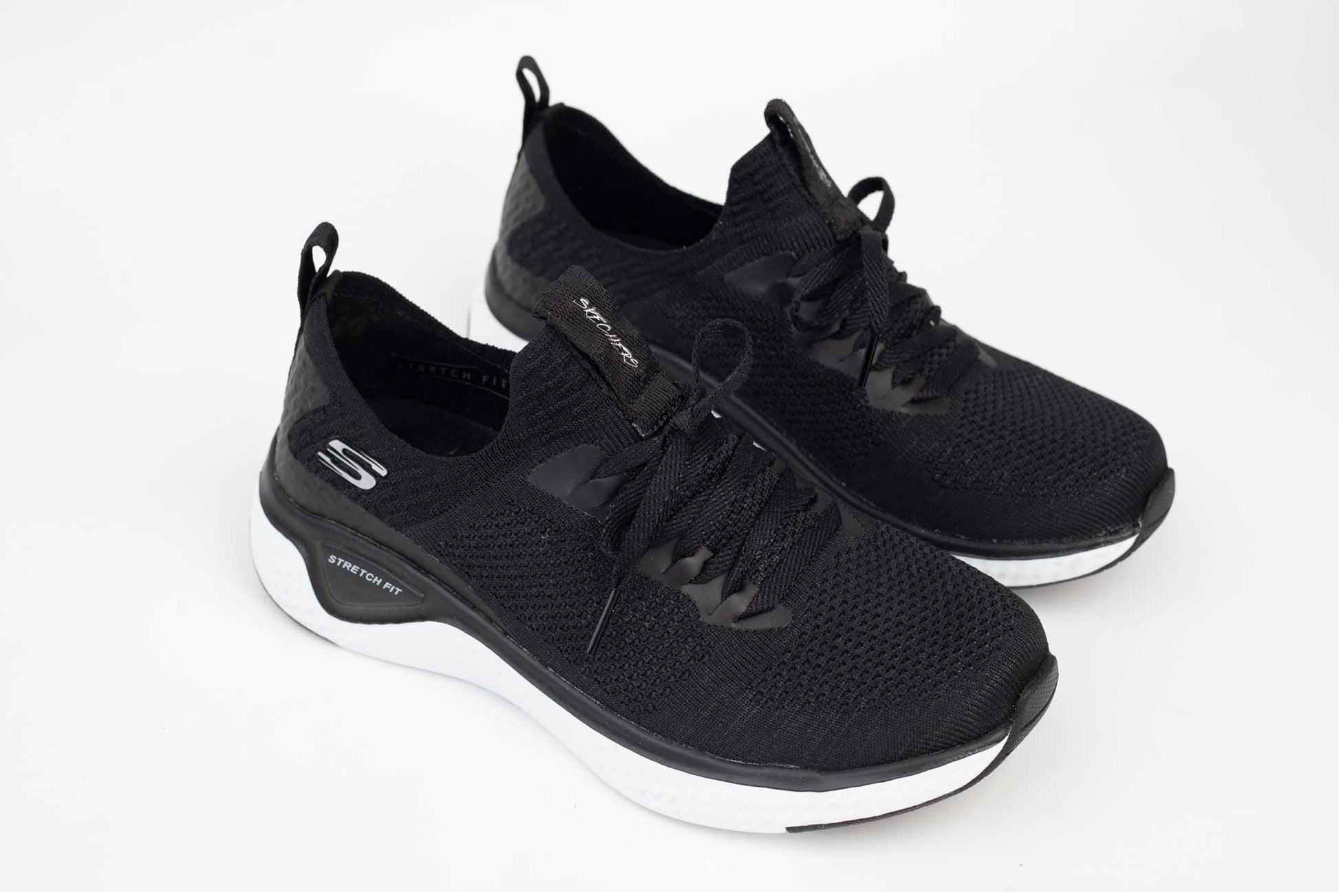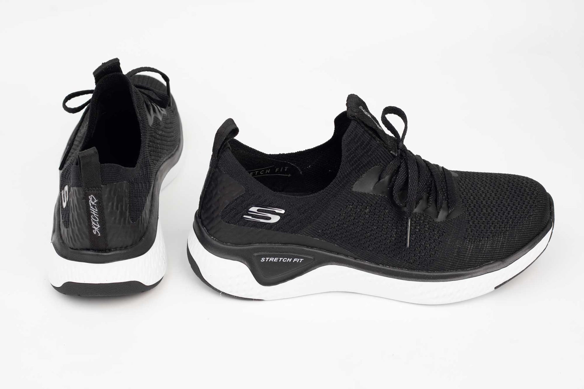 Adidasi dama SKECHERS din material textil de calitate premium cu talpa groasa de 3 cm înălțime care se leagă cu siret având vârful rotunjit. Greutatea unui singur picior este de 190 grame.