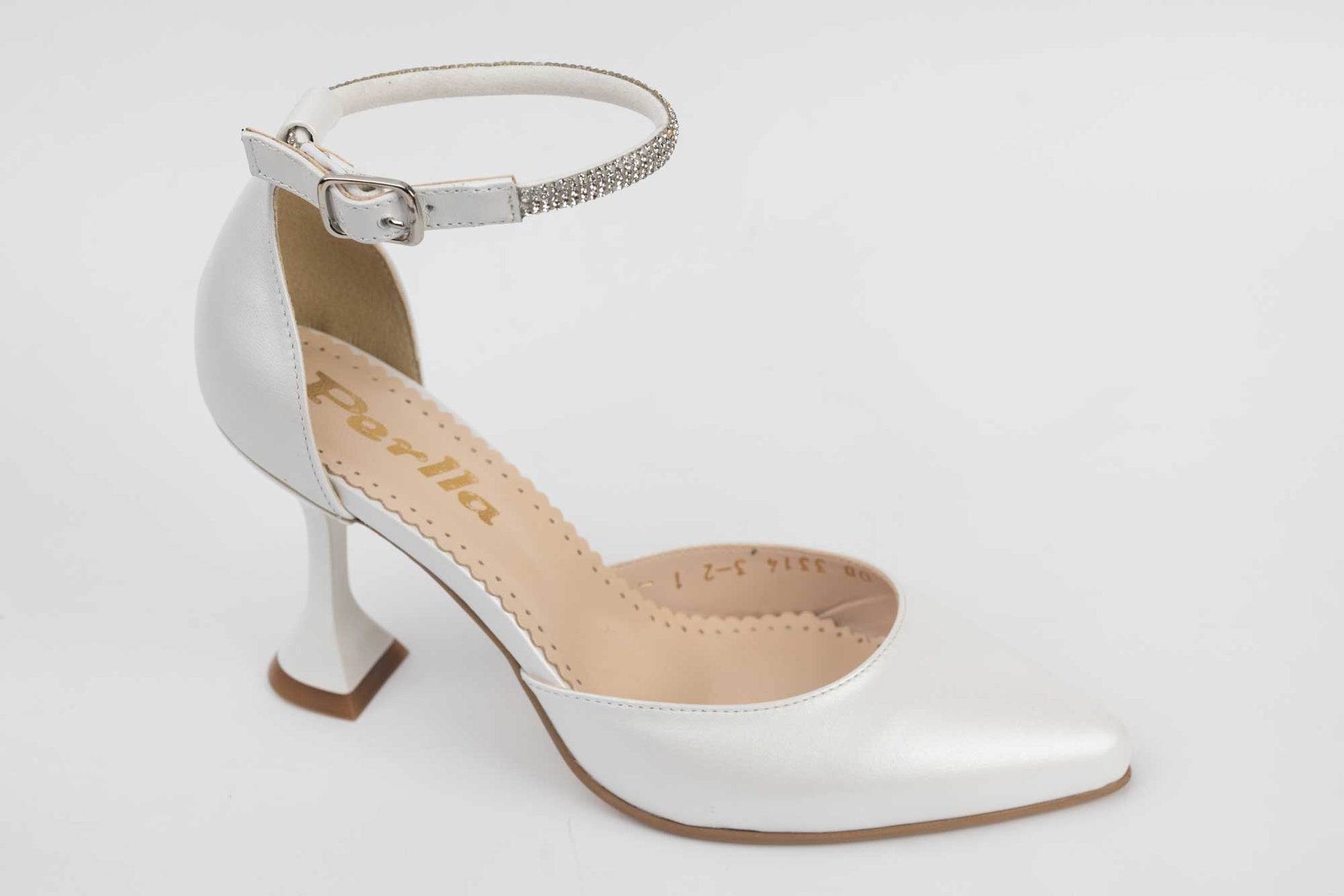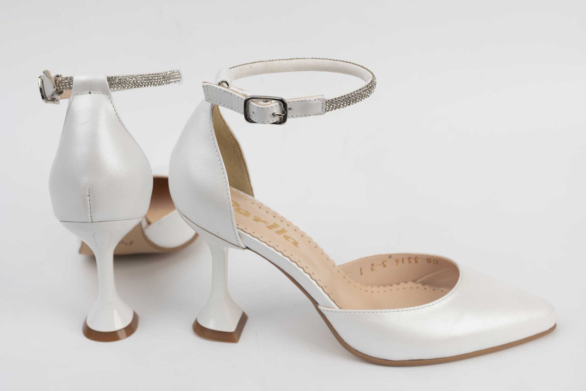 Pantofi mireasa PERLA din piele naturală decupați la mijloc cu prindere cu bareta de cristale intr-o catarama finuța, având un toc subtire evazat cu înălțimea de 8 cm oferind piciorului înclinația potrivită pentru mers și stabilitate. Greutatea unui singur picior este de 230 grame.