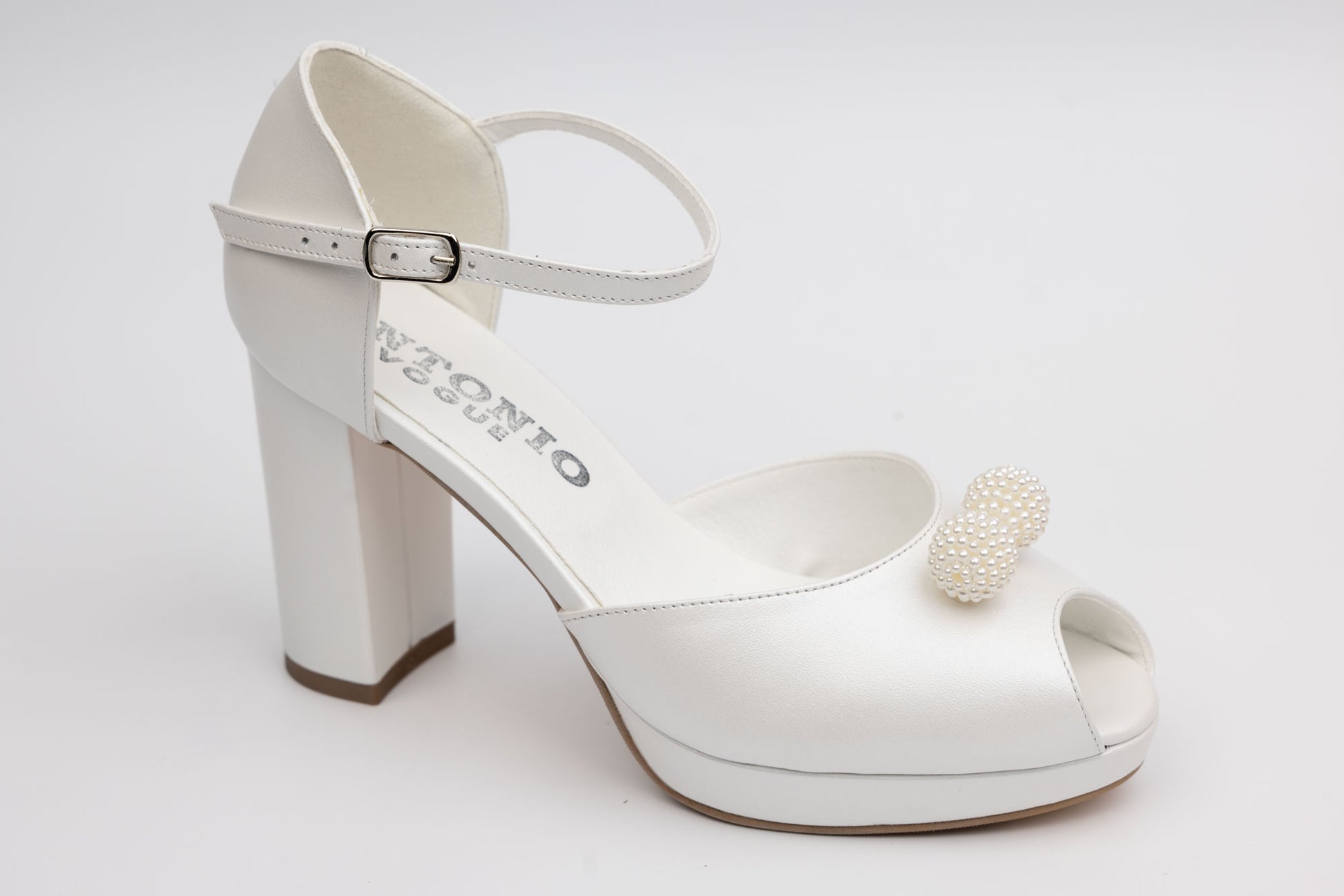 Sandale mireasa ANTONIO din piele naturală cu toc gros de 10 cm înălțime foarte stabil la mers având la partea din fata o platforma de 1 cm înălțime care conferă o înclinație lina și confortabila piciorului. Prinderea baretei se face cu o catarama fina, iar pe fata sandalei este montat un accesoriu dublu mugure.