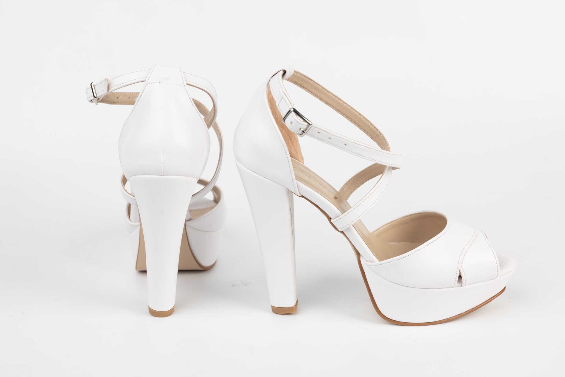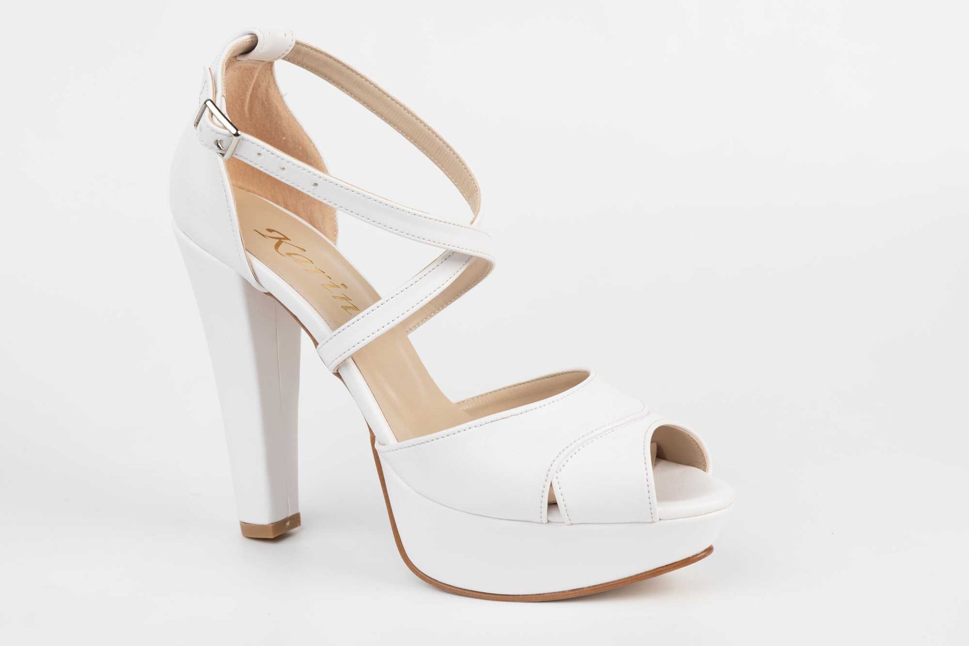 Sandale mireasa KARIN de piele ecologica de calitate premium cu tocul gros de 12 cm inaltime si platforma de 3 cm cu prindere in 2 barete subtiri dispuse in X deasupra gleznei. Greutatea unui singur pantof este de 250 grame.