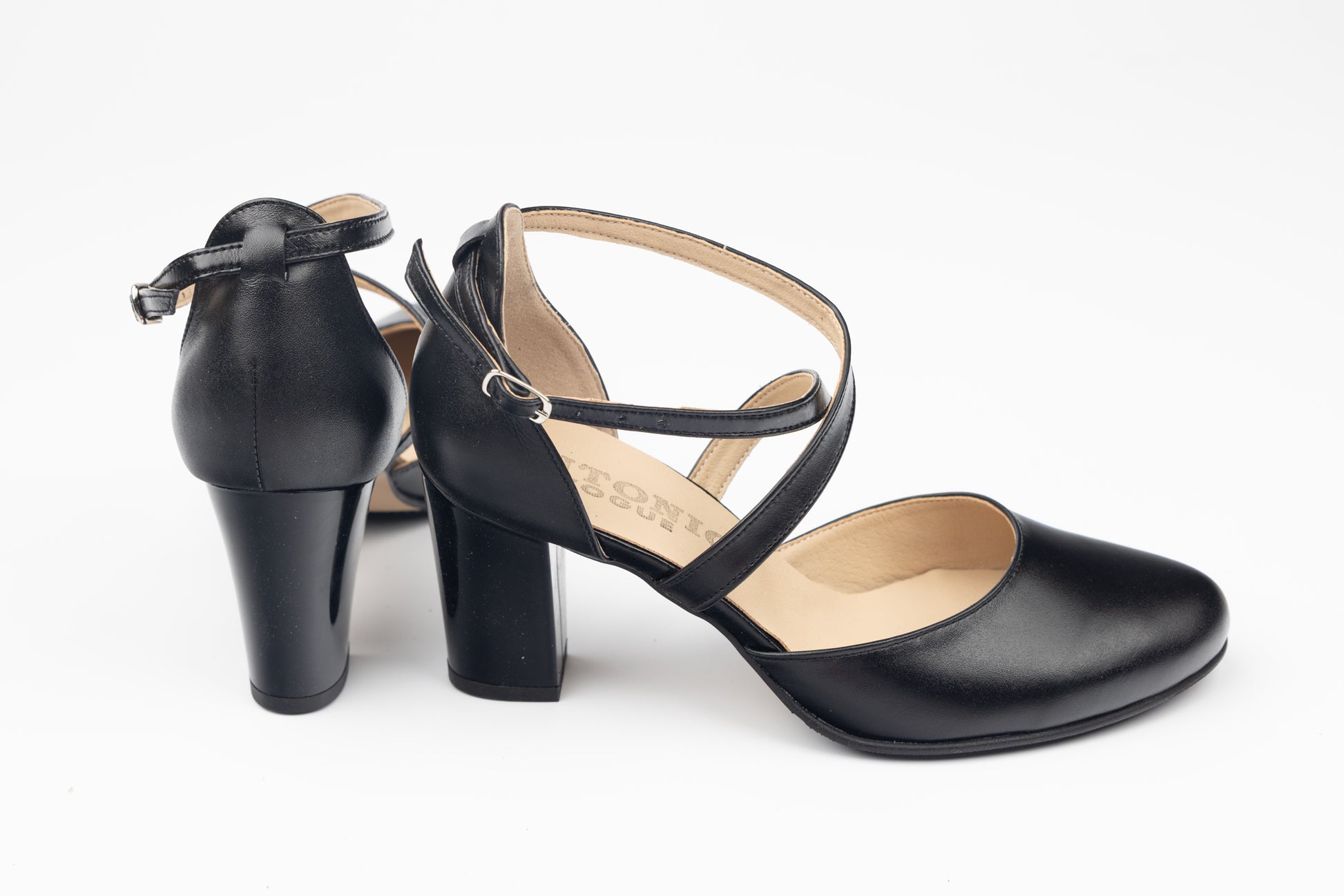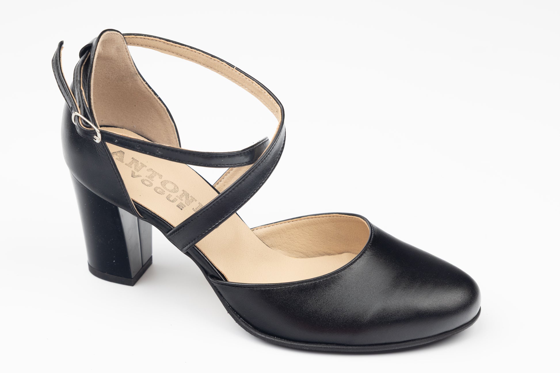 Pantofi ANTONIO de dama din piele naturala cu toc gros de 7 cm inaltime si cu prindere pe picior cu 2 barete in forma de X cu o catarama avand varful rotund. Greutatea unui singur pantof este de 295 grame. Mărimi de la 34 pana la 41.