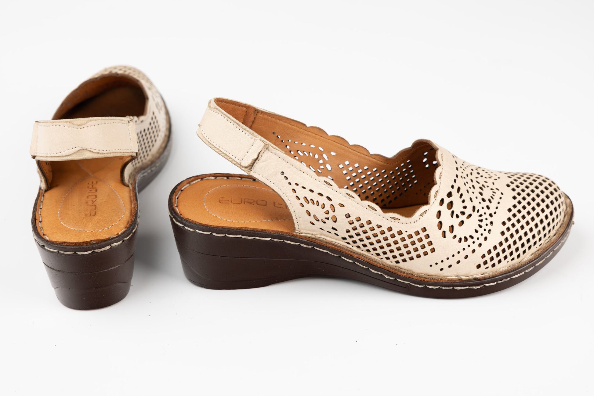Pantofi decupați dama LSD din piele naturala cu talpa groasa ortopedica captusite la interior cu piele naturala avand prinderea cu o bareta in spatele piciorului. Inclinatia lina a piciorului in aceste sandale face mult mai comoda purtarea lor un timp indelungat fiind recomandate chiar si pentru picioare cu mont pentru ca le acopera in intregime. Greutatea unui singur picior este de 250 grame. Mărimi de la 35 pana la 42.